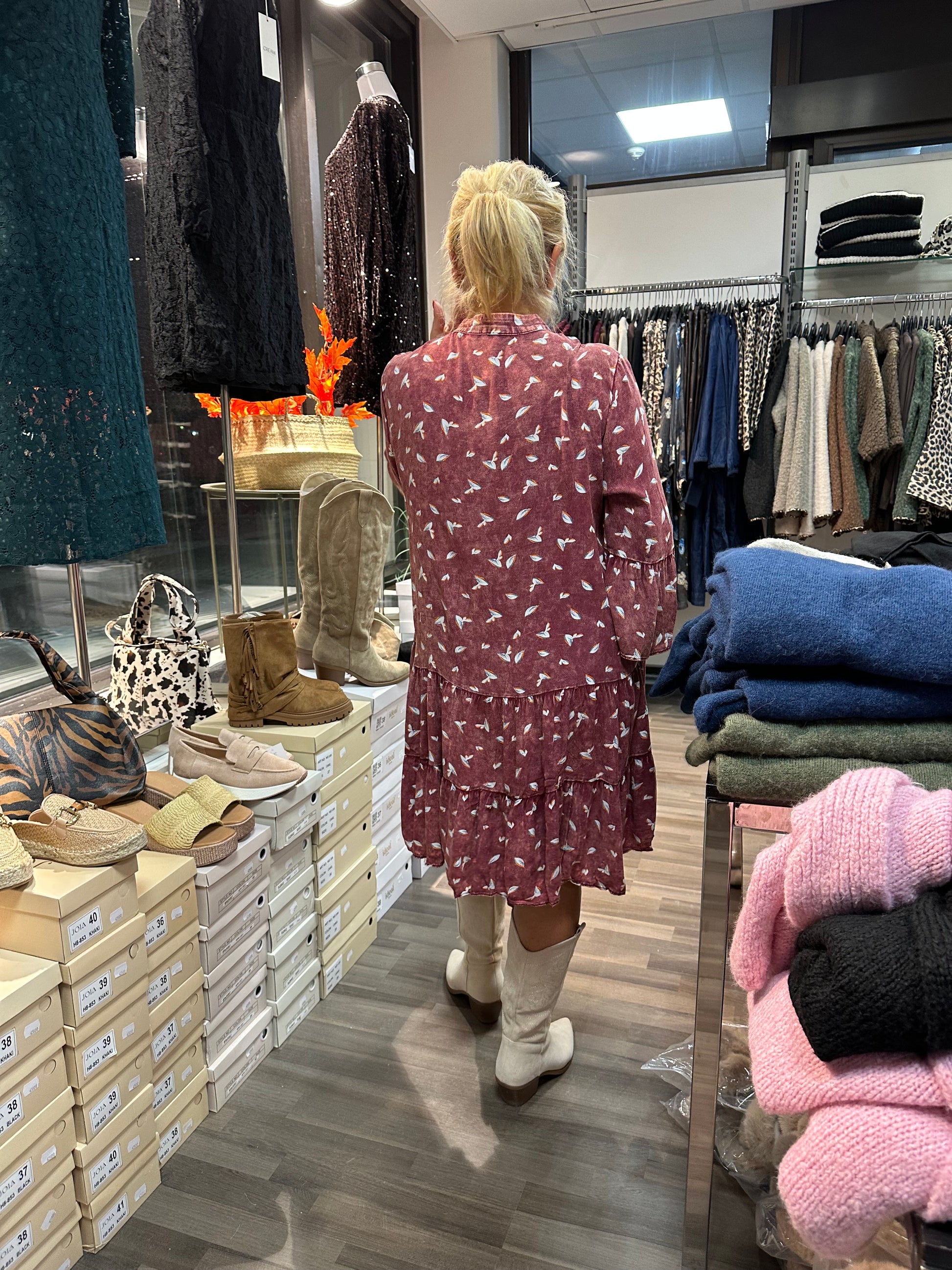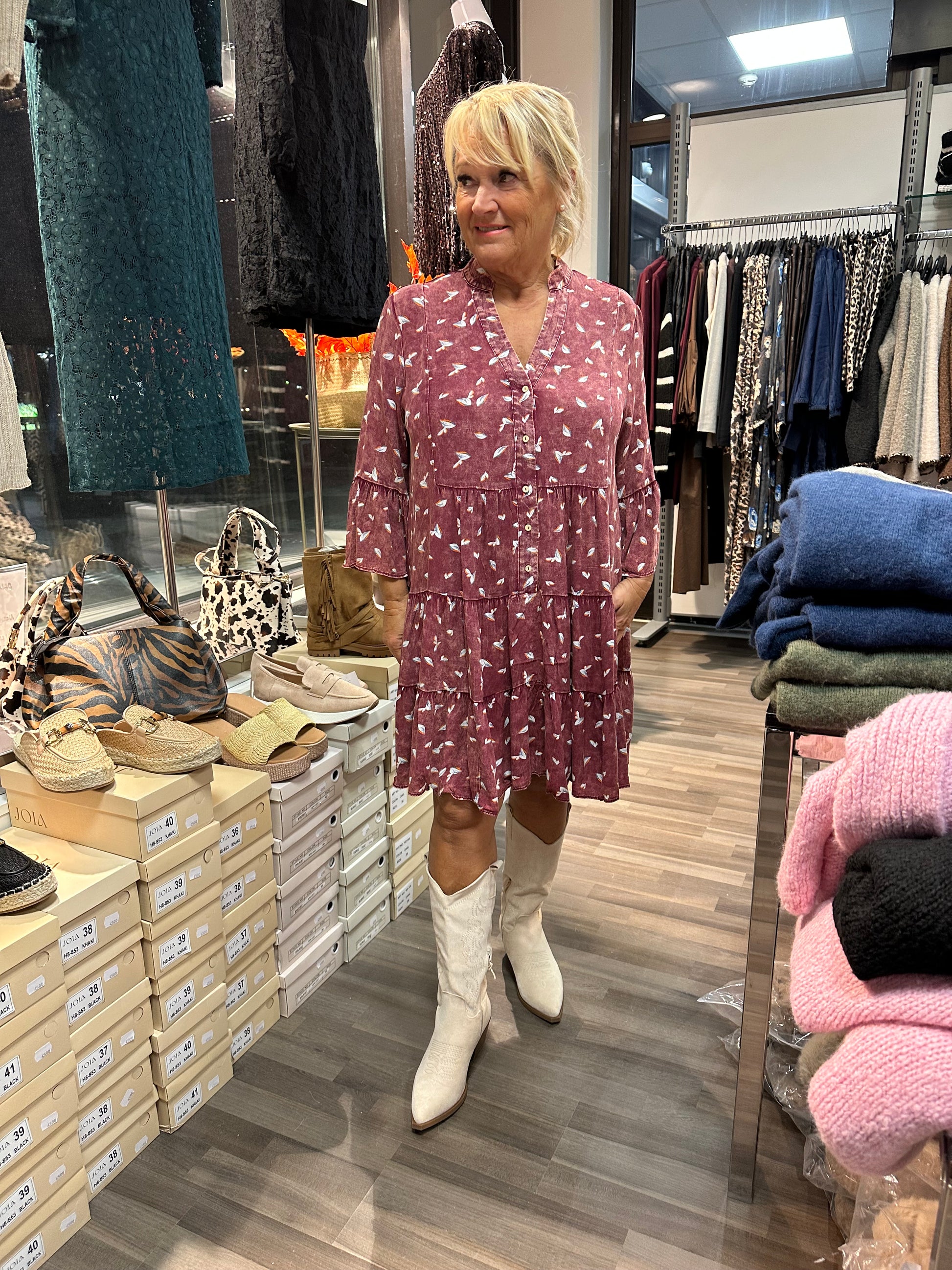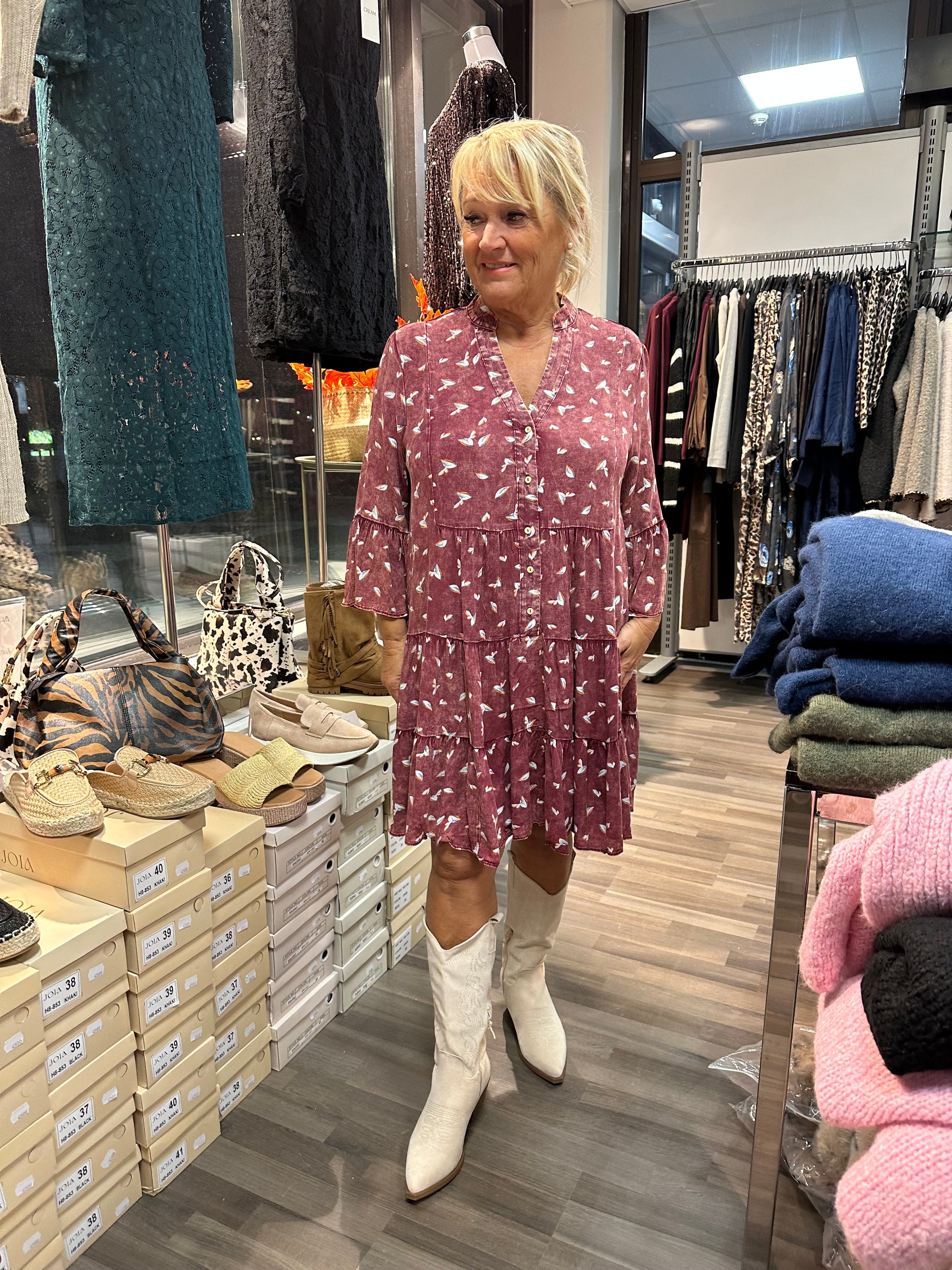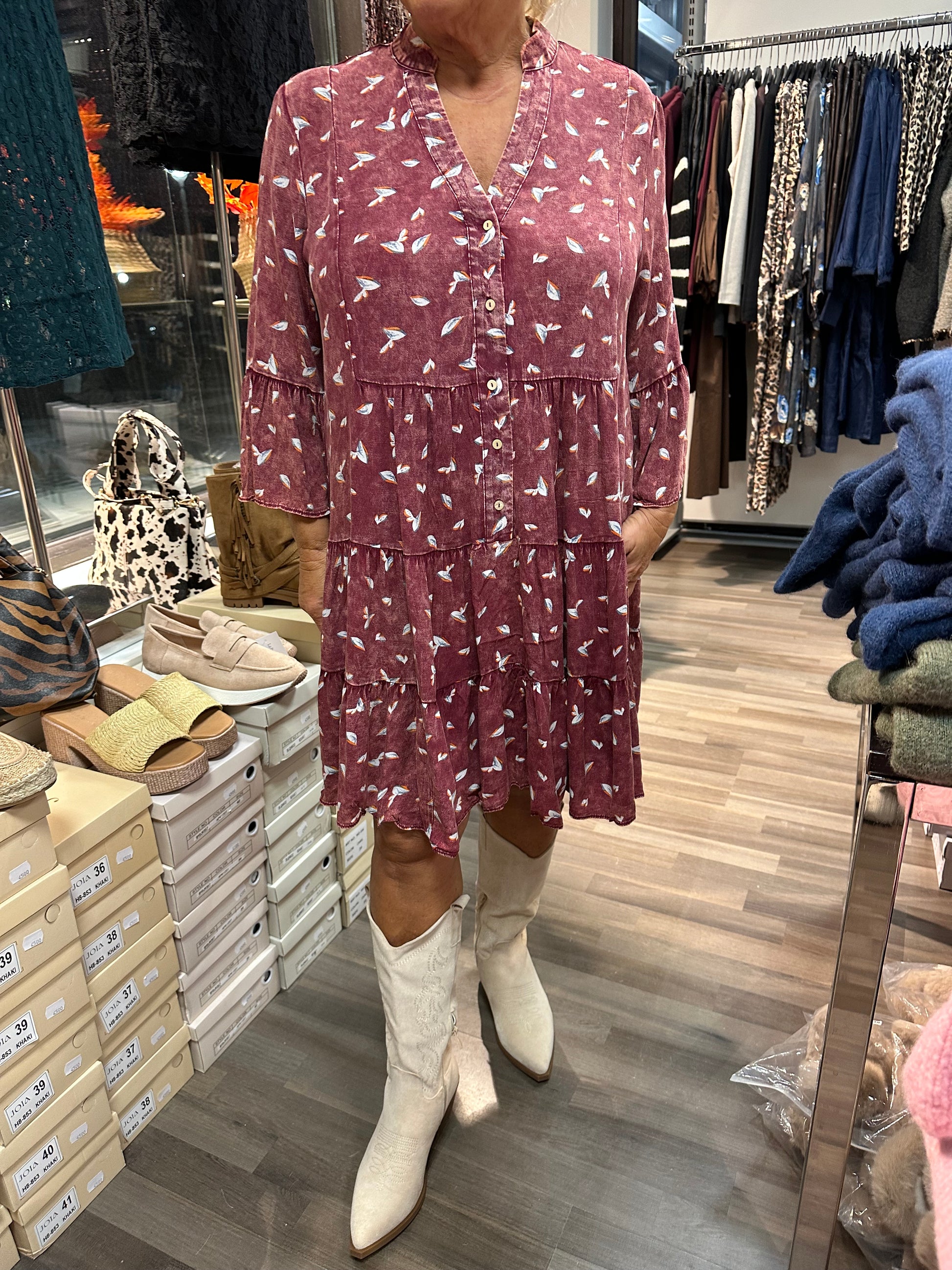 Silkkisekoitteinen lyhyt mekko/tunika! Kiva pesty punainen kangas. Vajaamittaiset hihat. Leveentyvä helma laskoksilla. Edessä nappilista.