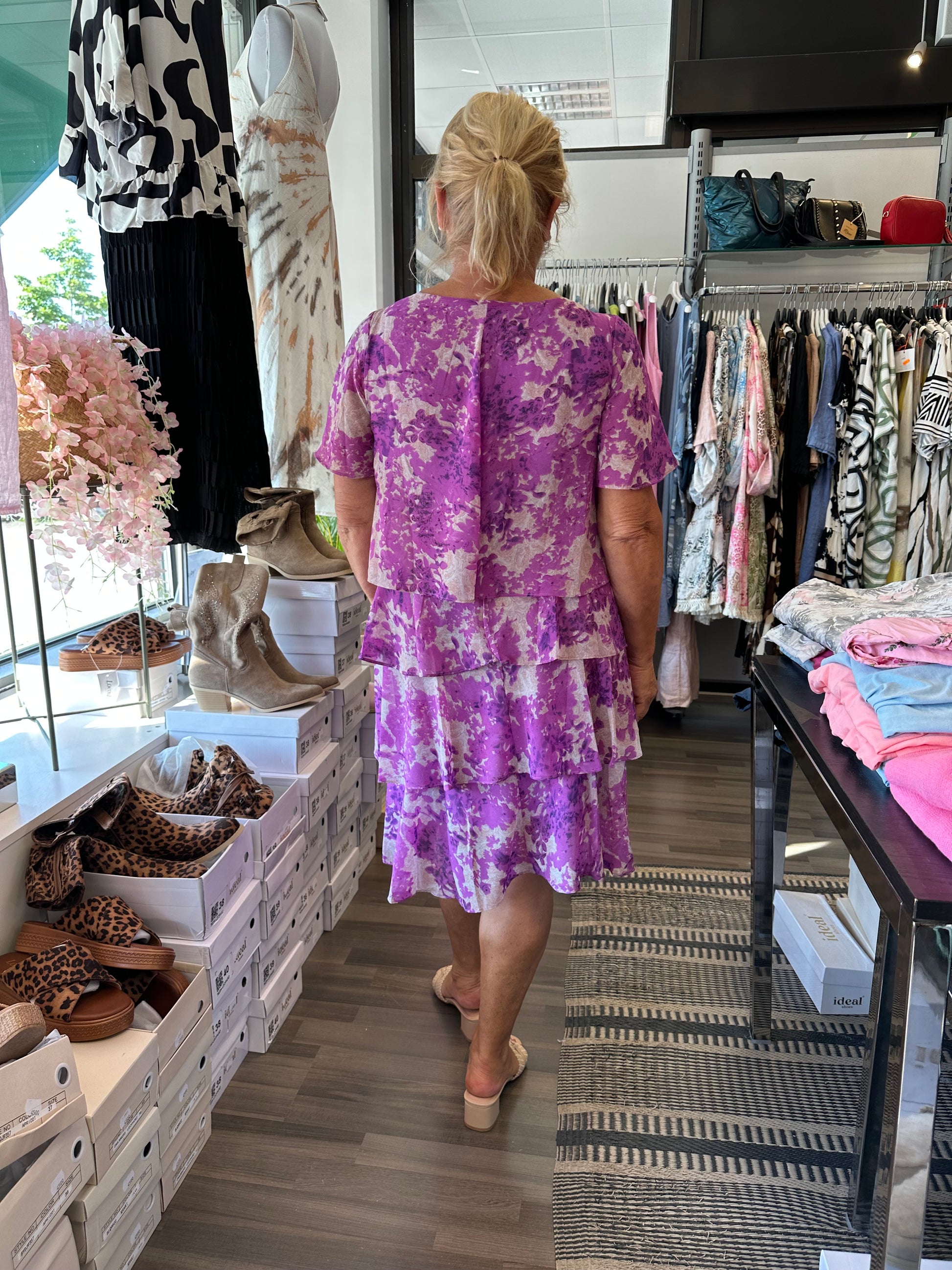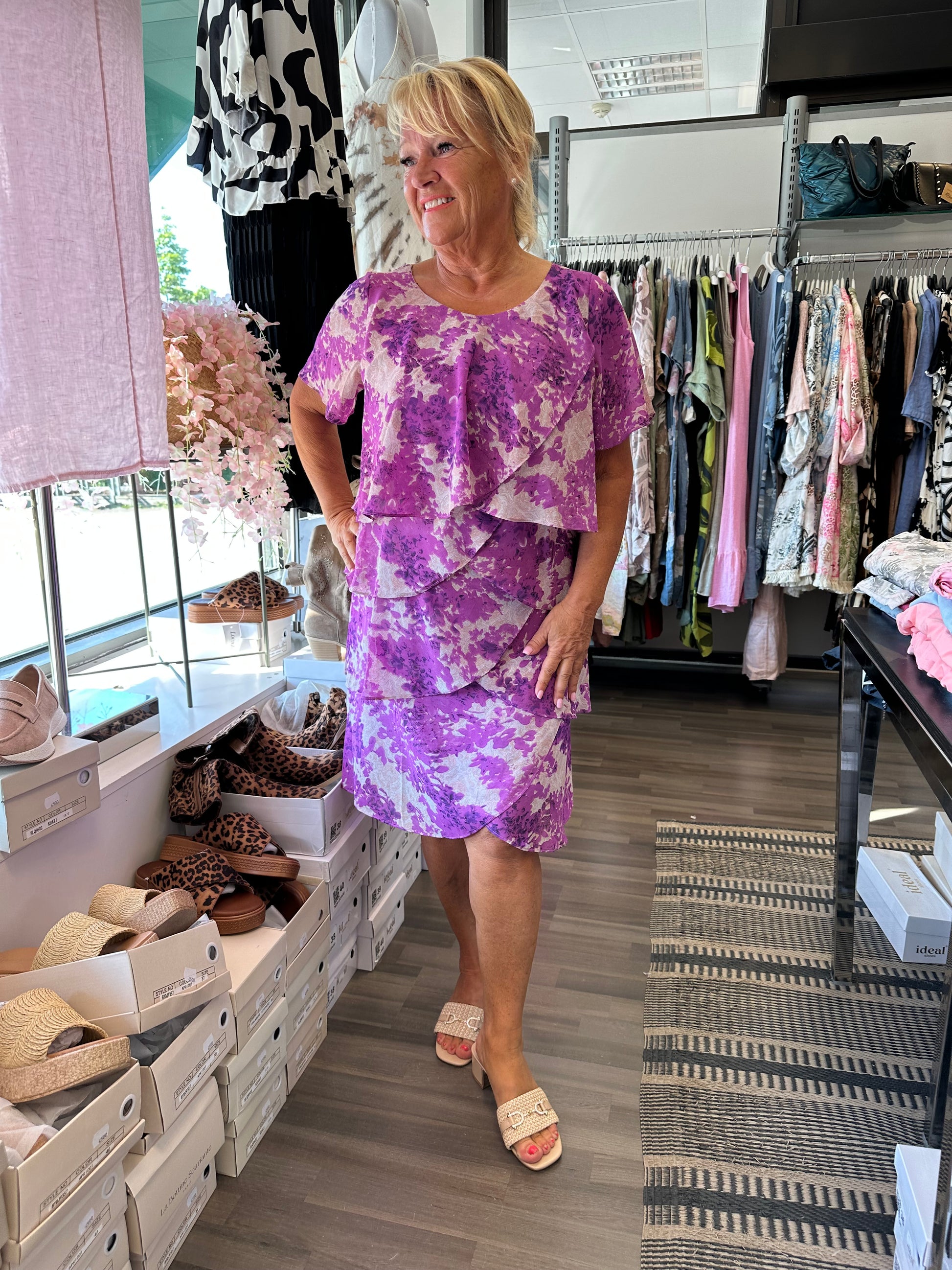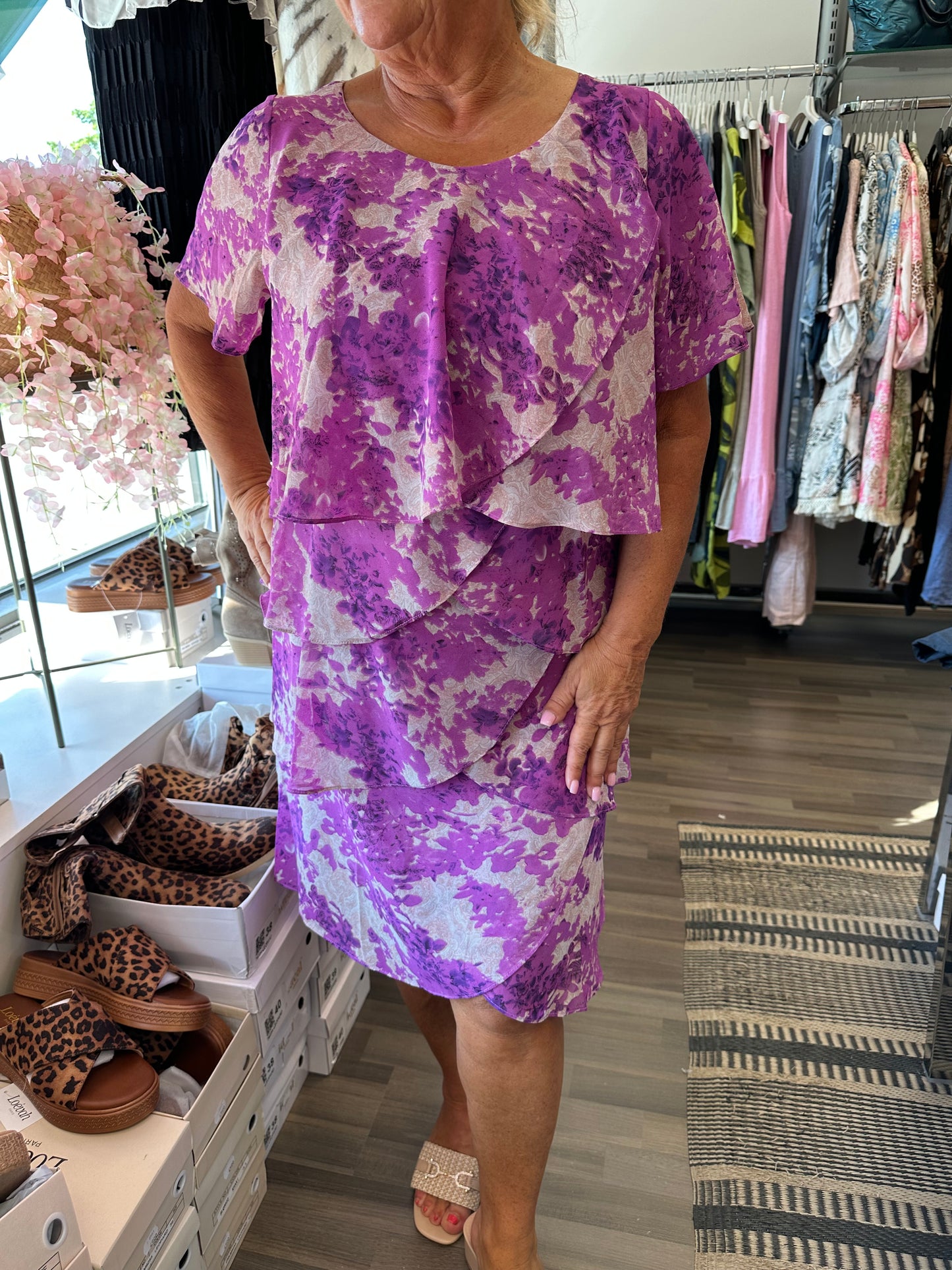 Lyhyempi sifonkinen kerrosmekko. Alla miellyttävä joustava vuori.