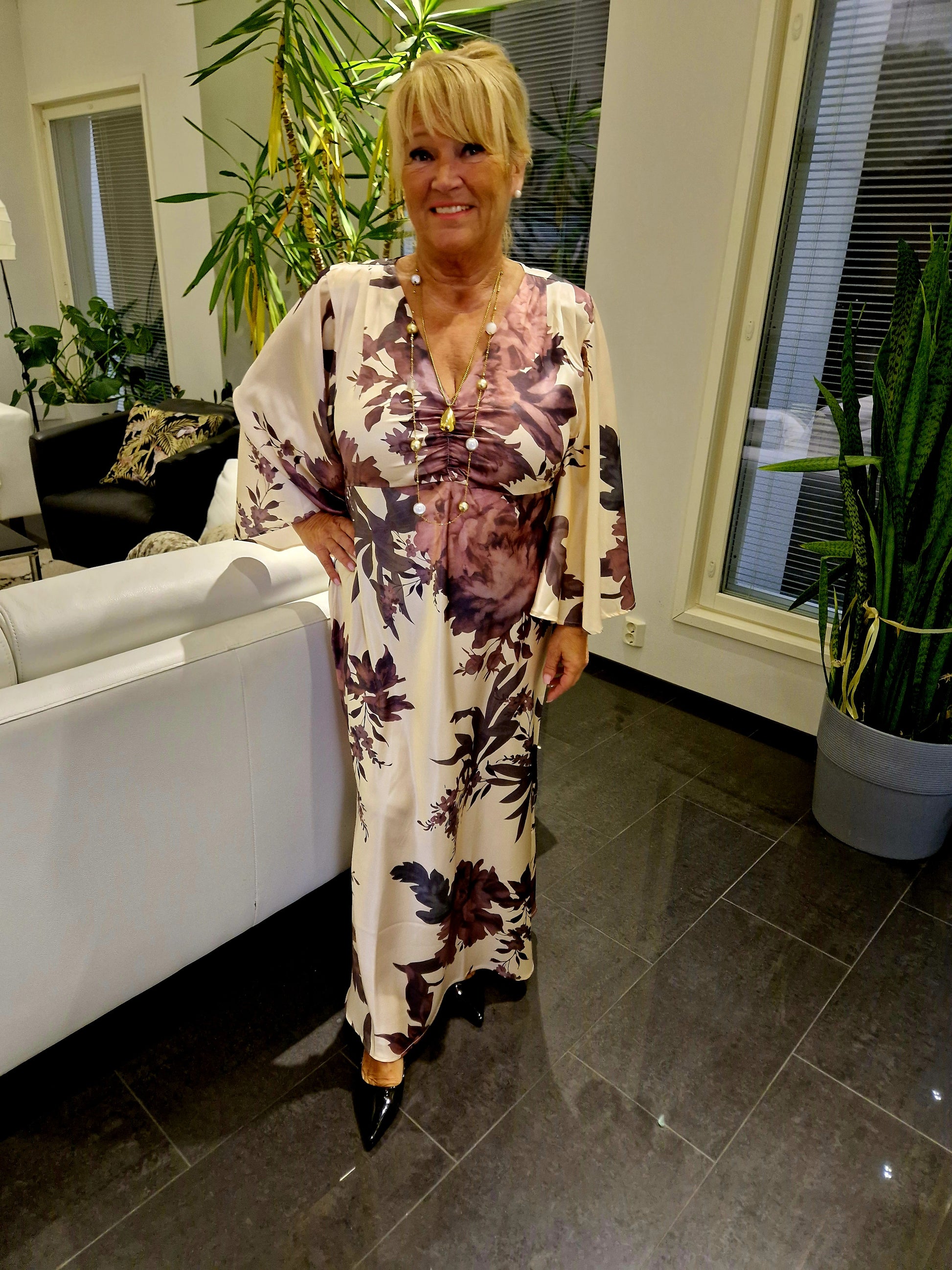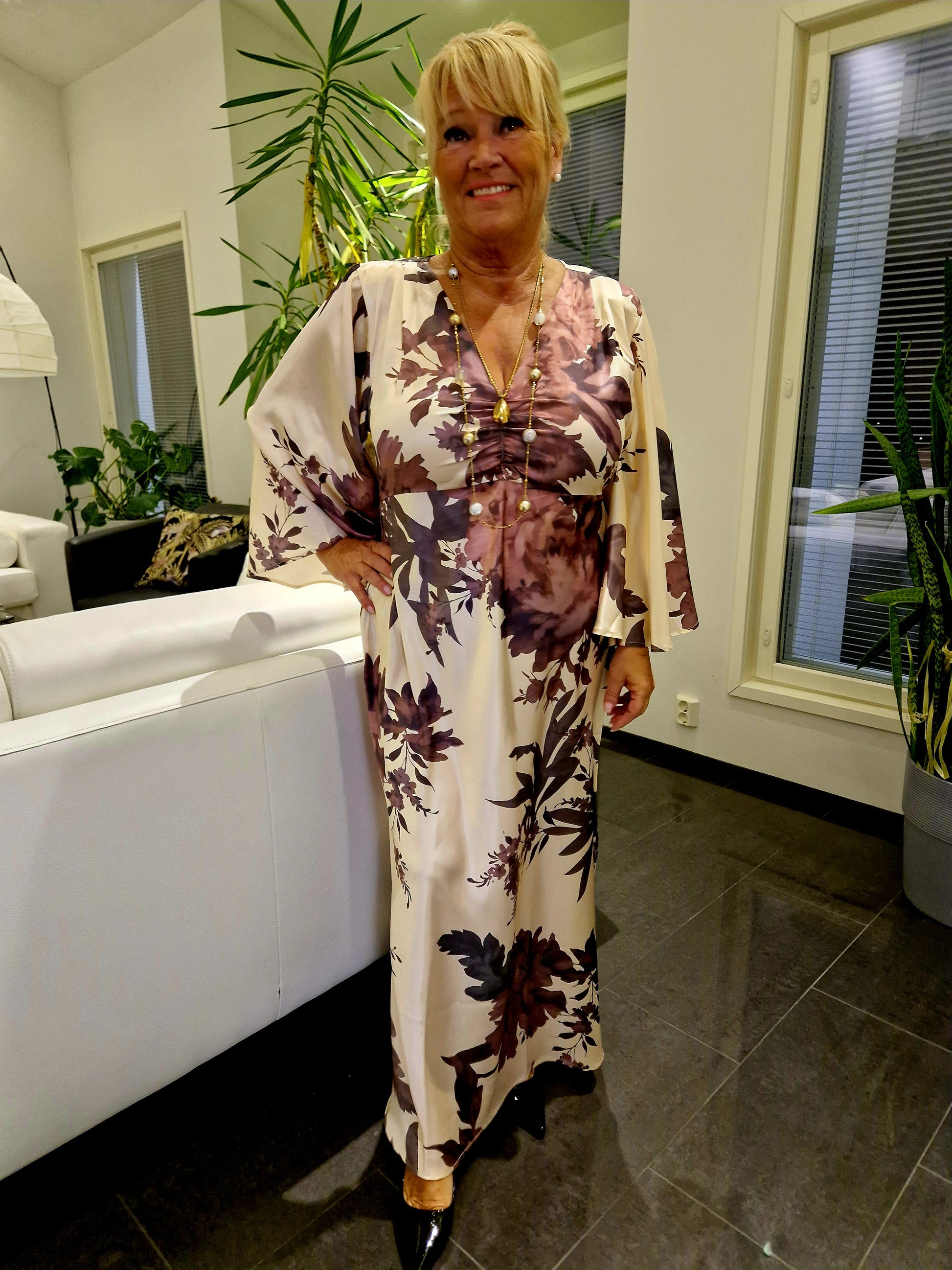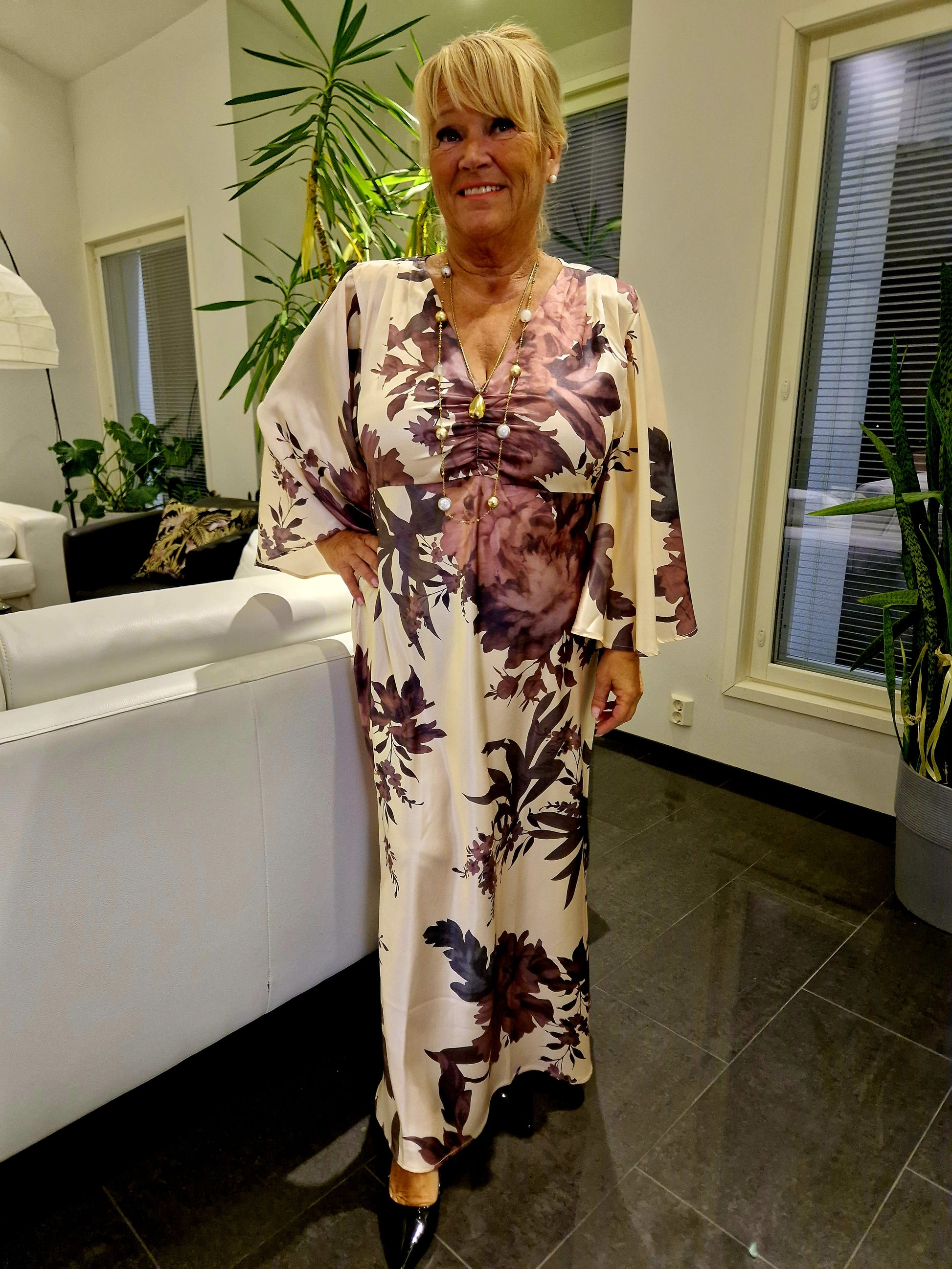 Upea pitkä mekko juhlaan! Luonnonvalkoinen pohjaväri ja kauniit kukat upeissa liilan/roosan sävyissä. V-pääntie ja rypytys rinnalla. Olkapäillä pienet laskokset ja olkatoppaukset. Pitkät leventyvät hihat. Sivusaumassa helmassa halkiot molemmin puolin.