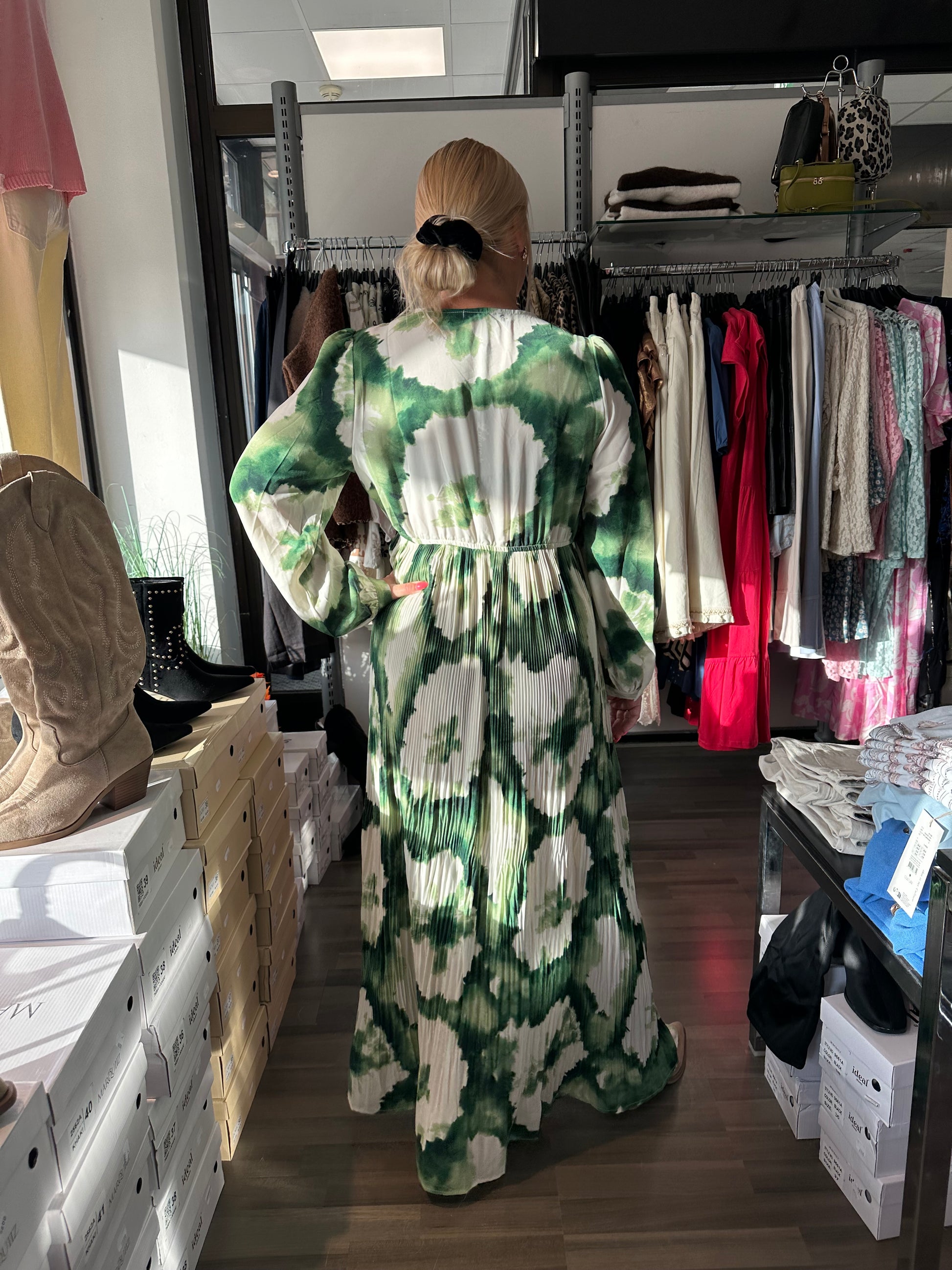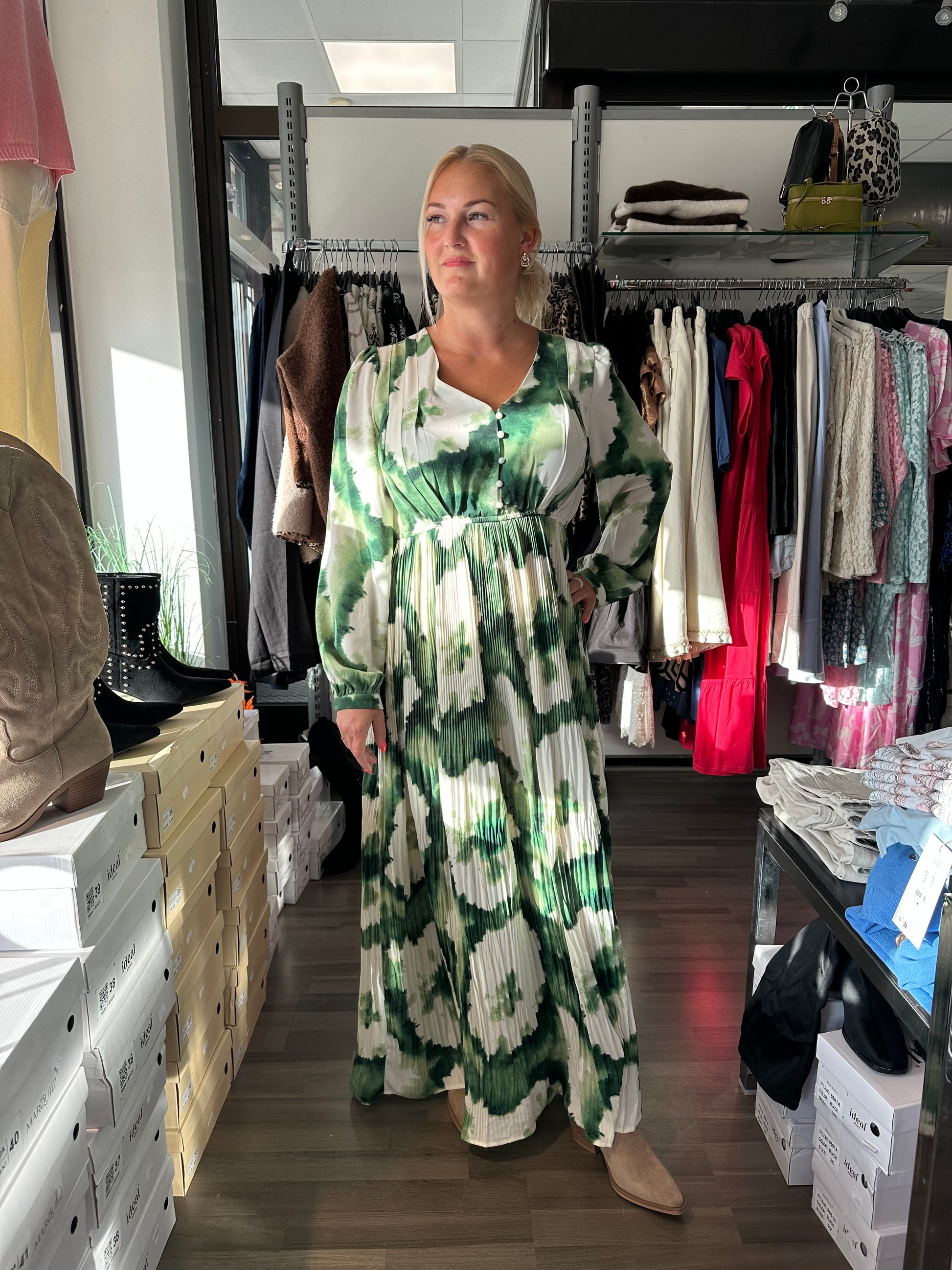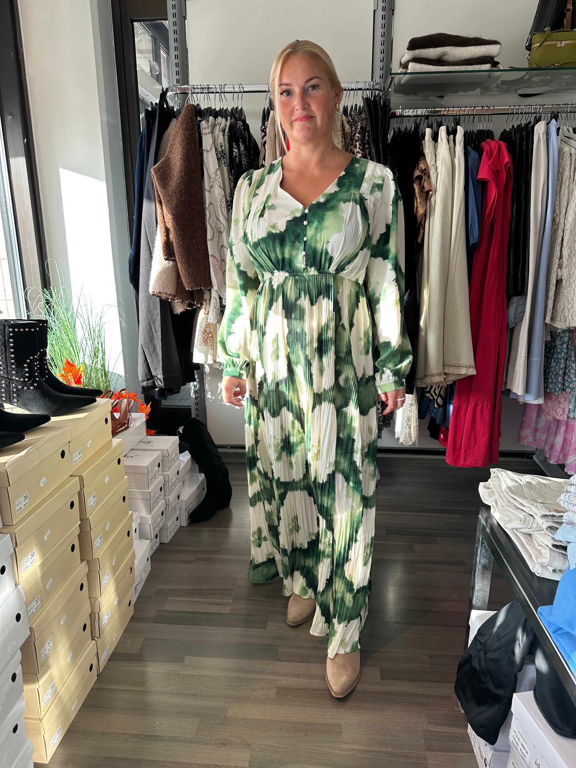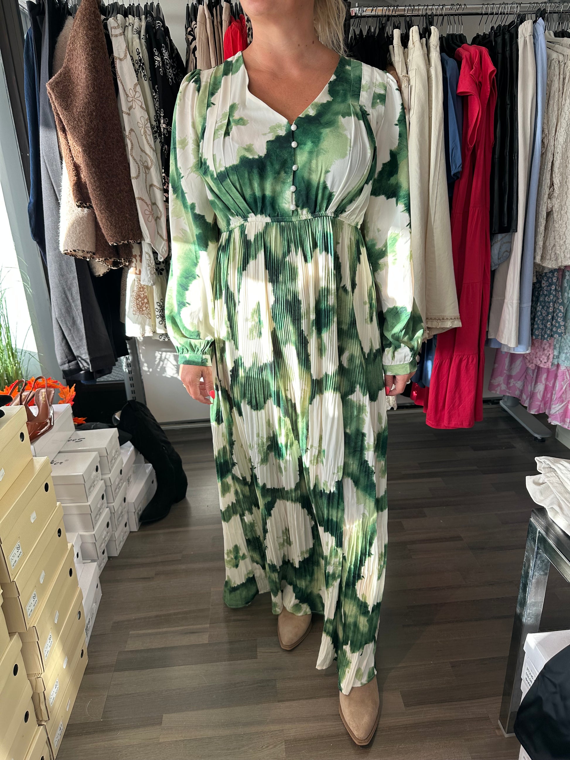 Näyttävä maksimekko kauniilla kuosilla. Kevyesti laskeutuva kangas liikkuu kauniisti. Yläosa istuu siististi ja korostaa kevyesti vartaloa, kun taas alaosa laskeutuu väljästi ja antaa liikkumavapautta. Edessä pieni nappilista ja V-pääntie. Pitkät hihat kevyellä rypytyksellä.