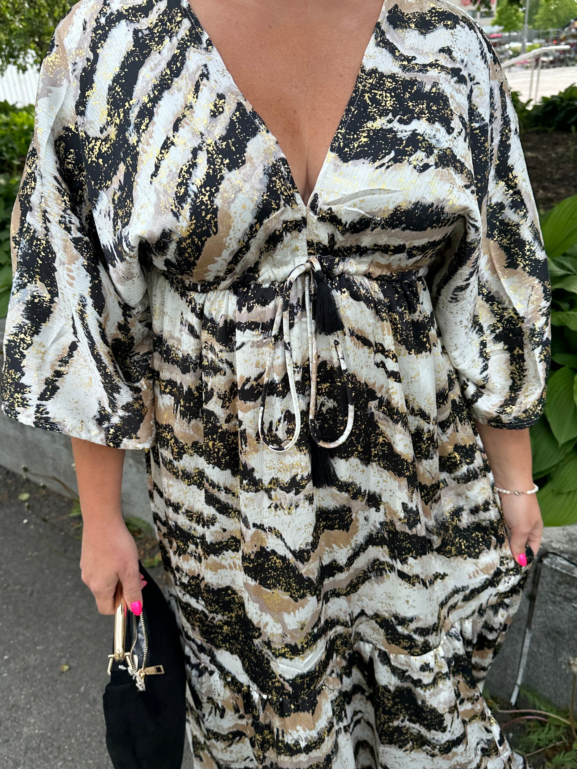 Pitkä mekko kimonohihoilla ja kiristysnauhalla vyötäröllä. Vaaleapohjainen kangas, jossa mukana kultaista. Alla vuori. Niskassa nyöri.