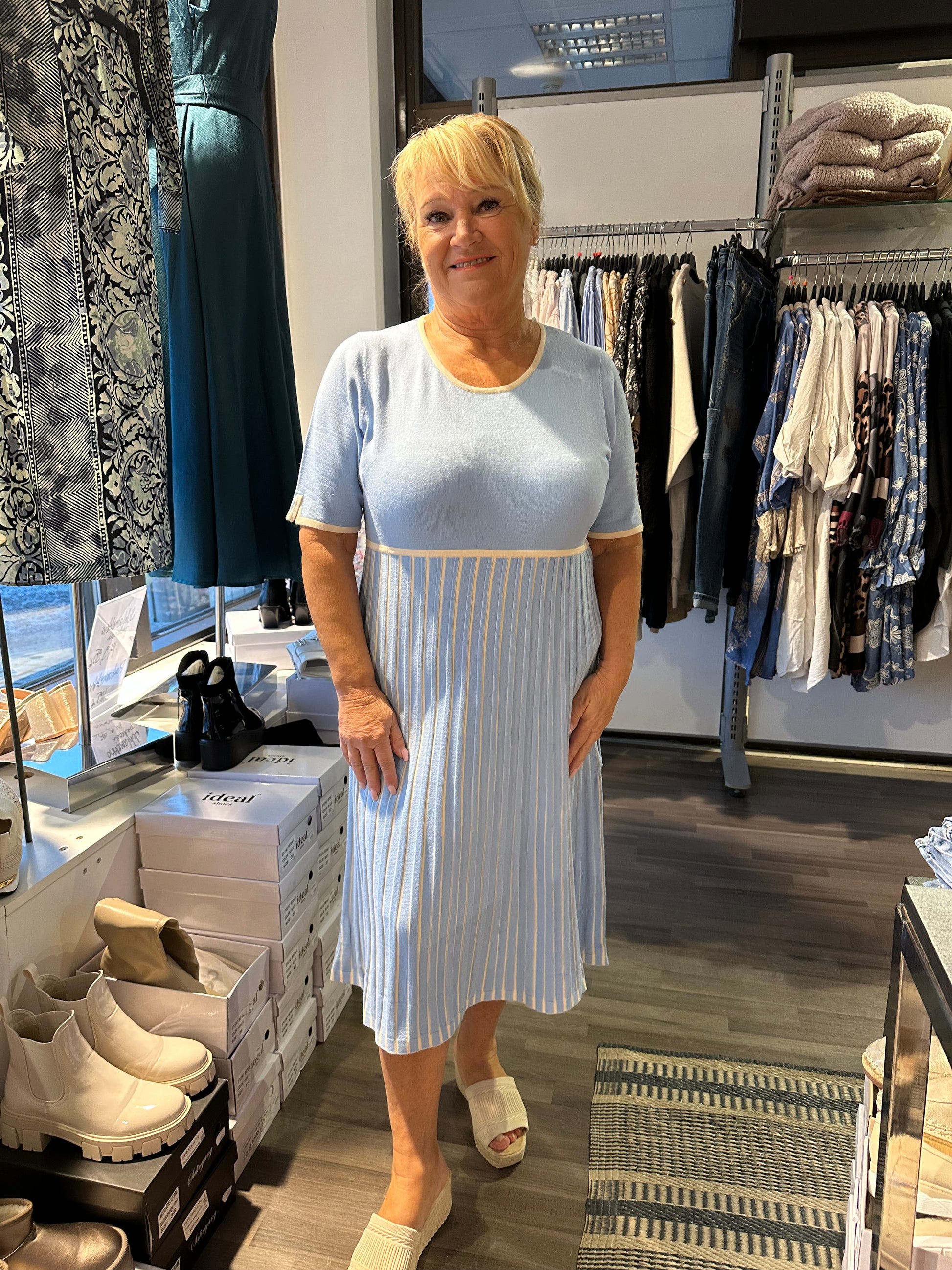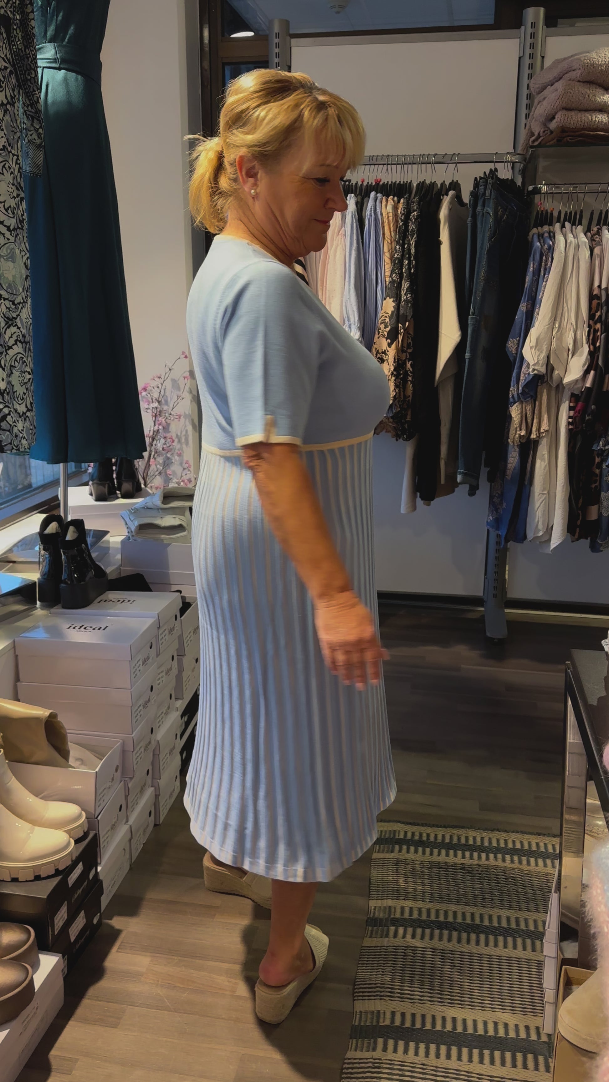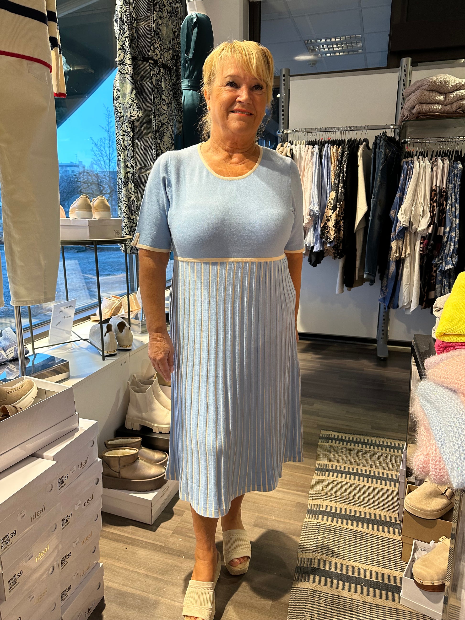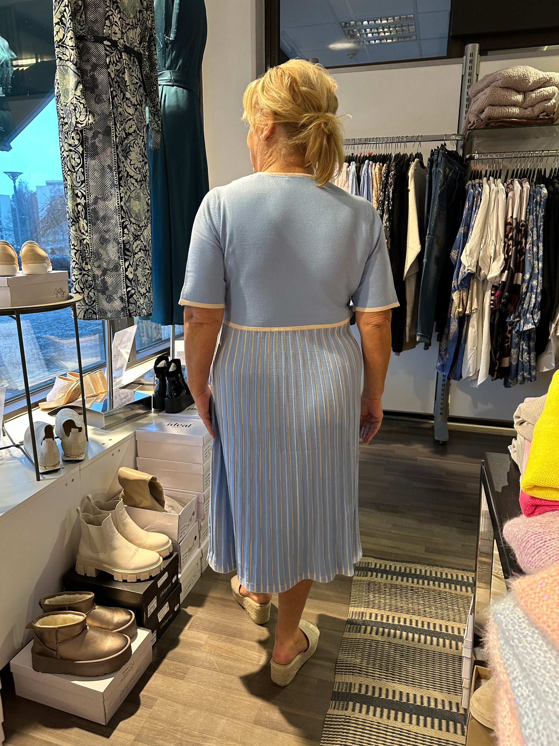 Miellyttävän tuntuinen neulemekko lyhyillä hihoilla ja plisee-tyylisellä helmalla. Pehmeää ja joustavaa neulosta. Tämä mekko vastaa normaalia kokoa.