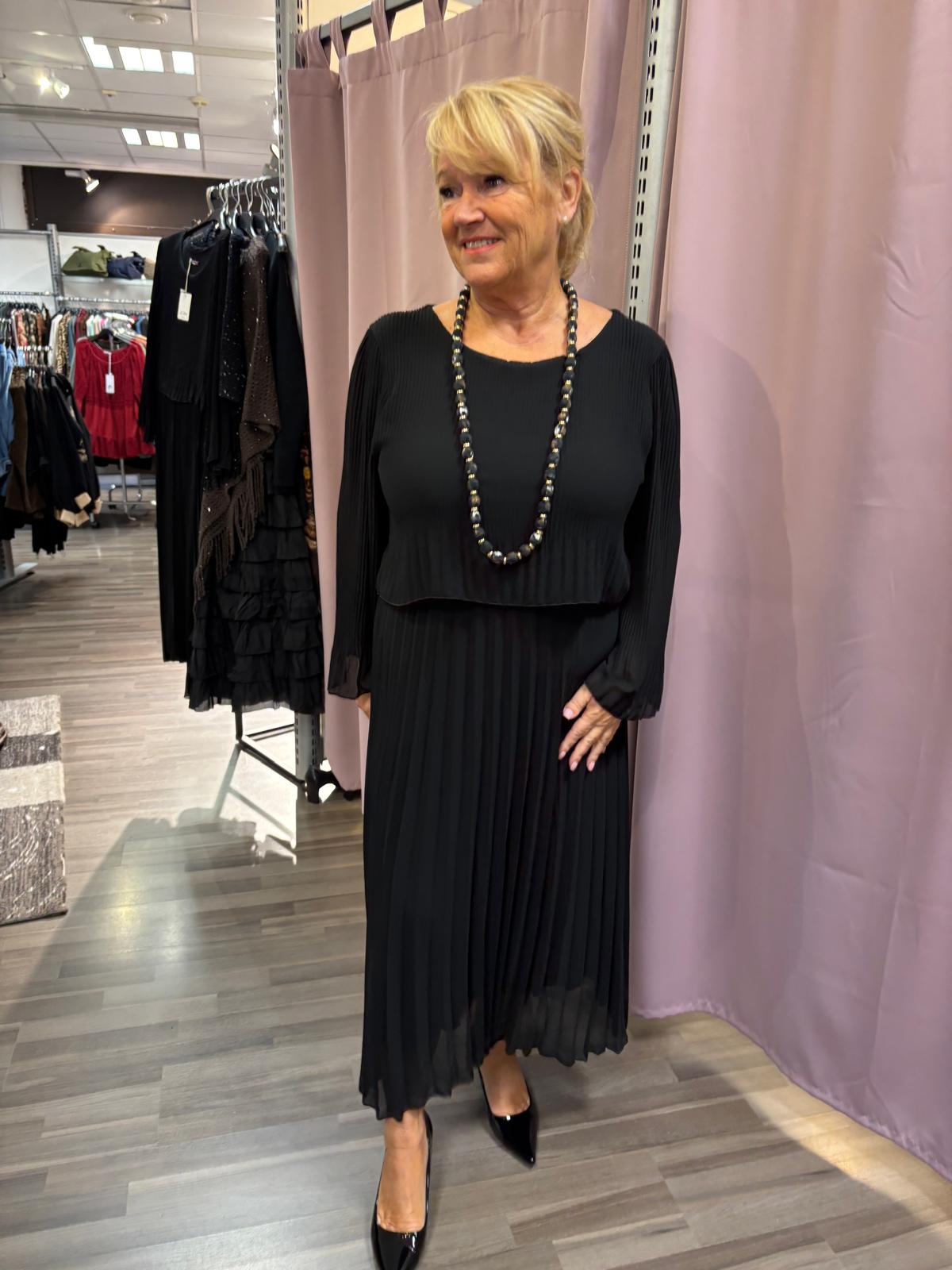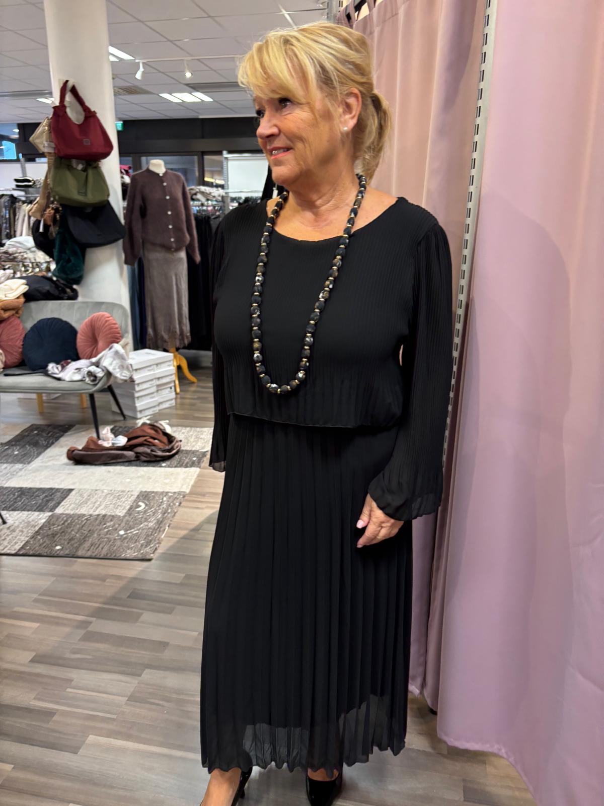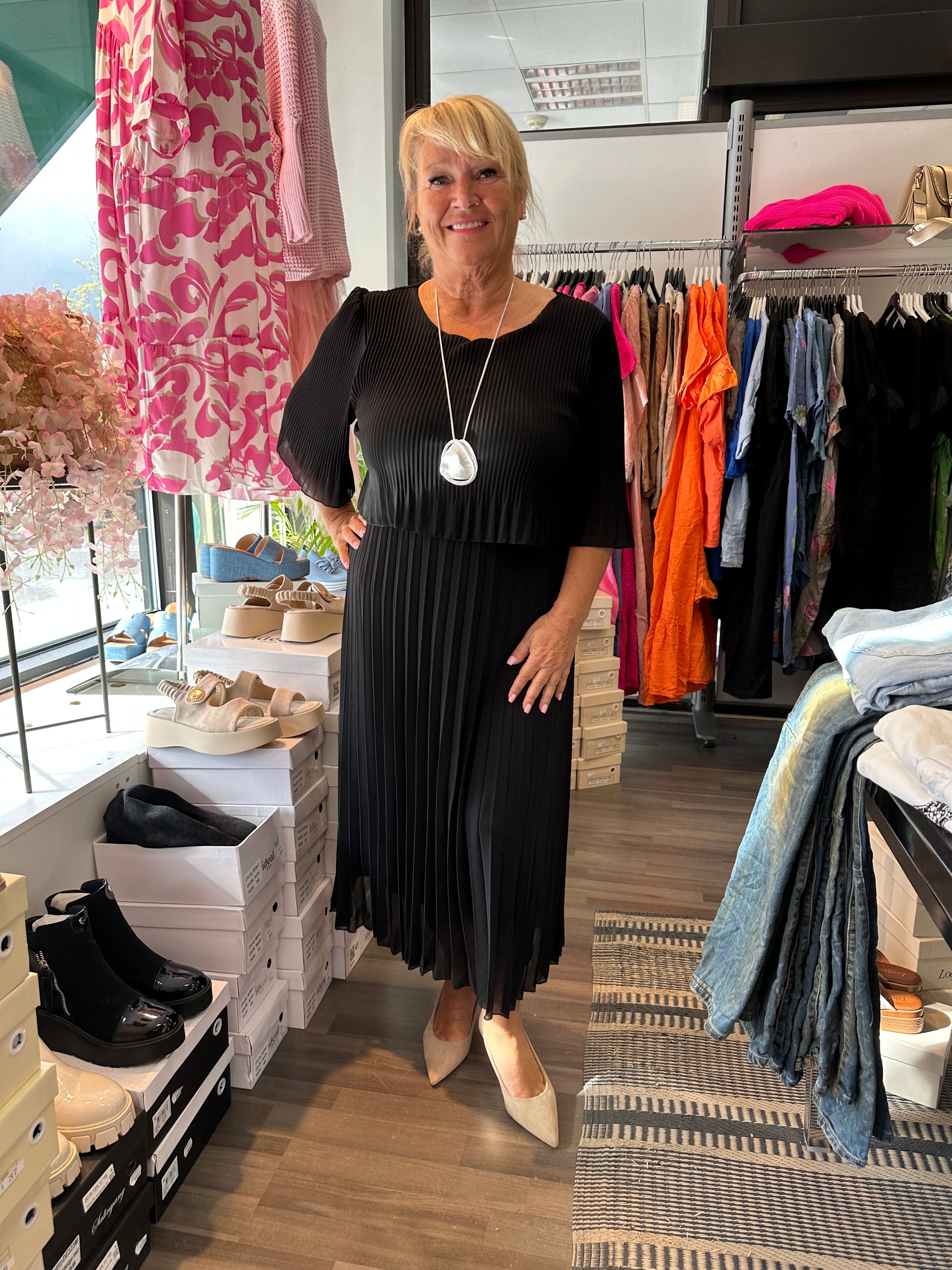 Midimittainen pliseemekko, joka on miellyttävän kevyt päällä. Alla joustava viskoosivuori. Vyötäröllä joustava kuminauha.