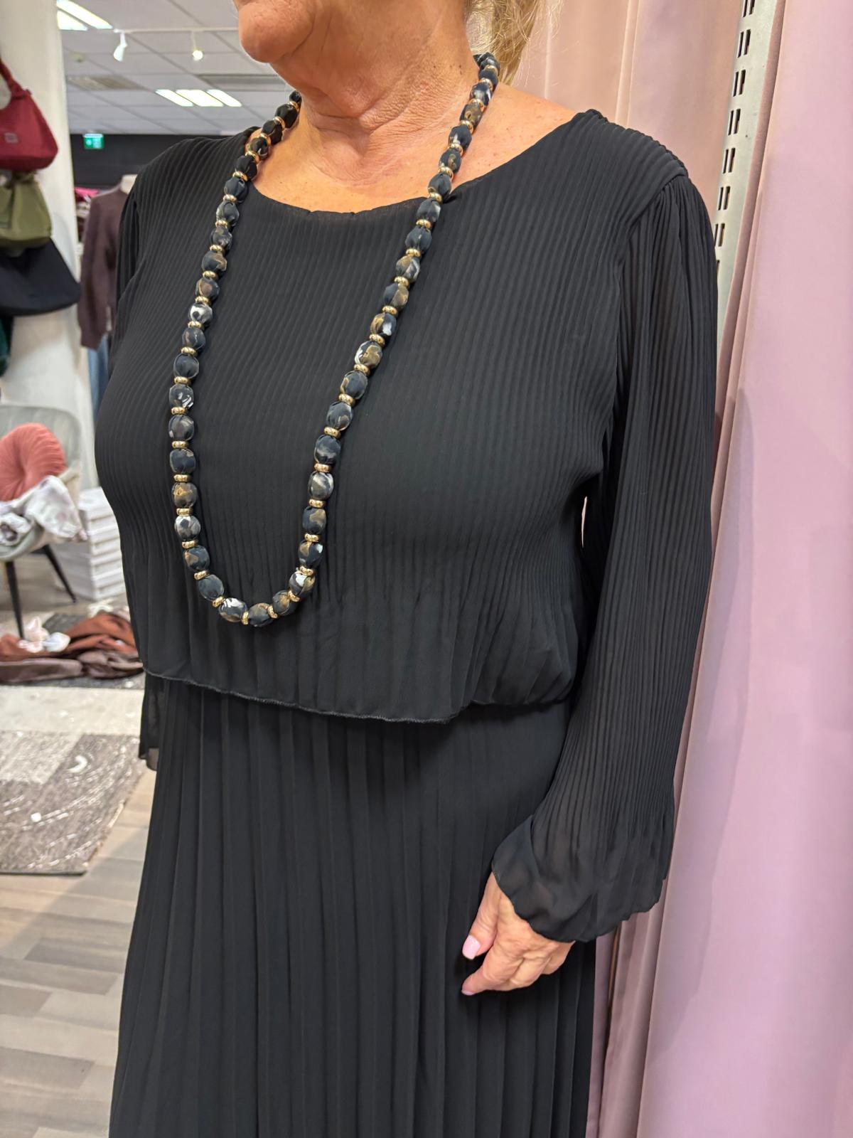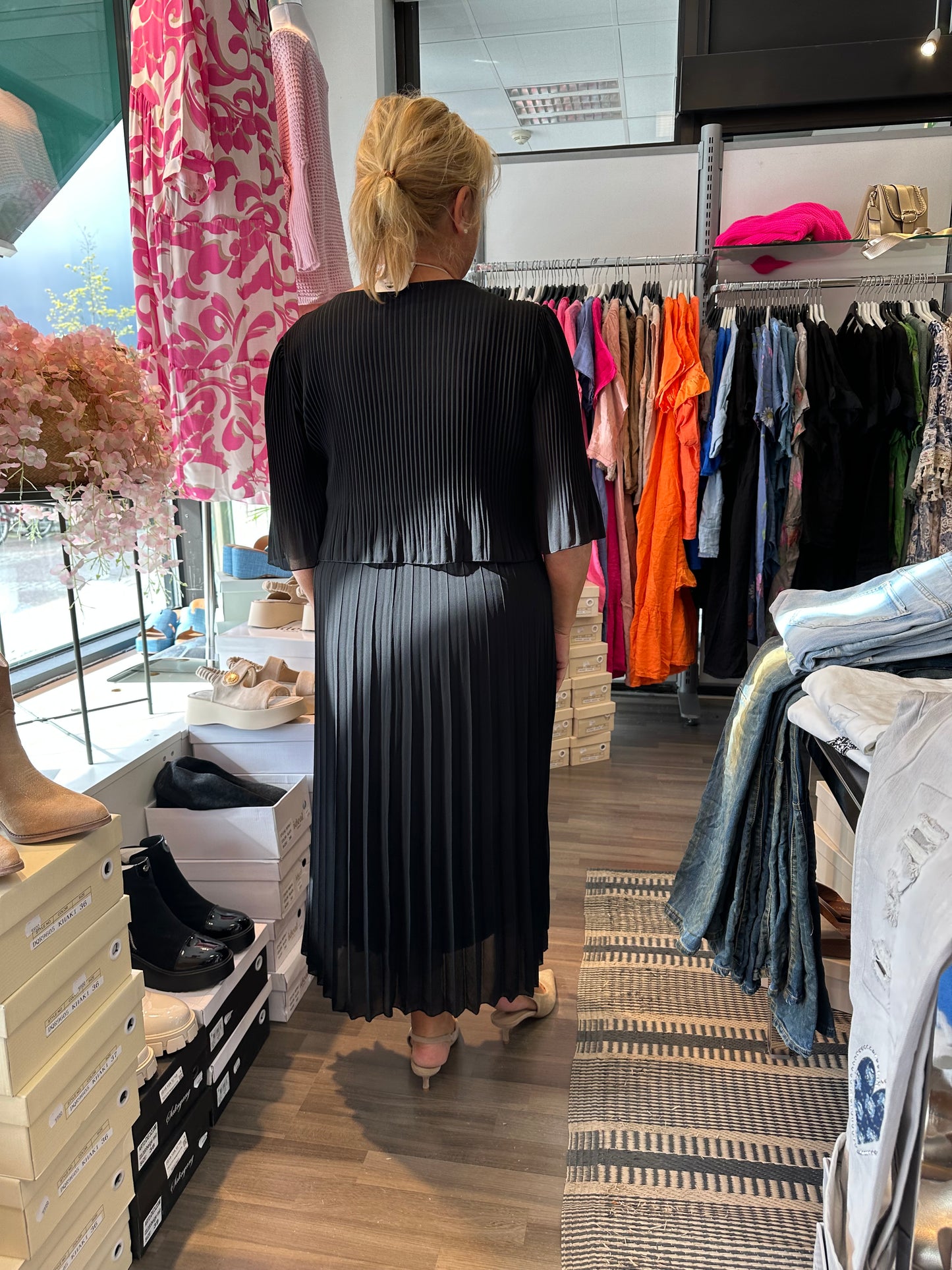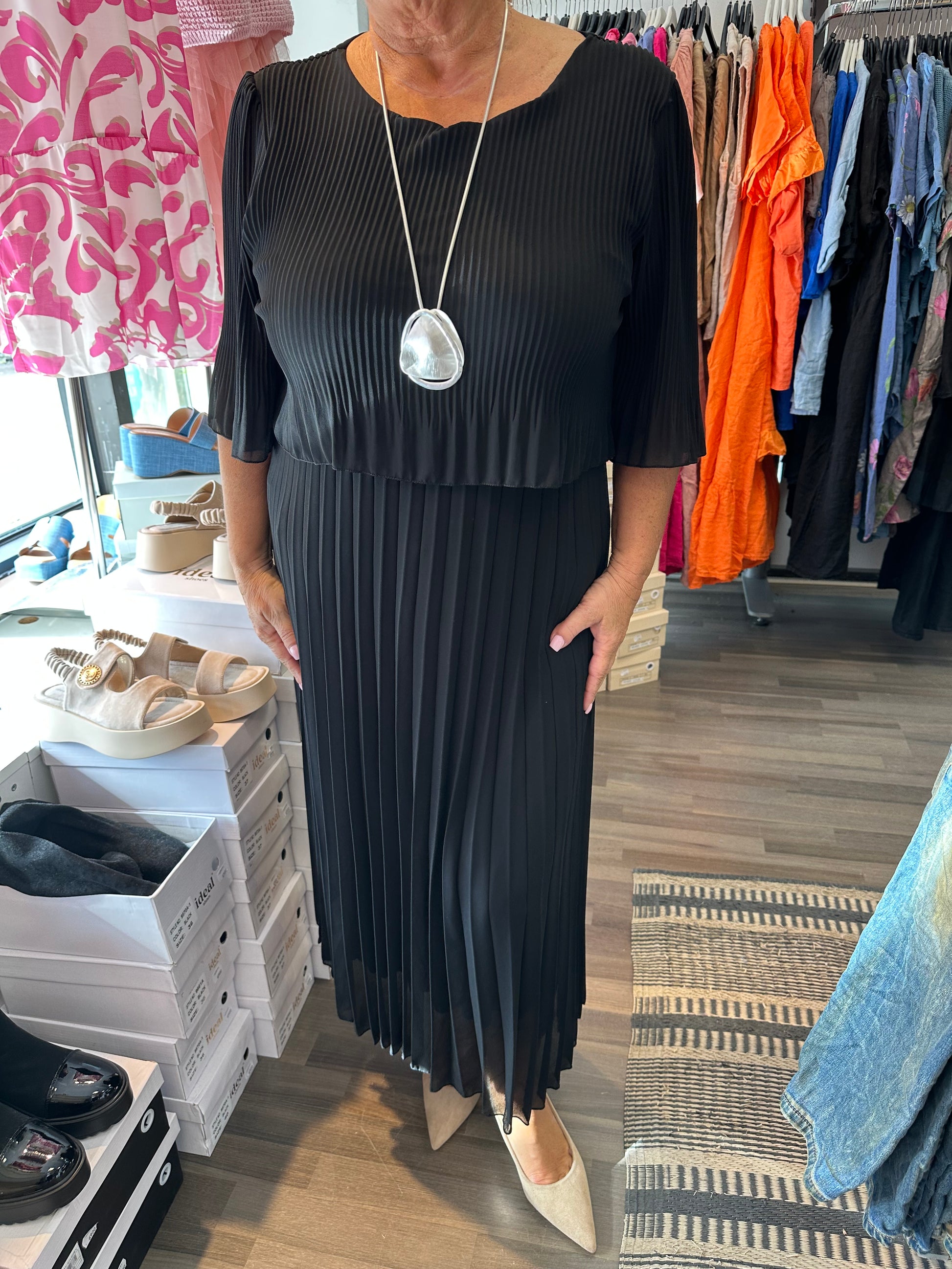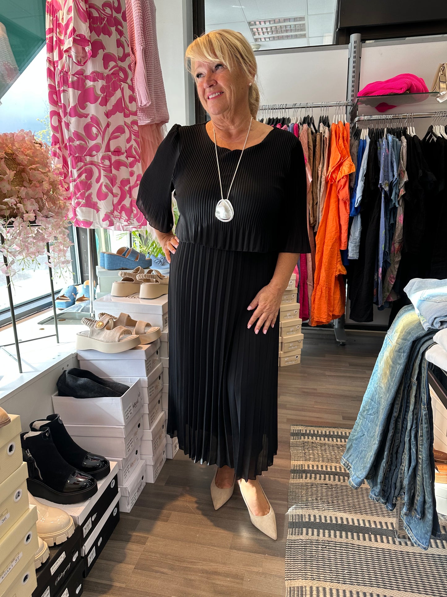 Midimittainen pliseemekko, joka on miellyttävän kevyt päällä. Alla joustava viskoosivuori. Vyötäröllä joustava kuminauha.