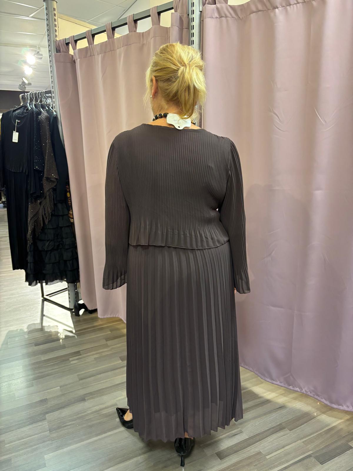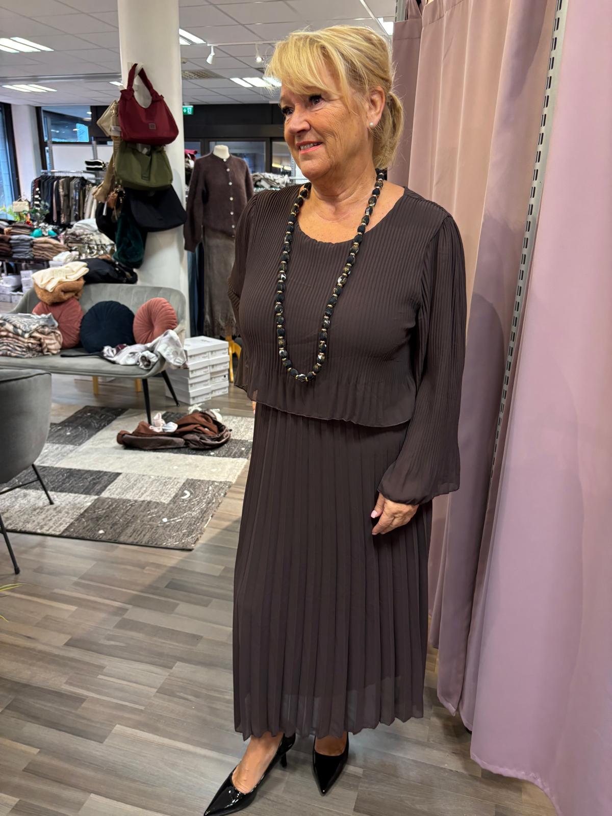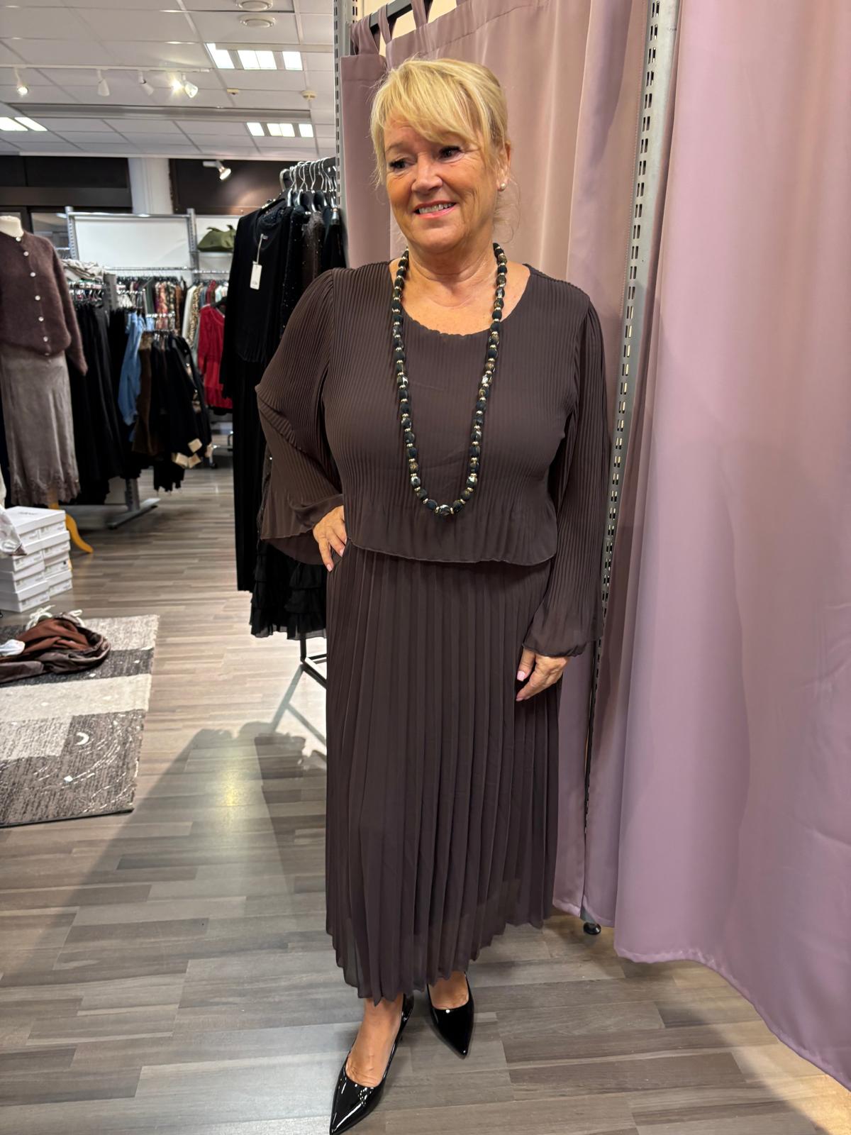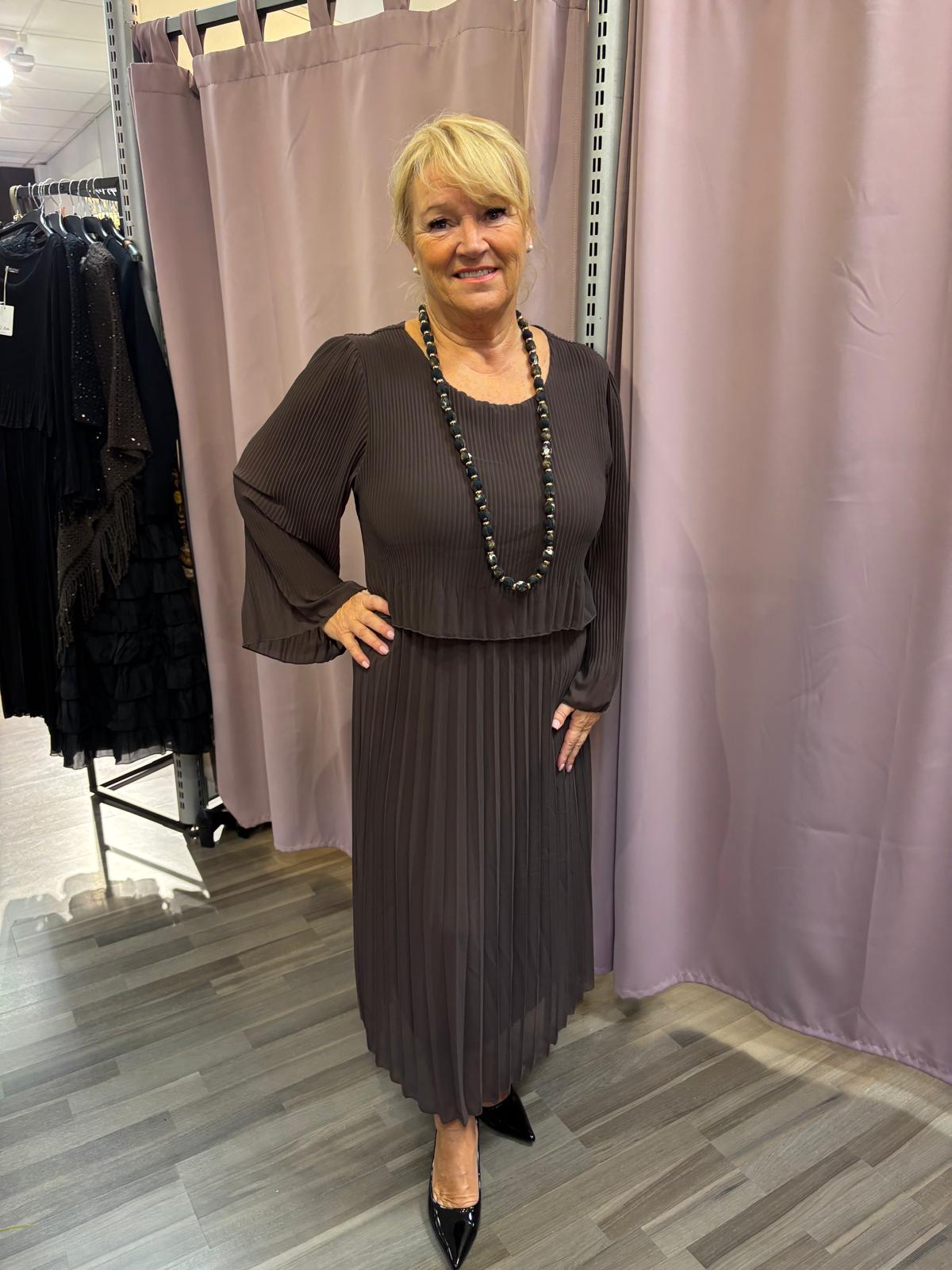 Midimittainen pliseemekko, joka on miellyttävän kevyt päällä. Alla joustava viskoosivuori. Vyötäröllä joustava kuminauha.