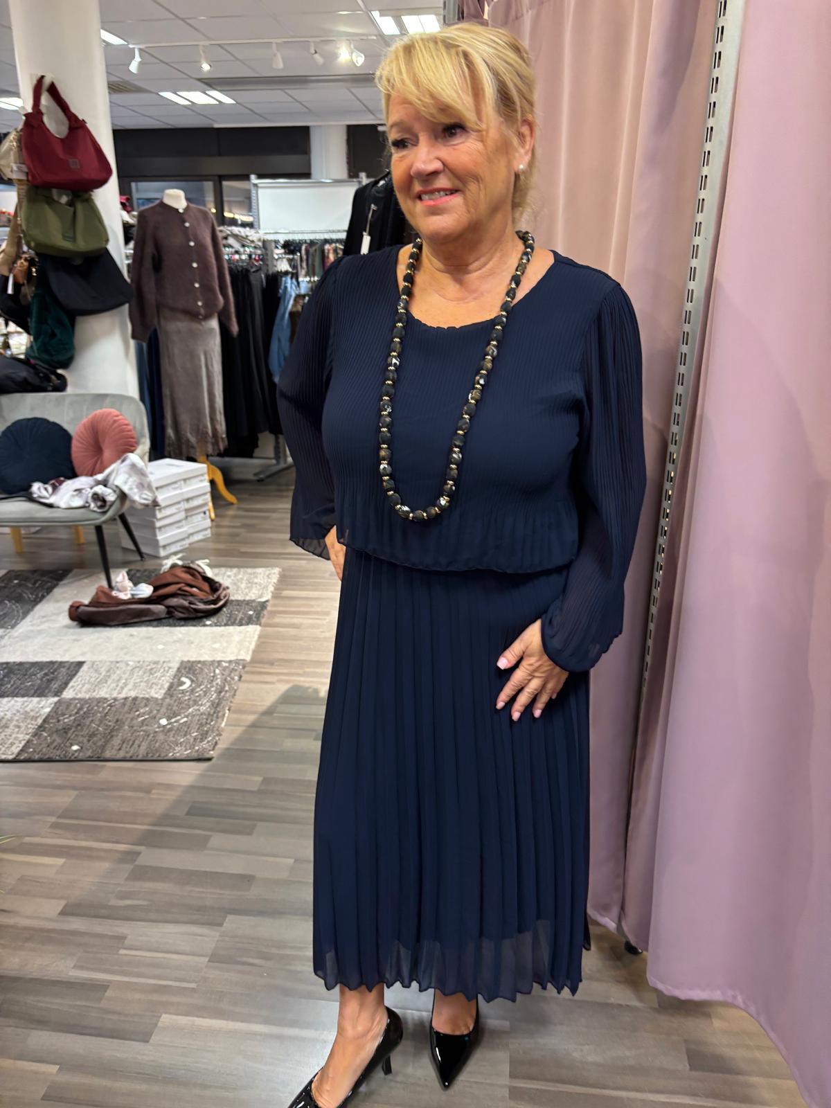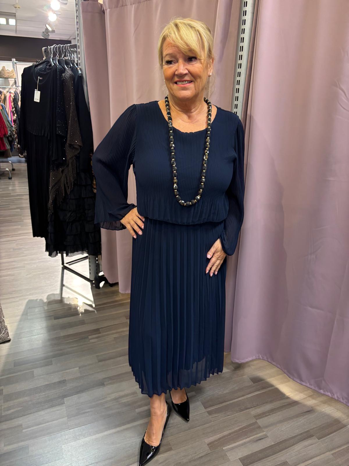 Midimittainen pliseemekko, joka on miellyttävän kevyt päällä. Alla joustava viskoosivuori. Vyötäröllä joustava kuminauha.