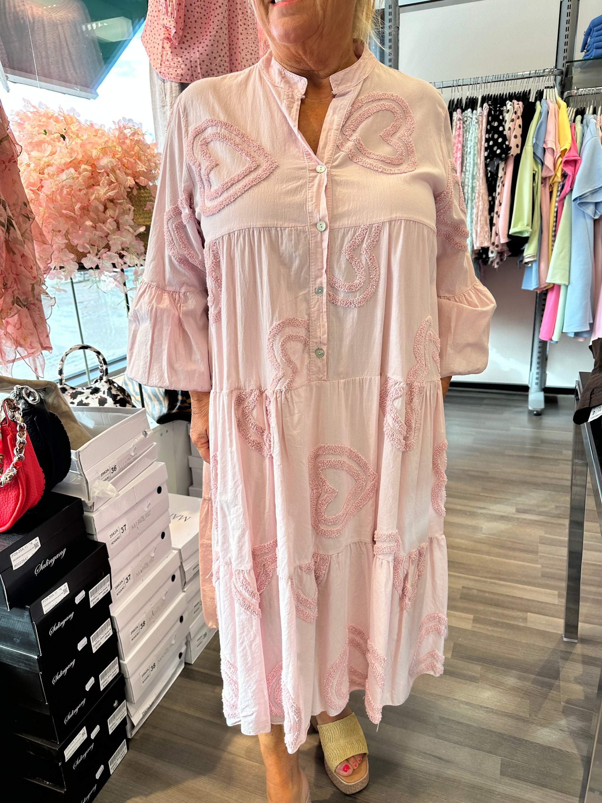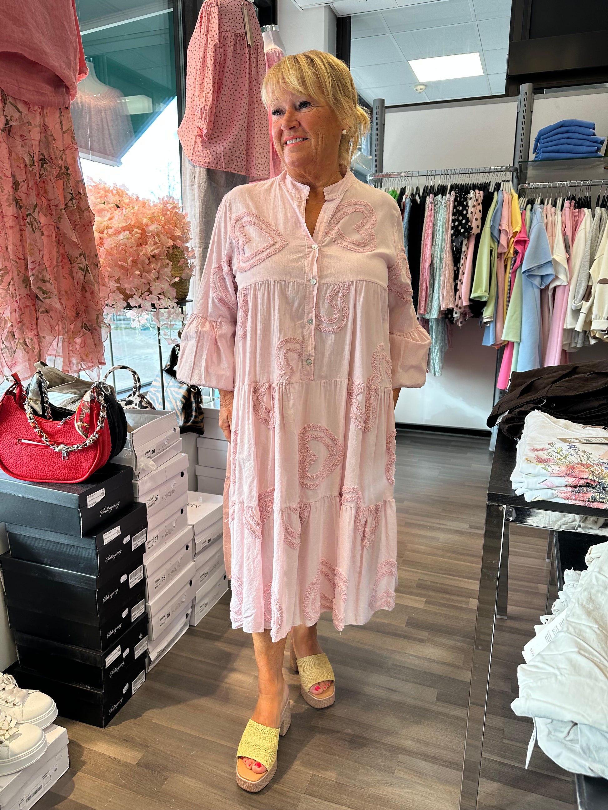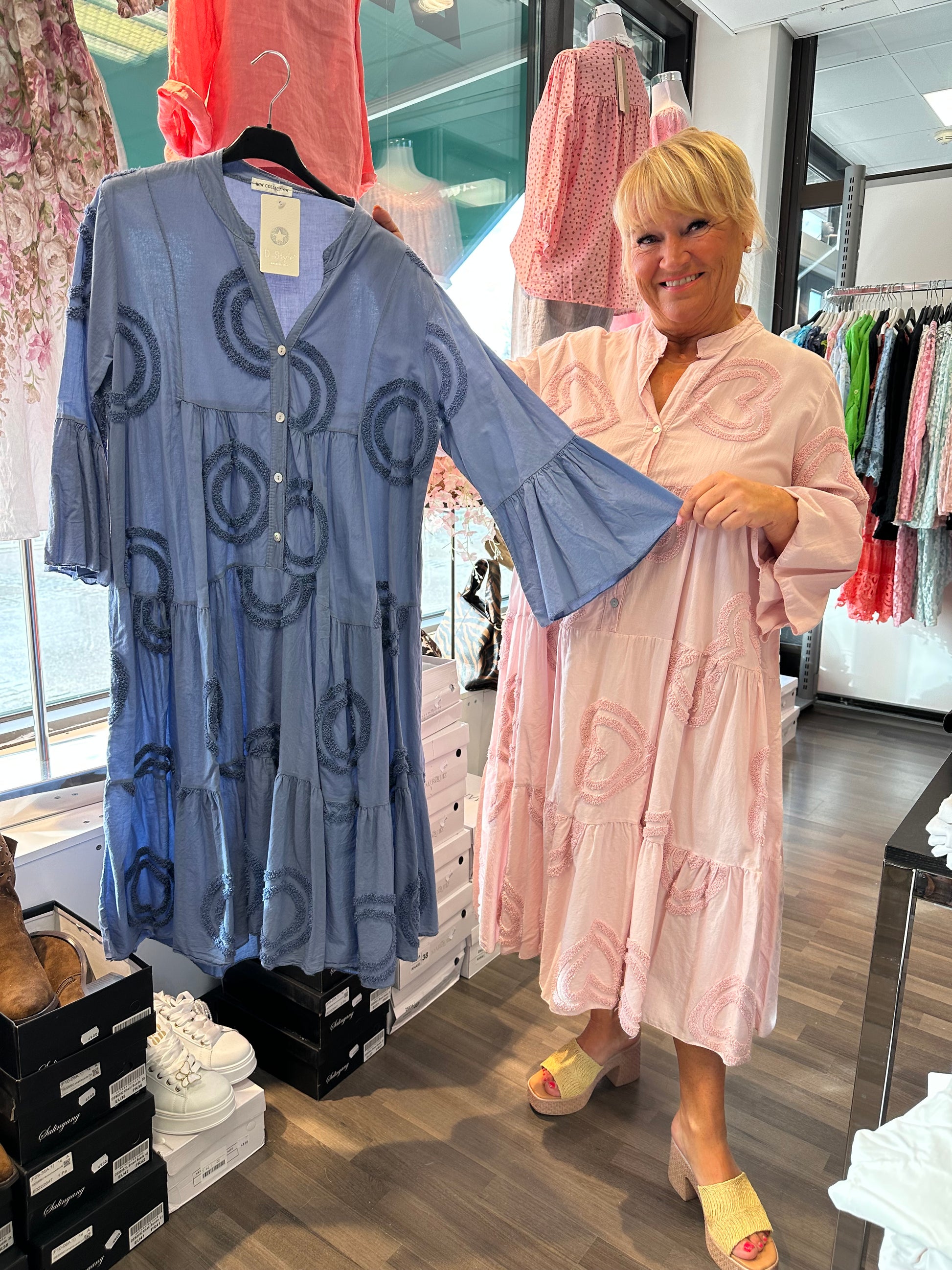Kevyt midimittainen puuvillamekko. Kankaassa etupuolella kivoja brodeerauksia. Vajaamittaiset hihat. Edessä nappilista.