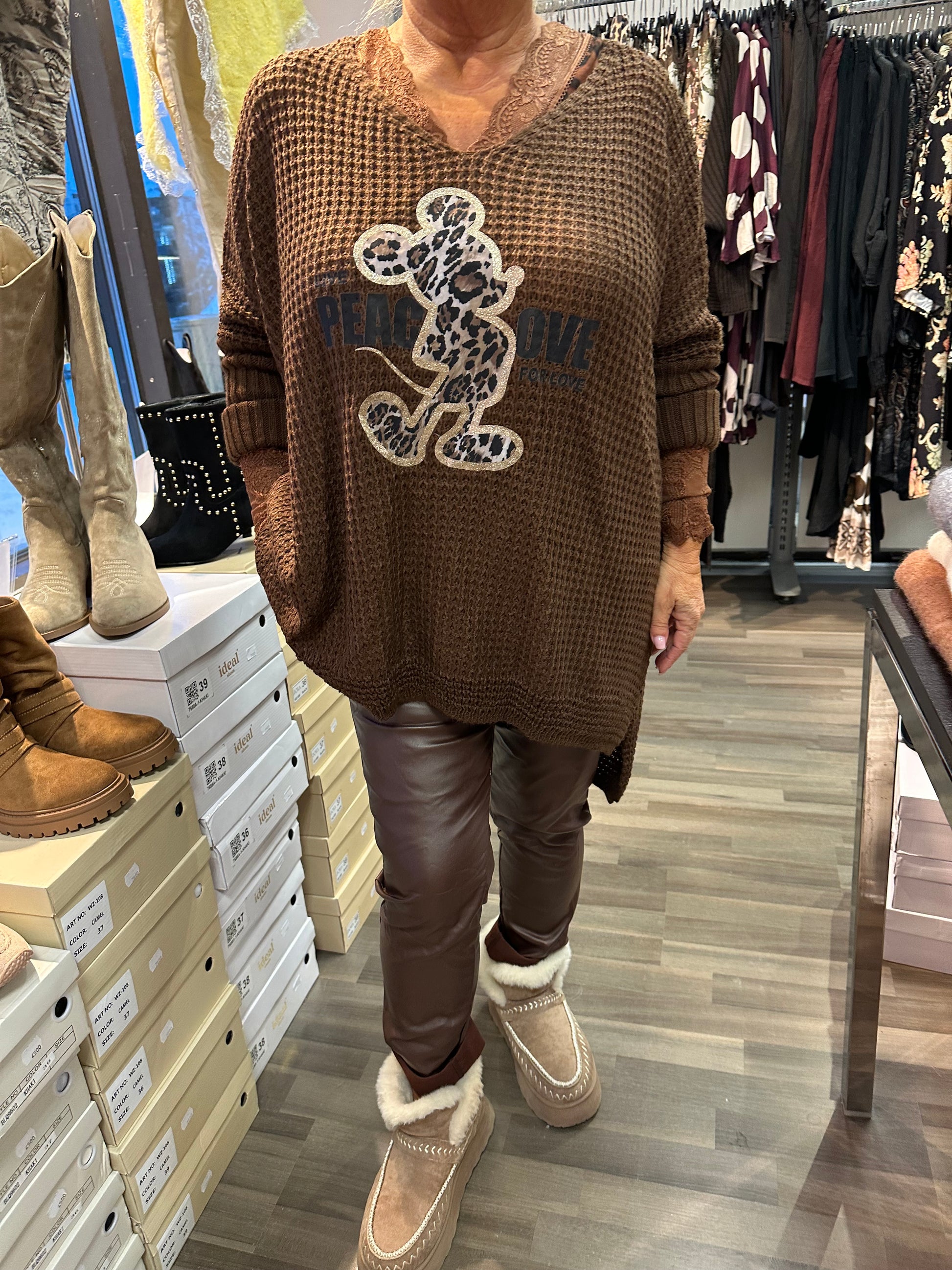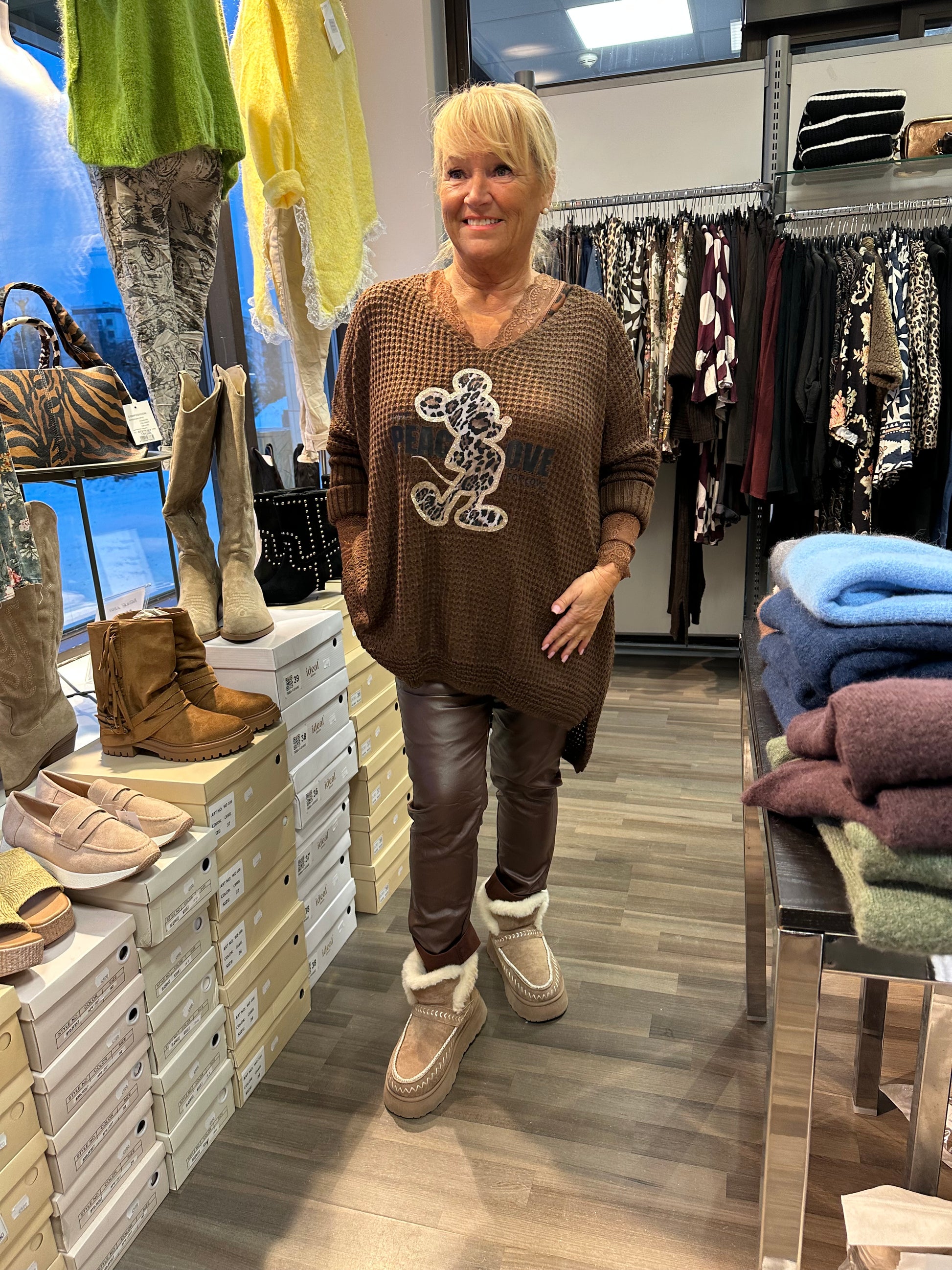 Rennon oversize-mitoituksen neule kauniilla vohvelineuloksella ja V-pääntiellä. Pitkät, joustavat hihansuut tekevät neuleesta helpon kerrostaa takin alle. Edessä hillitty teksti ja tietenkin Mikki kruunaamassa ilmeen!