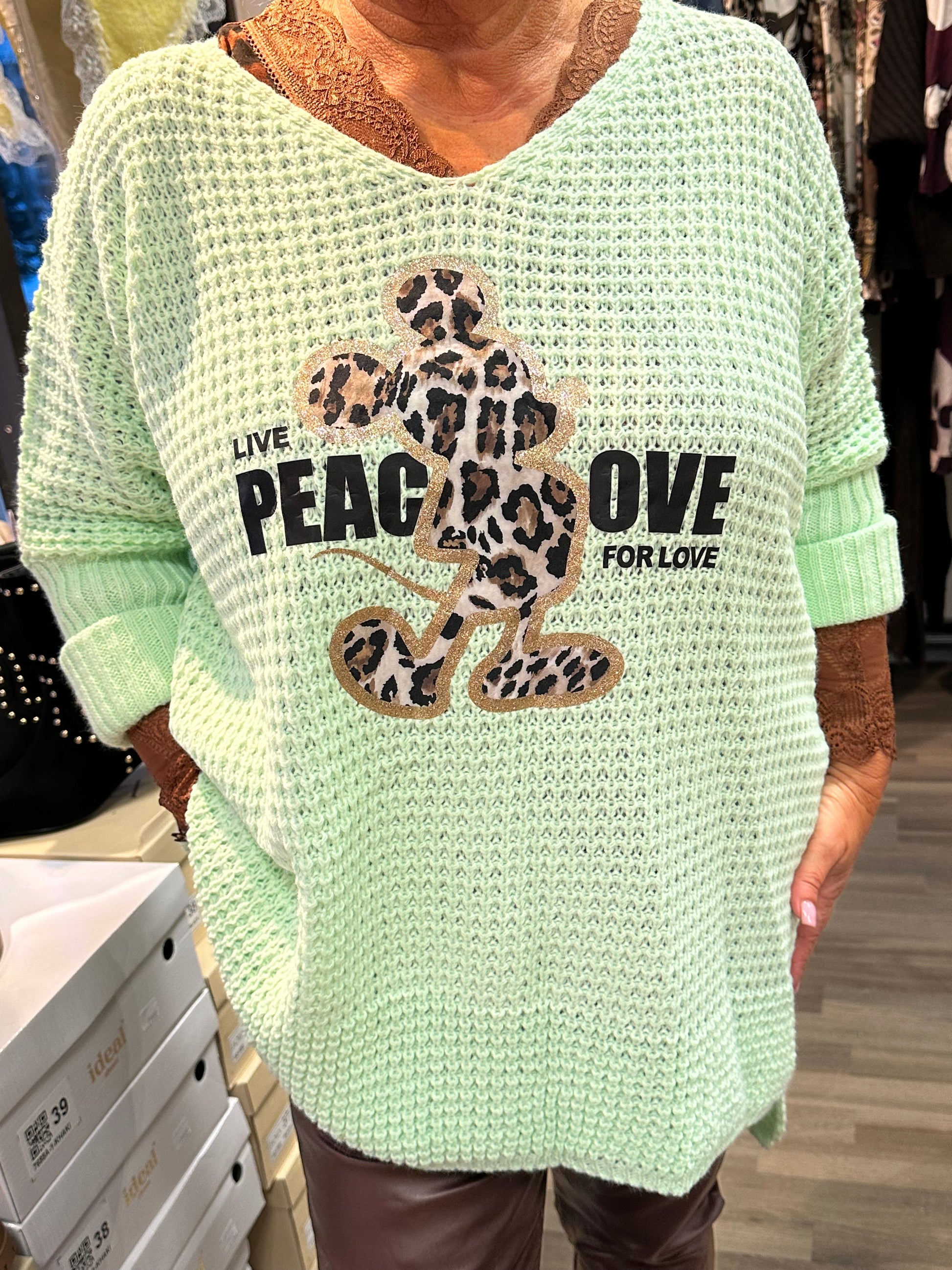 Rennon oversize-mitoituksen neule kauniilla vohvelineuloksella ja V-pääntiellä. Pitkät, joustavat hihansuut tekevät neuleesta helpon kerrostaa takin alle. Edessä hillitty teksti ja tietenkin Mikki kruunaamassa ilmeen!