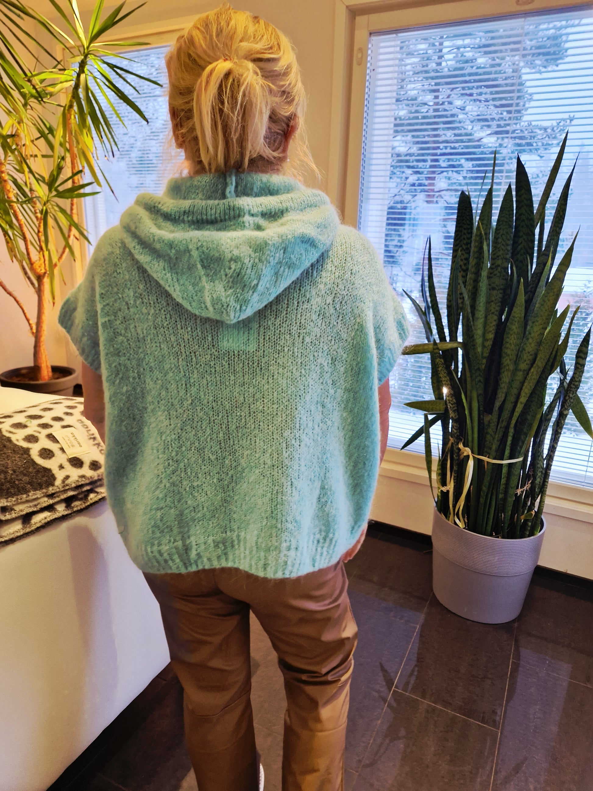 Pehmeää mohairia, leveähkö lyhyt liivi ja huppu. Alle voi pukea vaikkapa paitiksen tai trikoon.