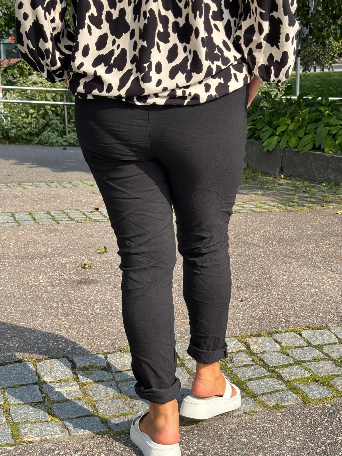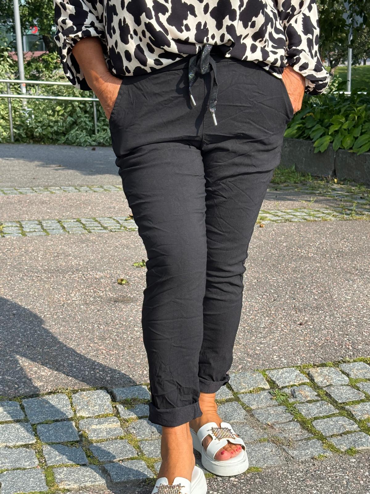 Joustavat, kevyet viskoosihousut. Joustava vyötärö, jossa nyöri. Edessä taskut.