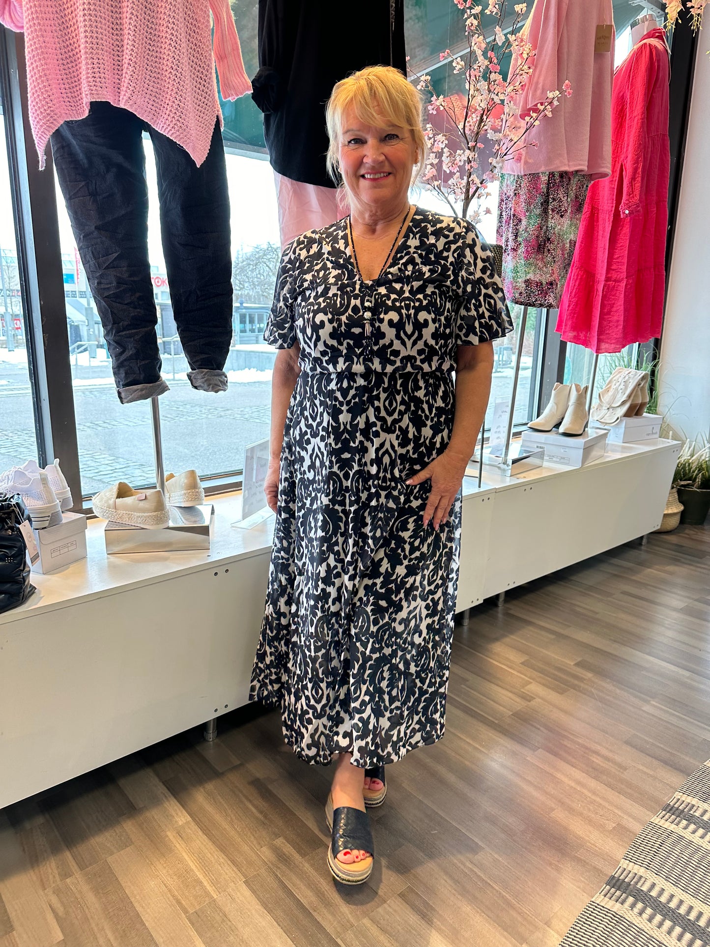 Pitkä sifonkimekko viskoosivuorella ja perhoshihoilla. Vyötäröllä joustava kuminauha. V-pääntie.