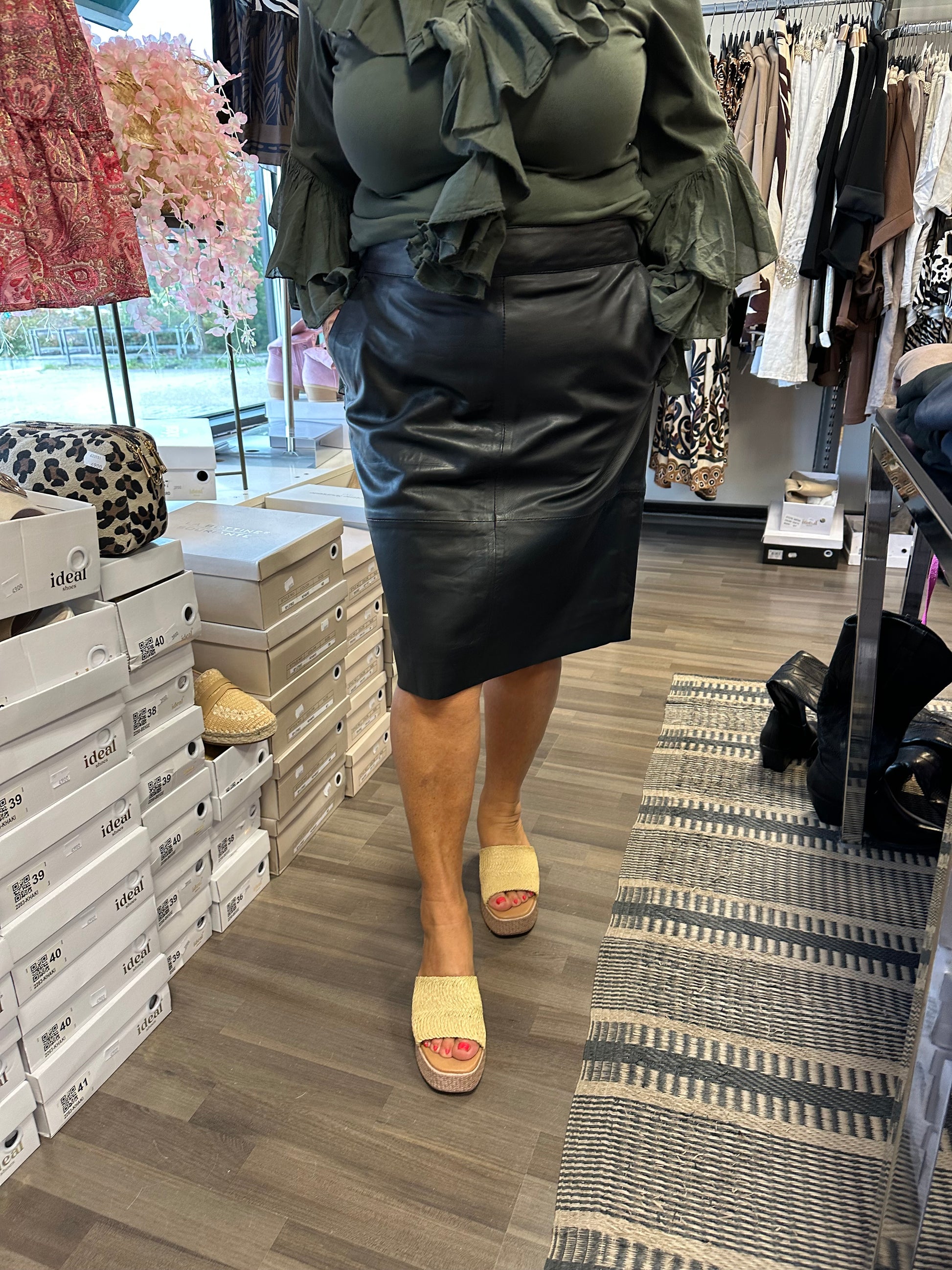 Pehmeä a-linjainen nahkahame korkealla vyötäröllä. Taskut sivuilla ja takana vetoketju ja pieni halkio. Alla vuori.