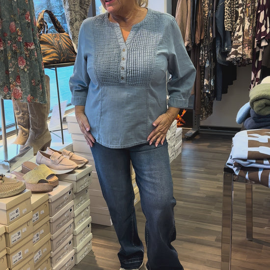 Naisellinen farkkupusero pehmeää puuvillaa. Kaunis tyköistuva leikkaus ja edessä laskos-yksityiskohta ja napit. Vajaamittaiset hihat.