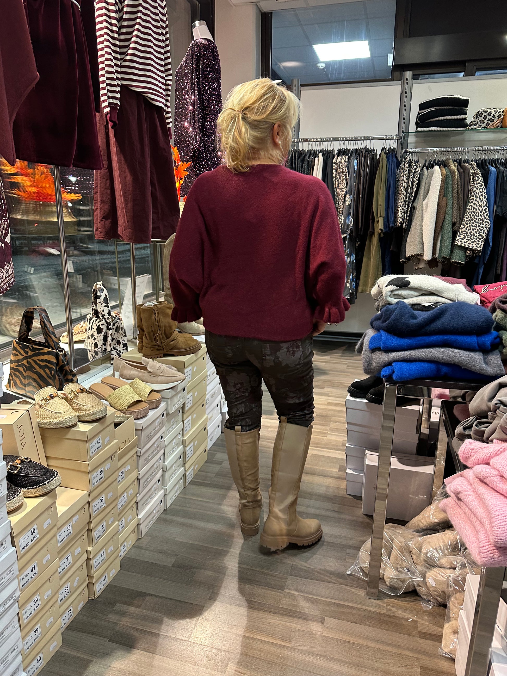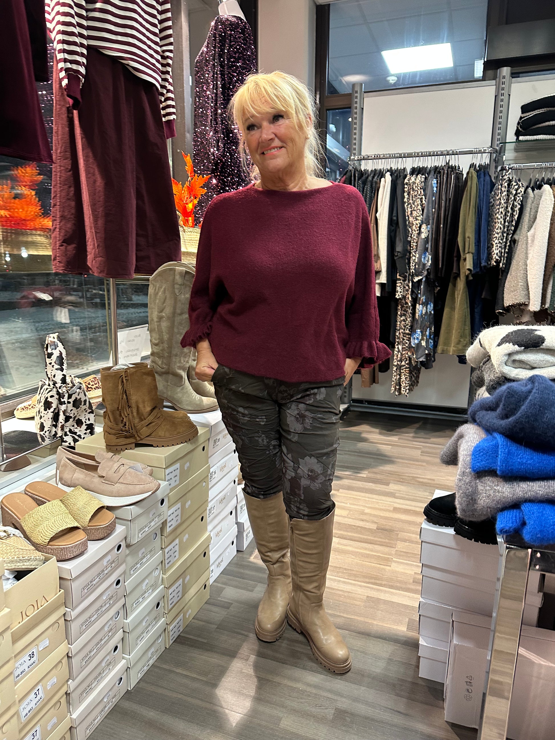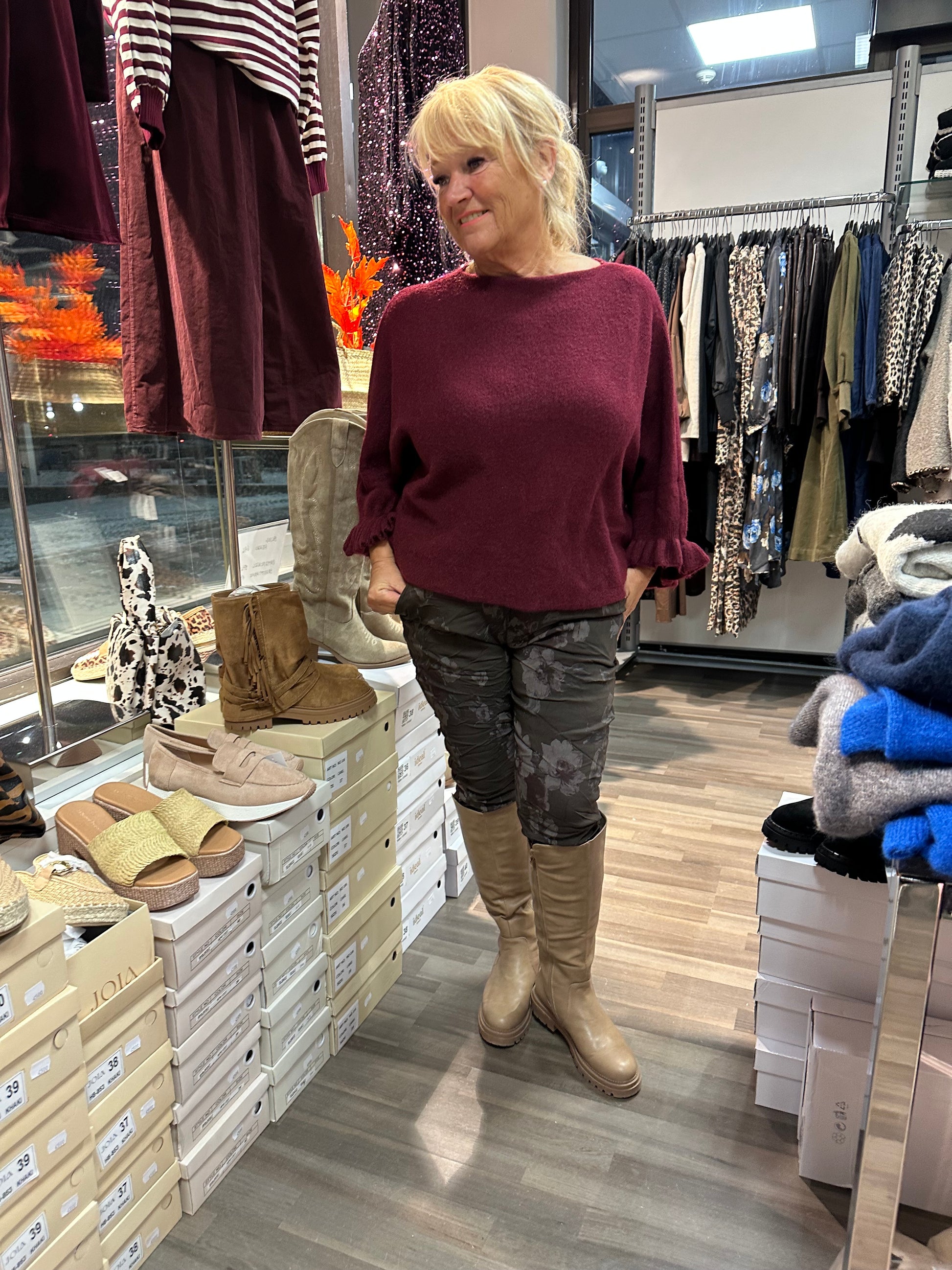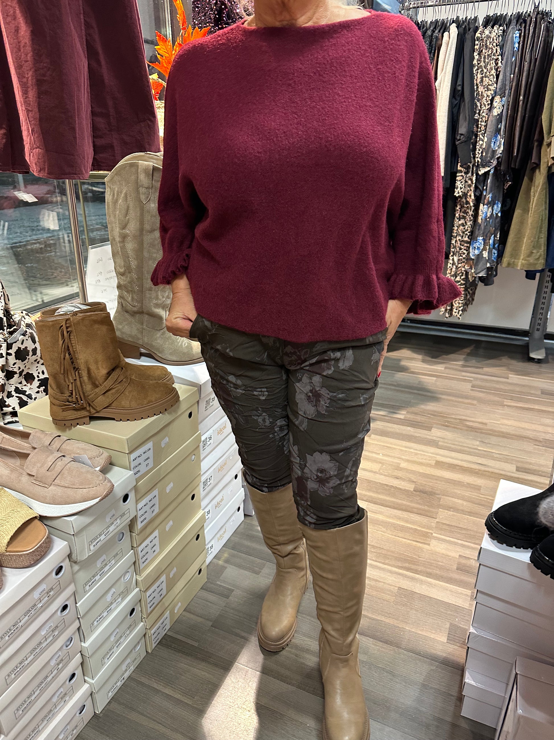 Neule frillahihoilla viininpunainen