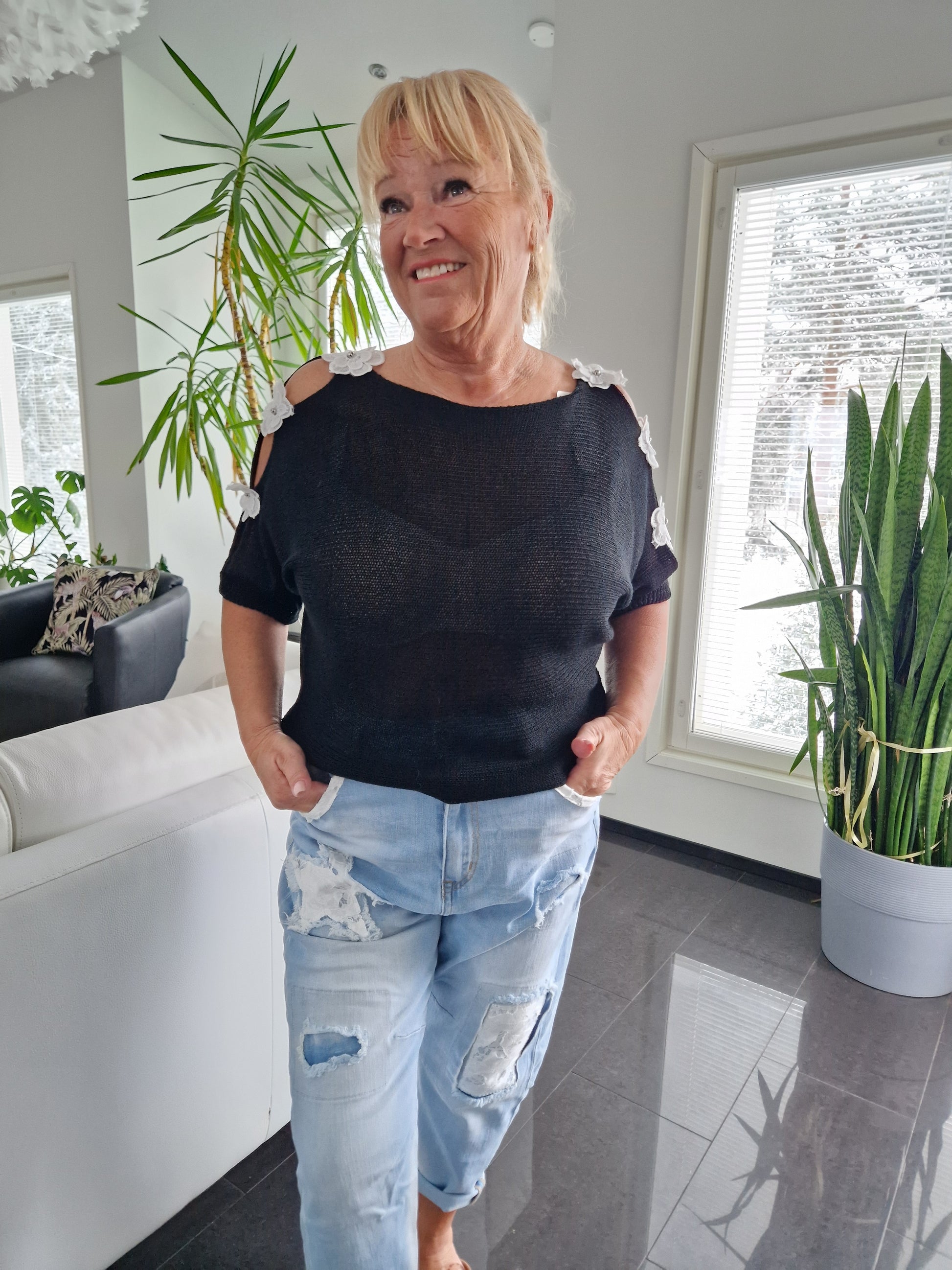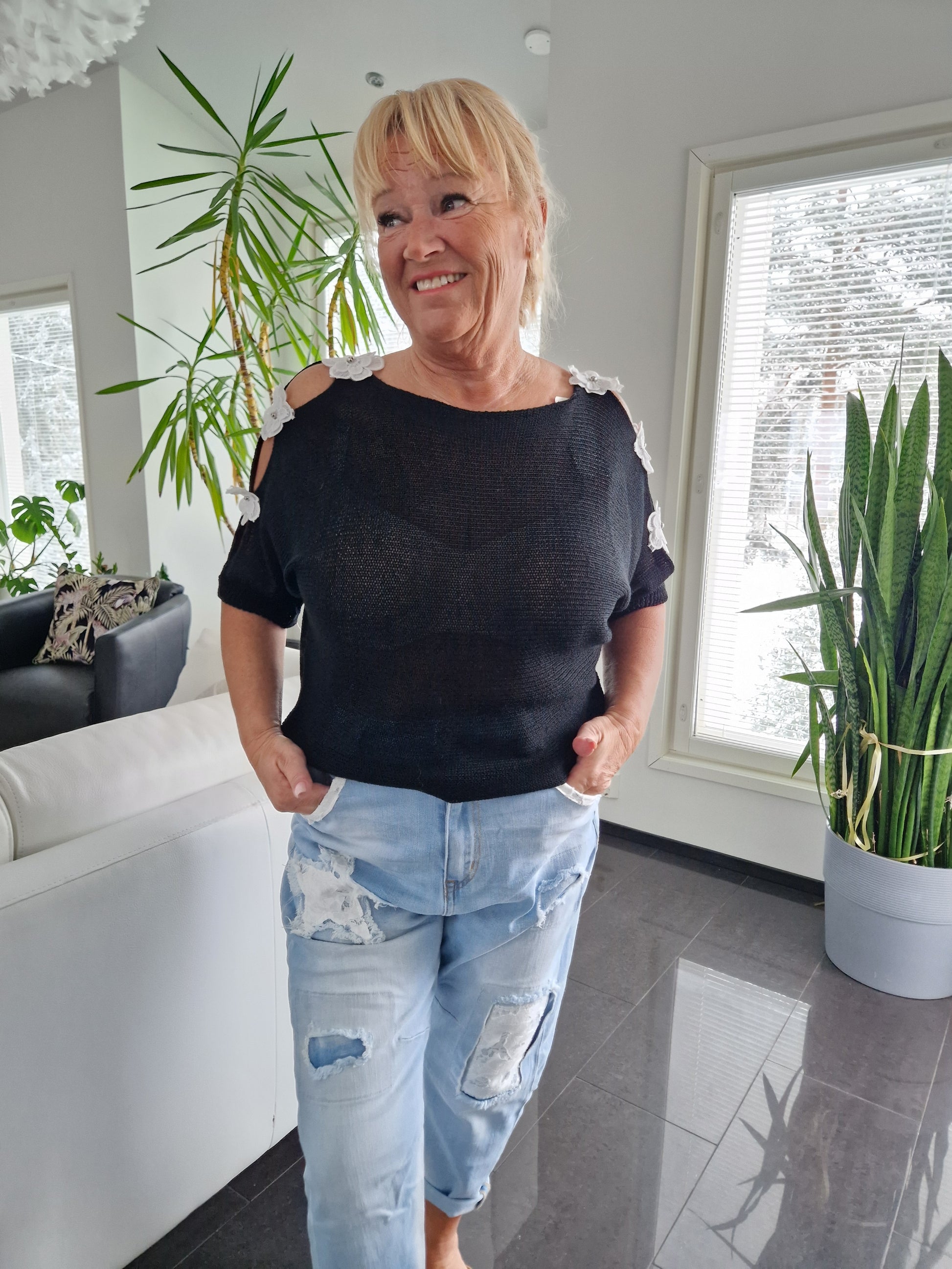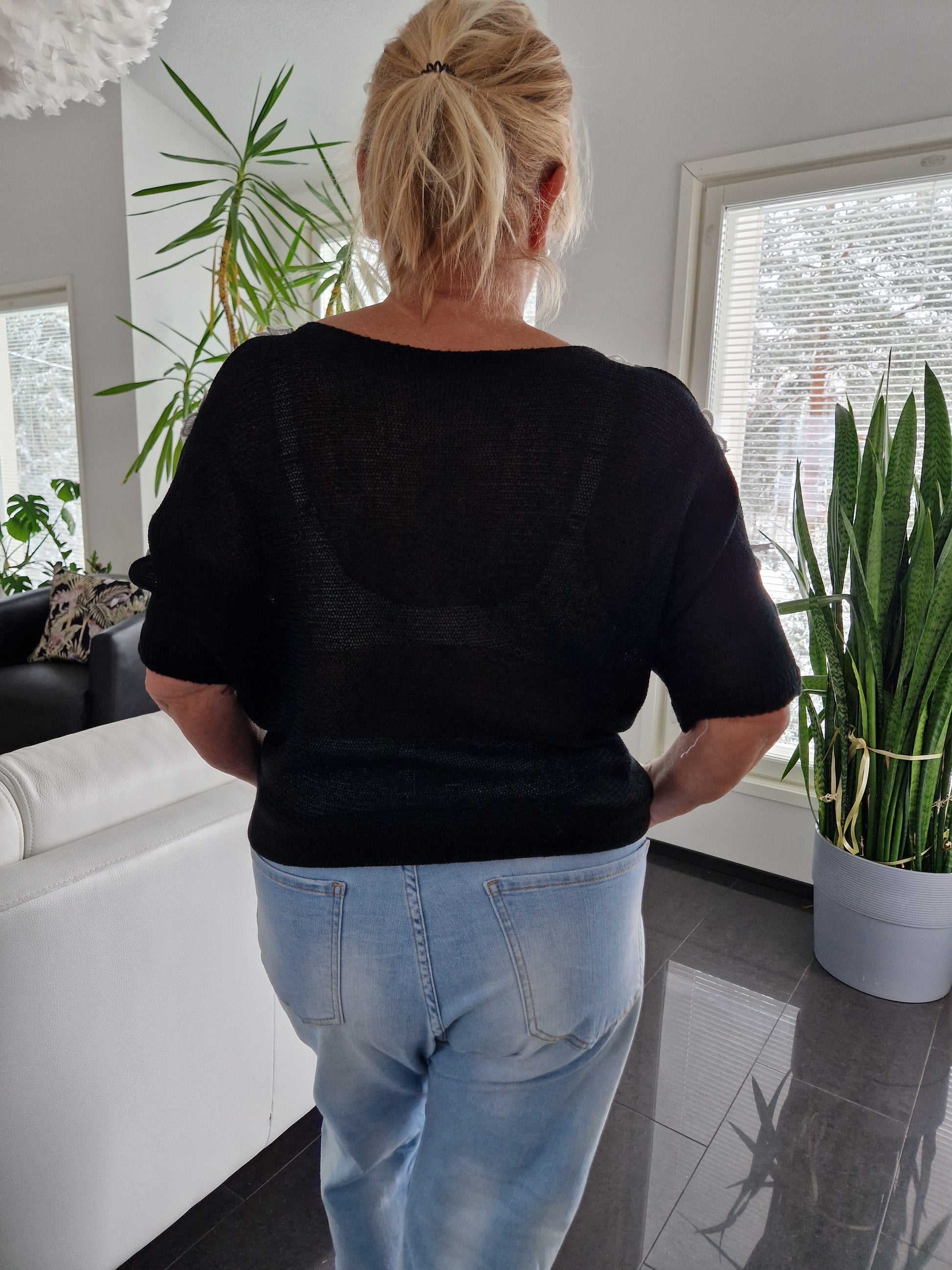 Neule kukkakoristeilla musta
