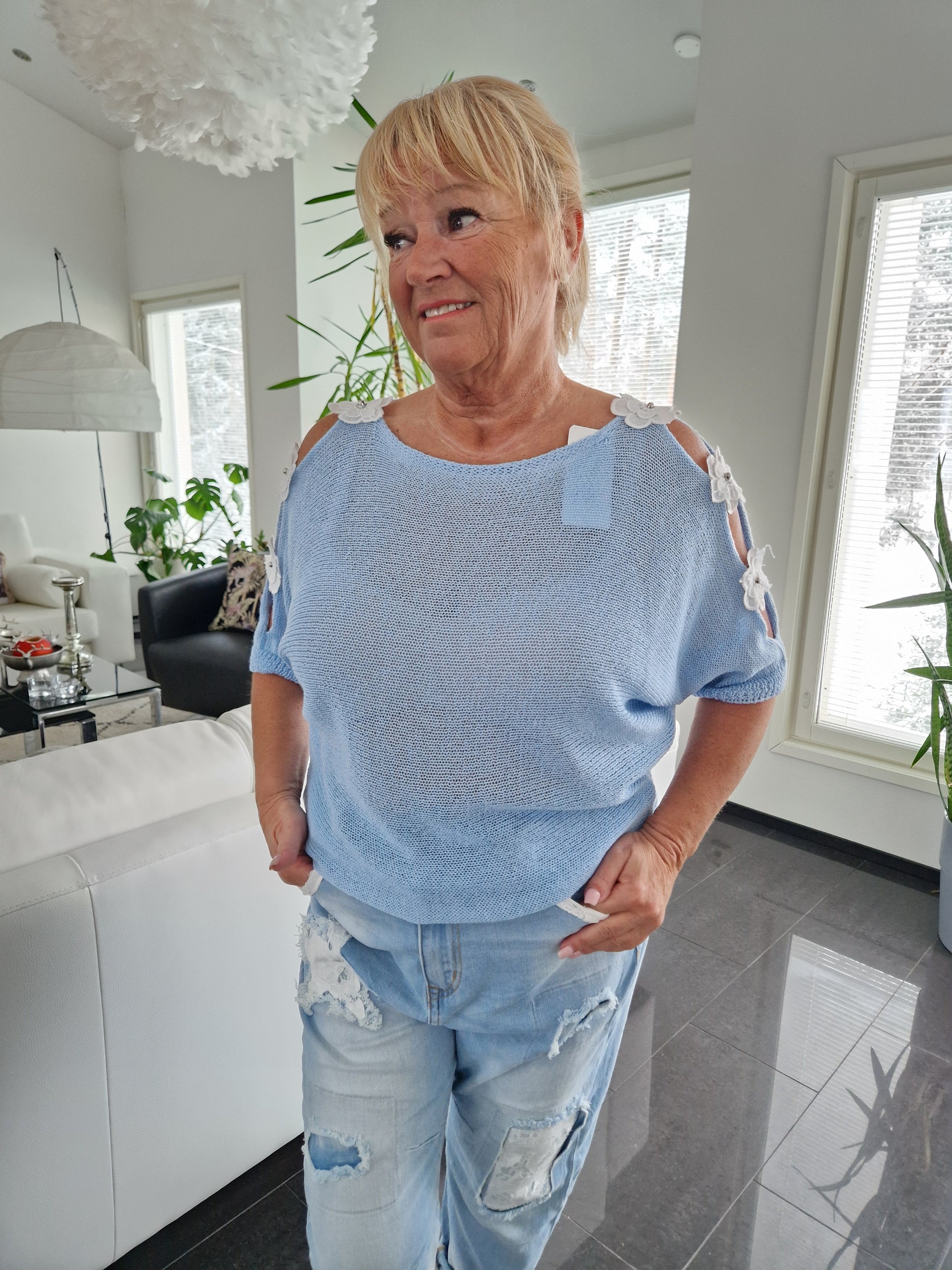 Neule kukkakoristeilla vaalean sininen