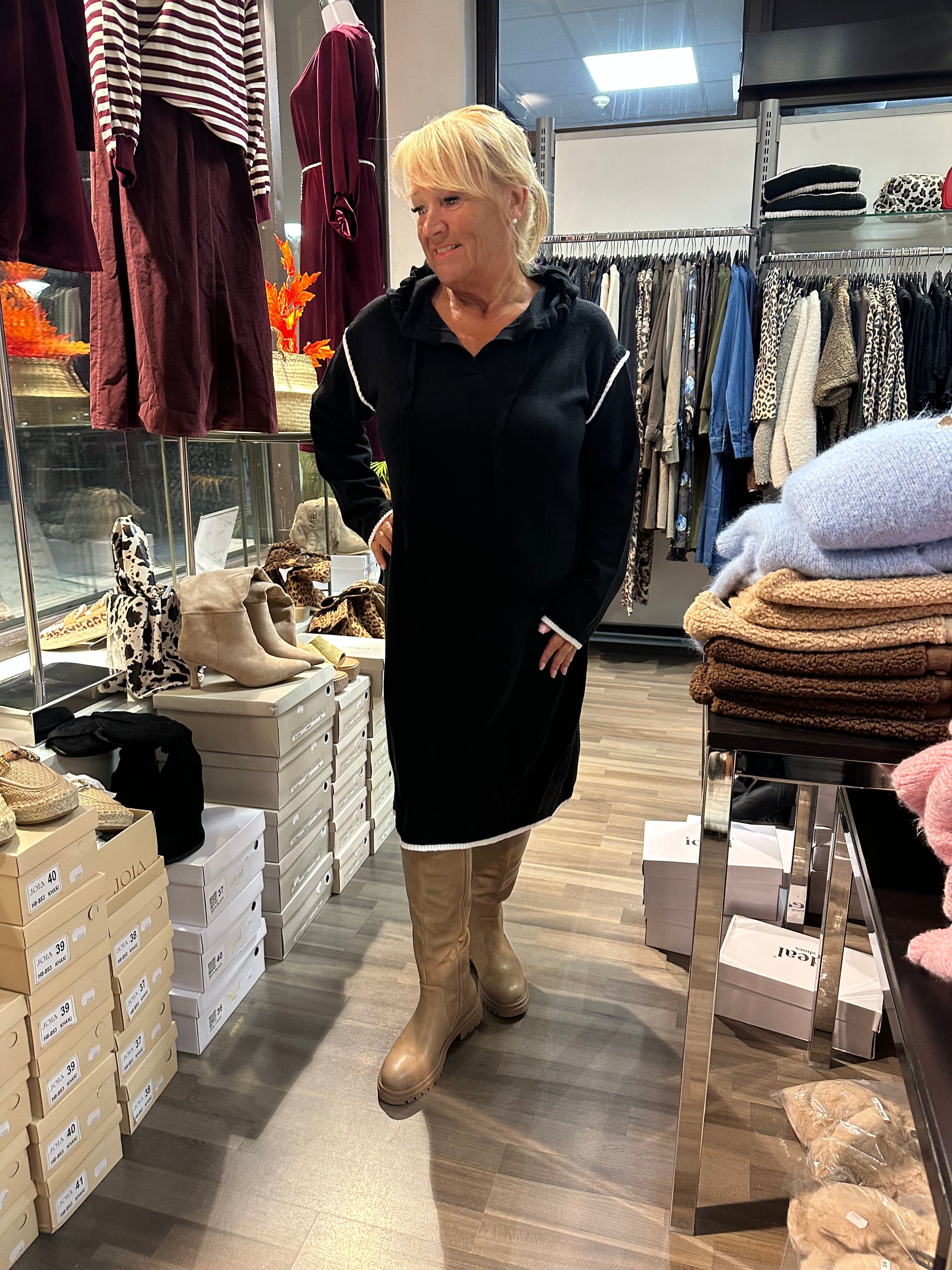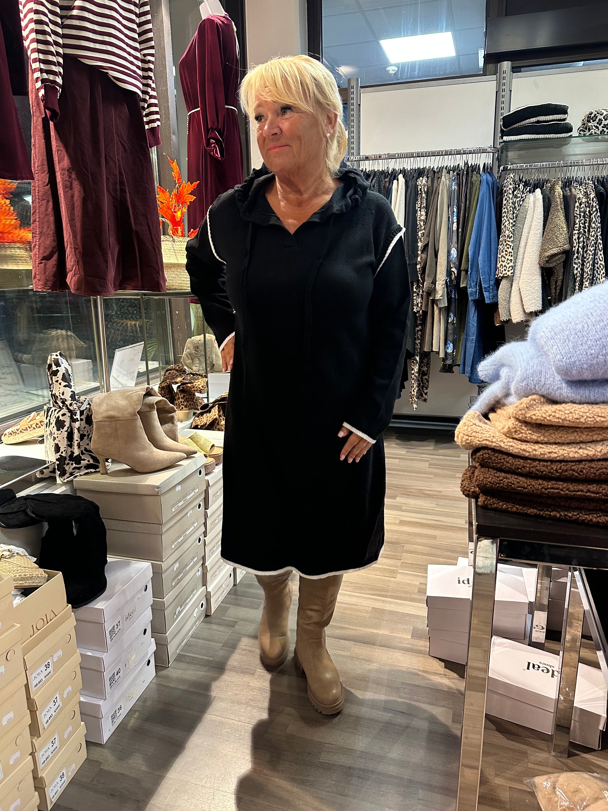Neulehupparimekko mukavaa sileäpintaista neulosta. Kiva valkoinen raita yksityiskohta olkapäillä, hihansuissa ja helmassa.