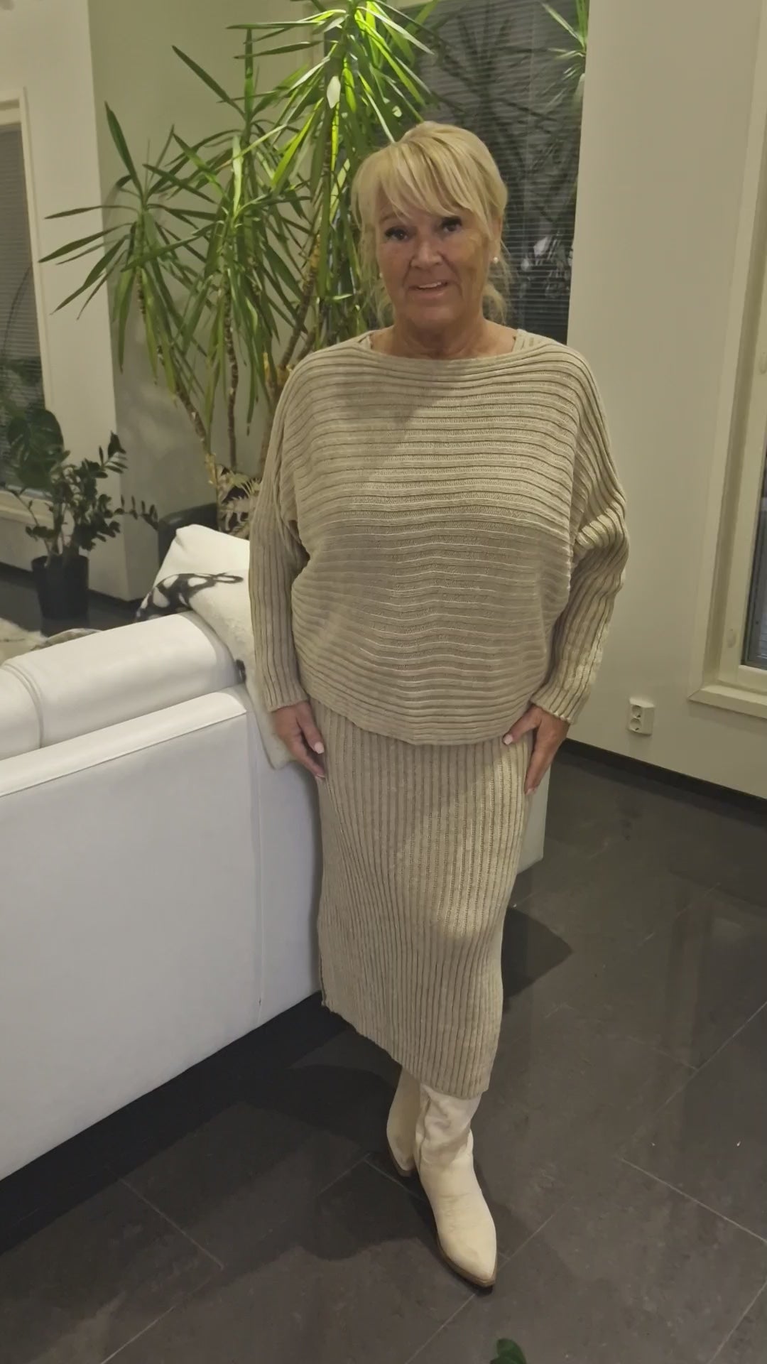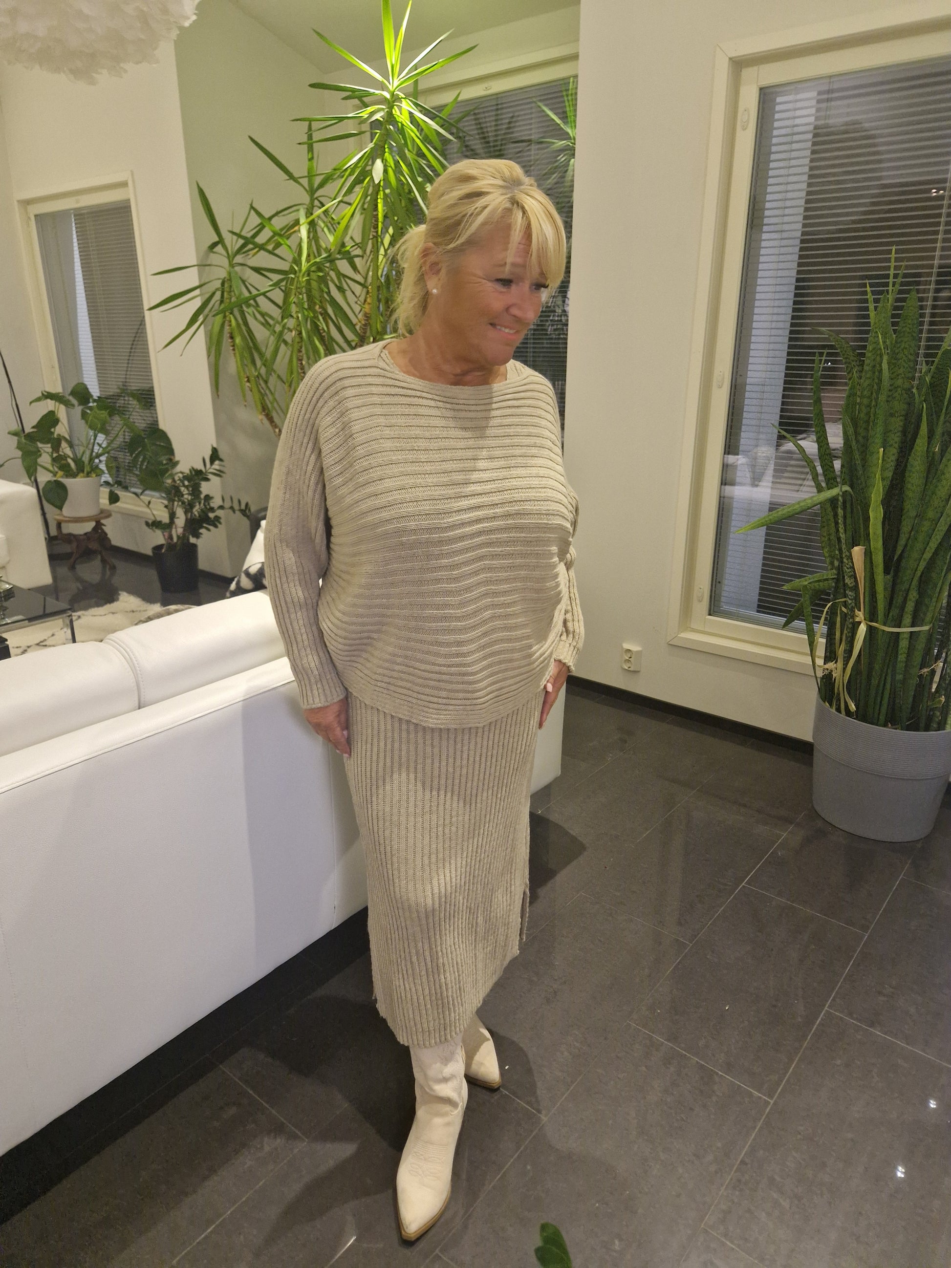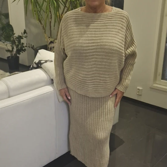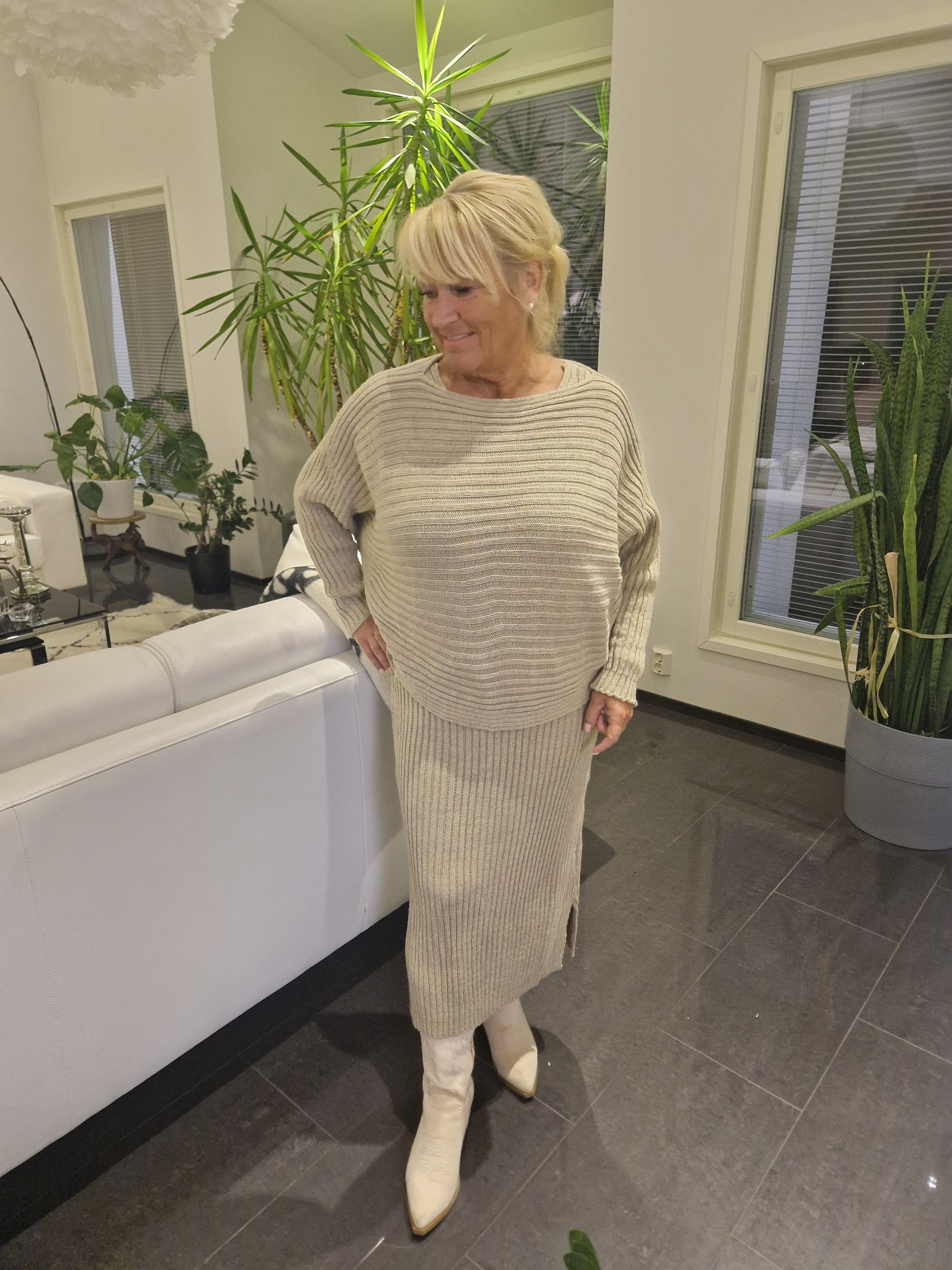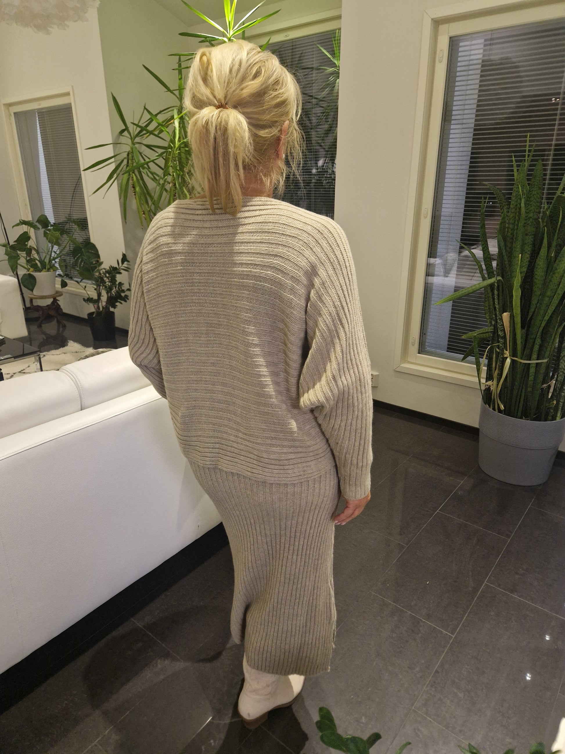 Makee midimittainen ribattu neulemekko- ja neulesetti! Joustavaa ja pehmeää neuletta. Mekko on hihaton ja neule leveä lepakkohihainen malli.