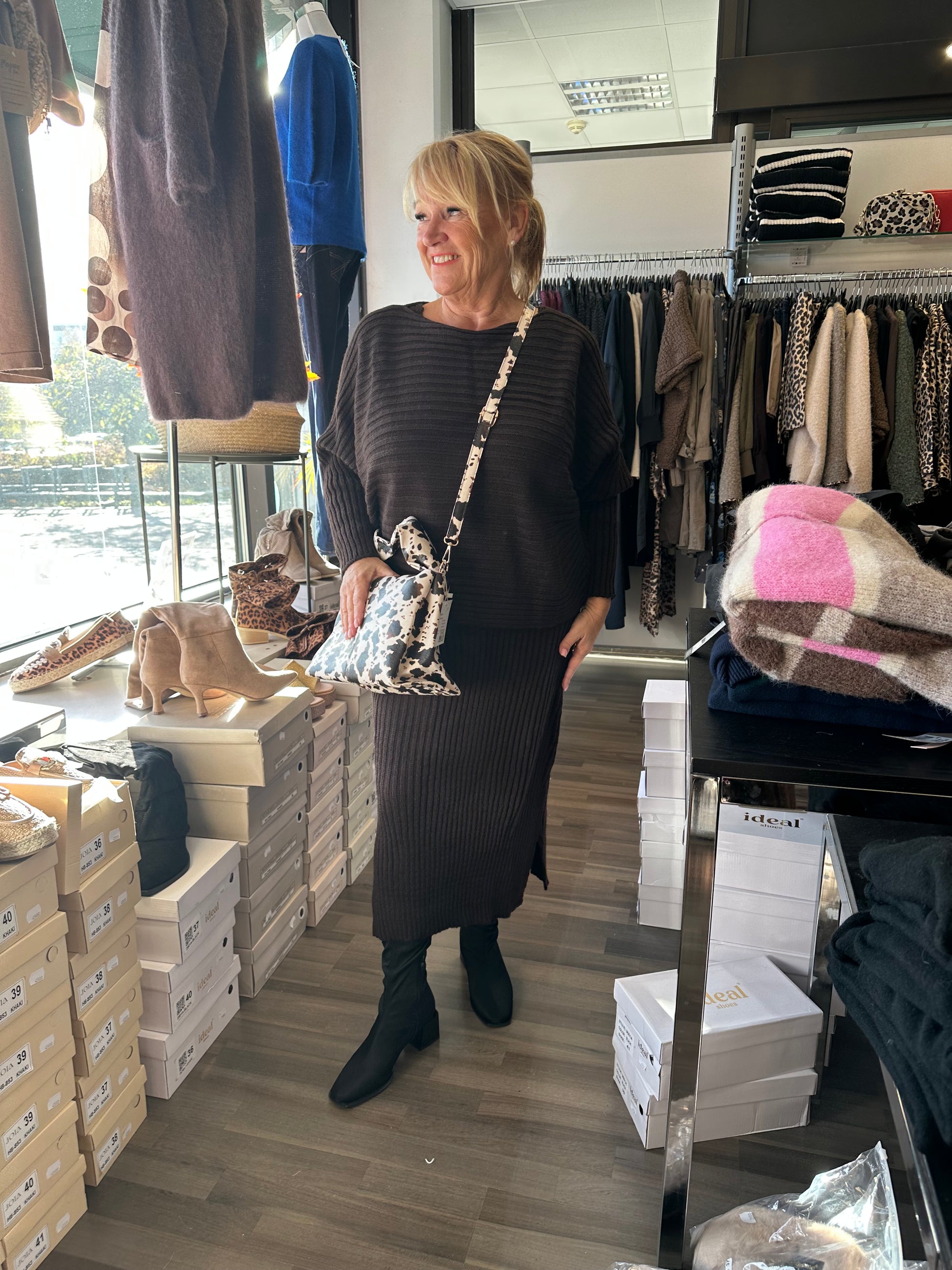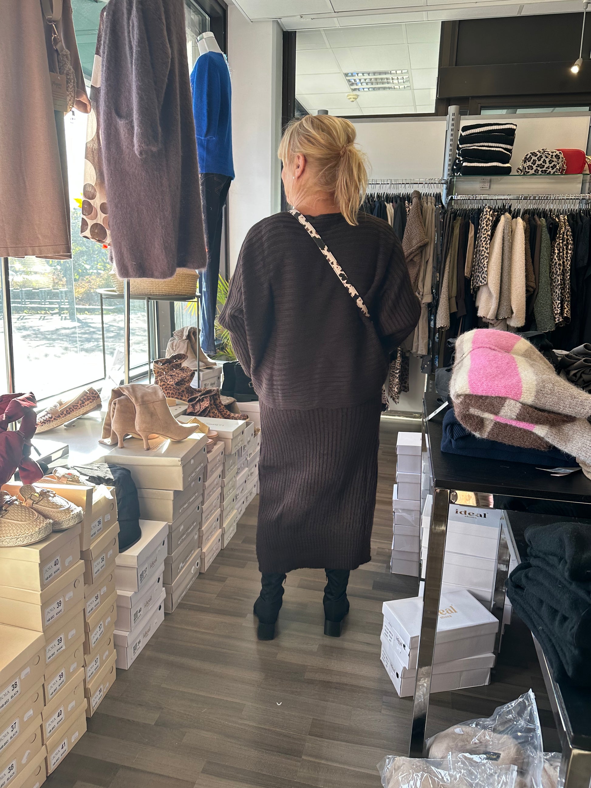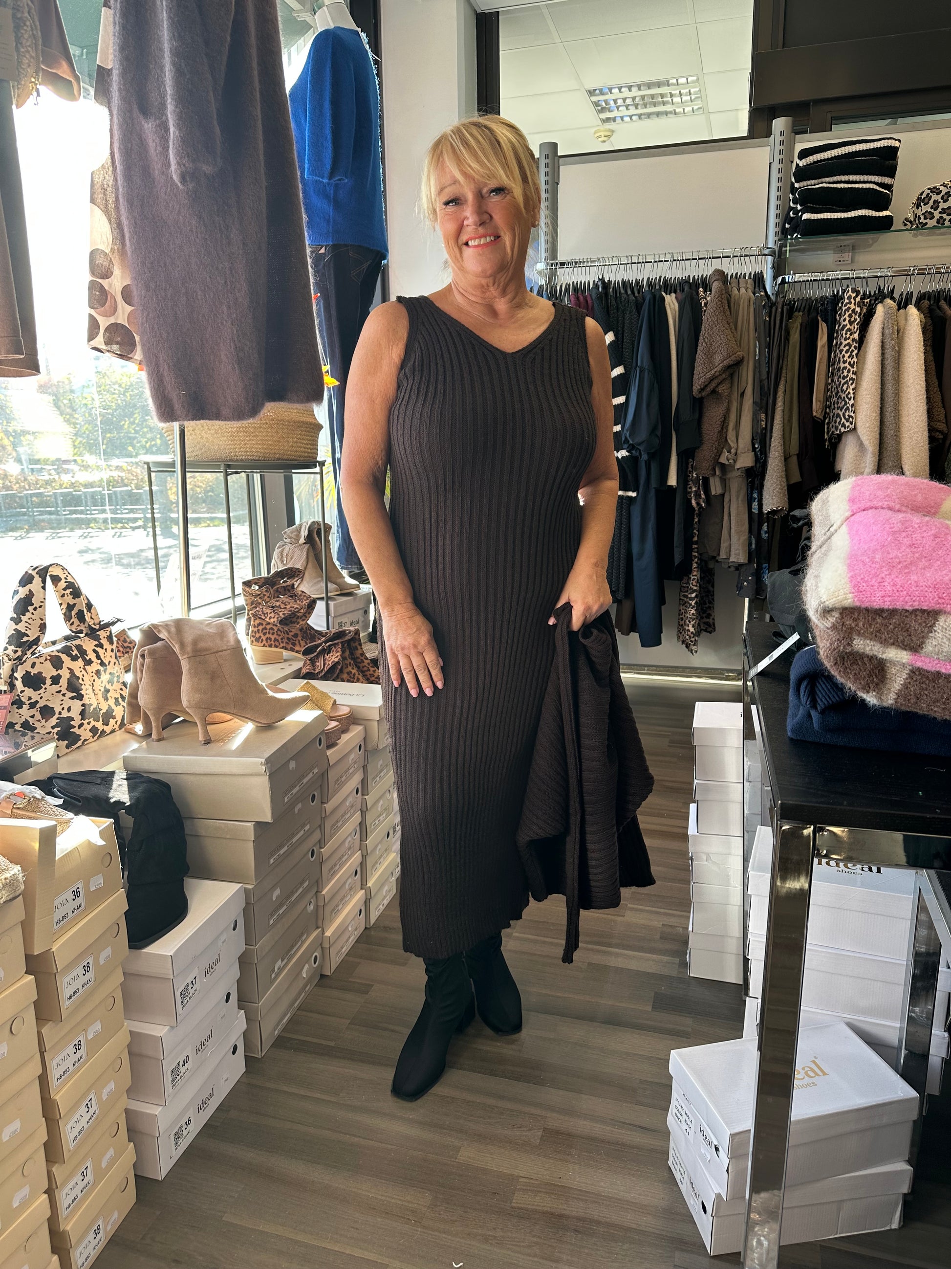 Makee midimittainen ribattu neulemekko- ja neulesetti! Joustavaa ja pehmeää neuletta. Mekko on hihaton ja neule leveä lepakkohihainen malli.