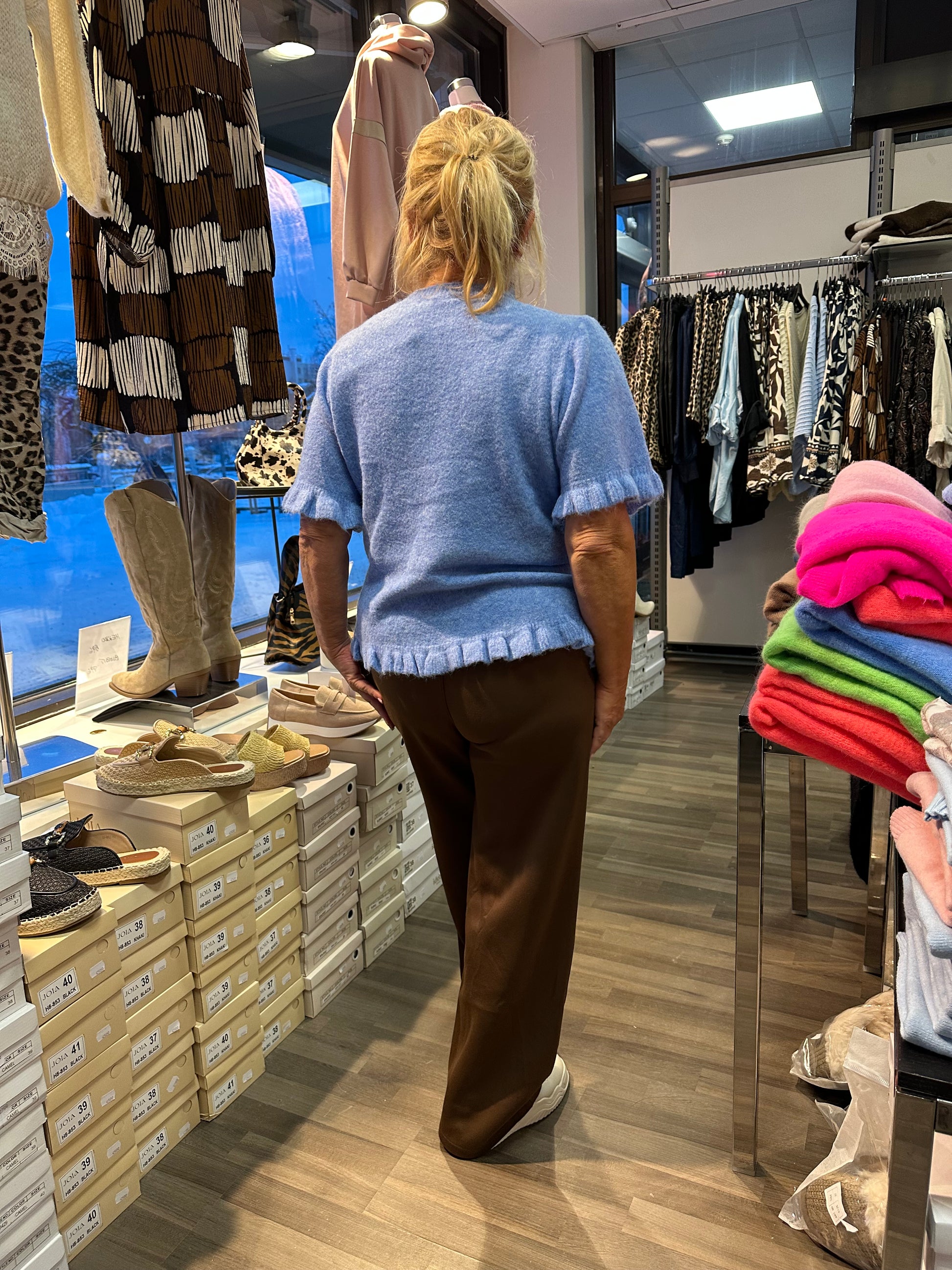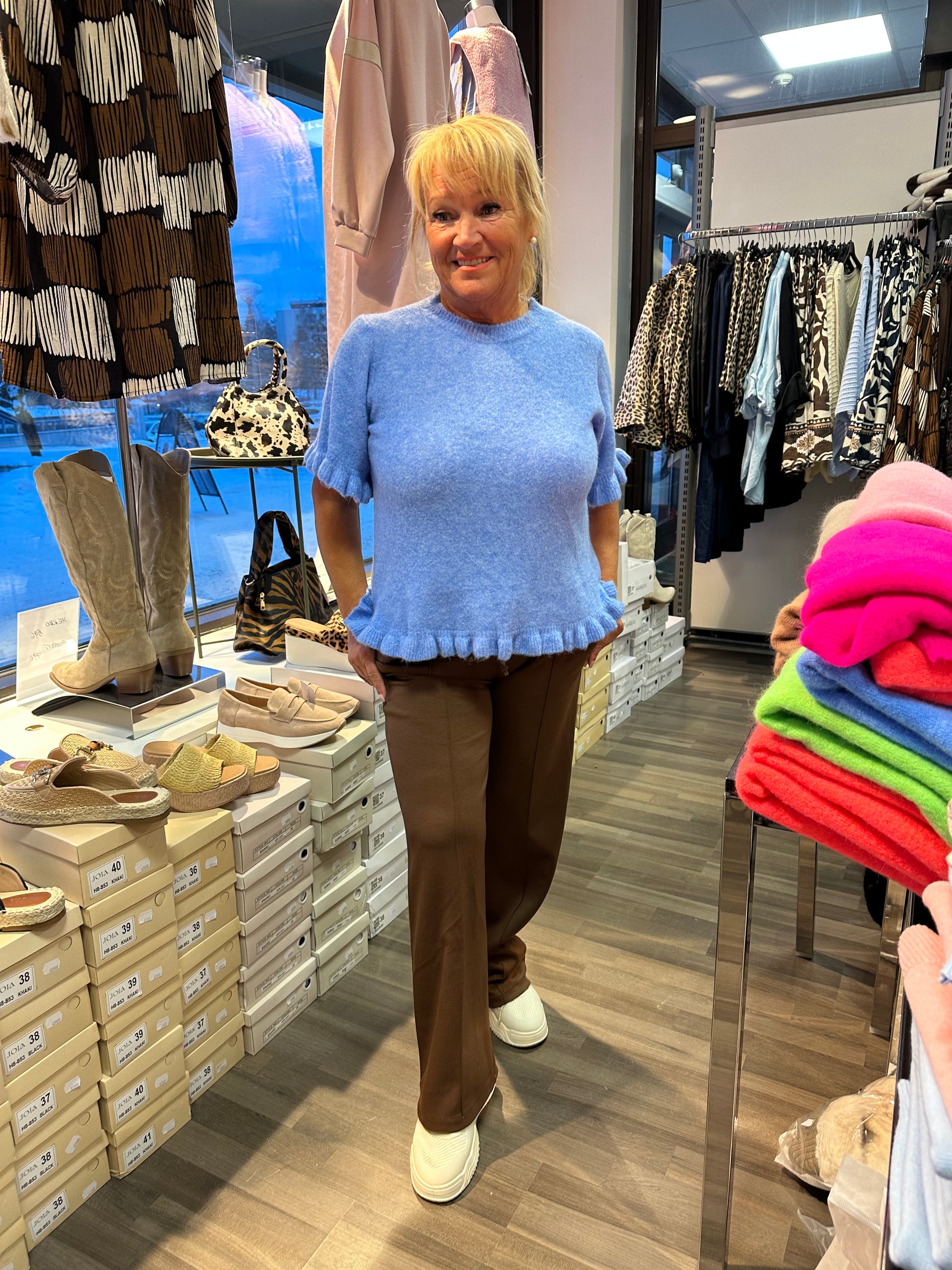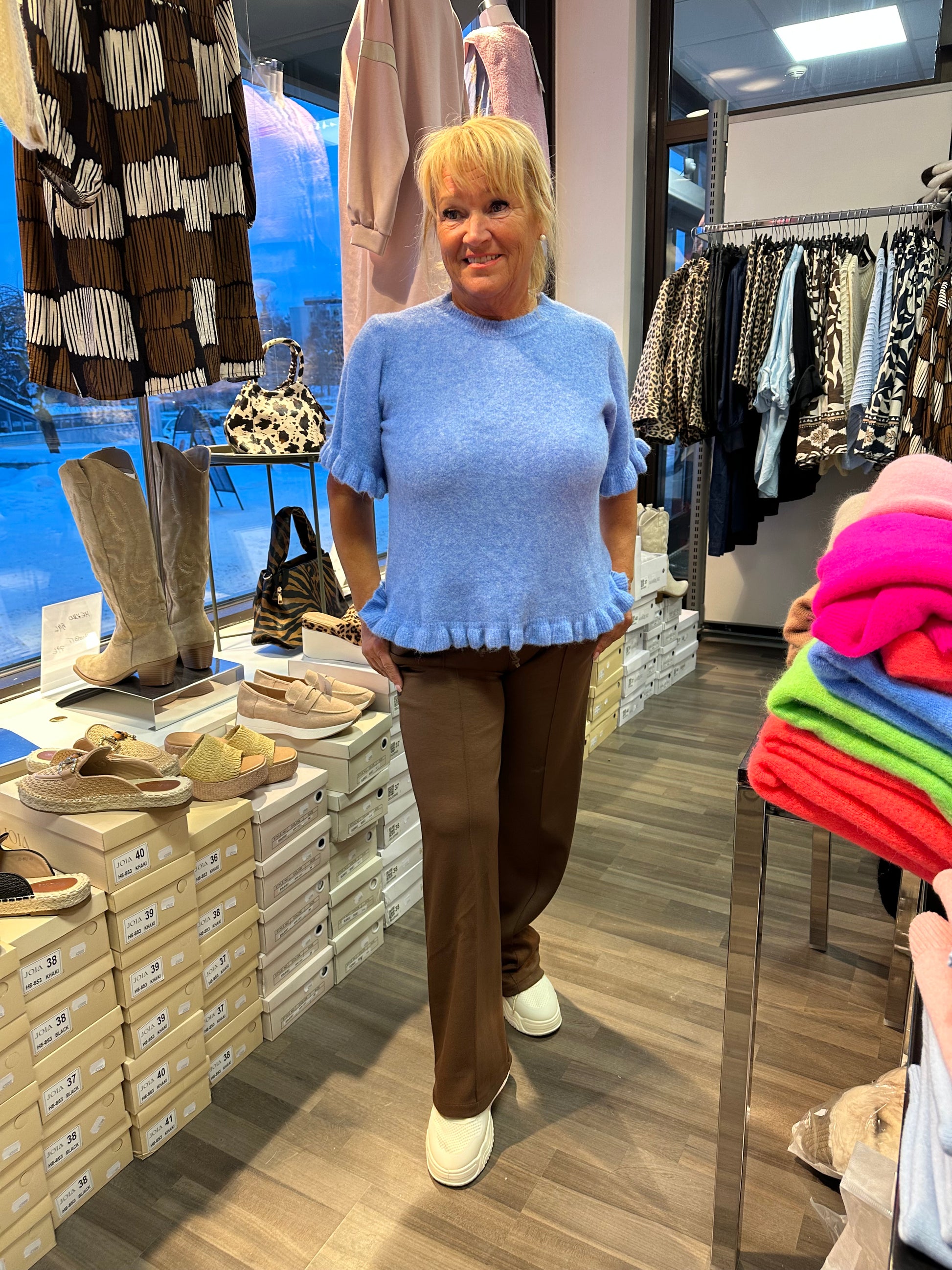 Suloinen neule frillahelmalla ja hihoilla! Miellyttävän pehmeää neuletta. Suora malli.
