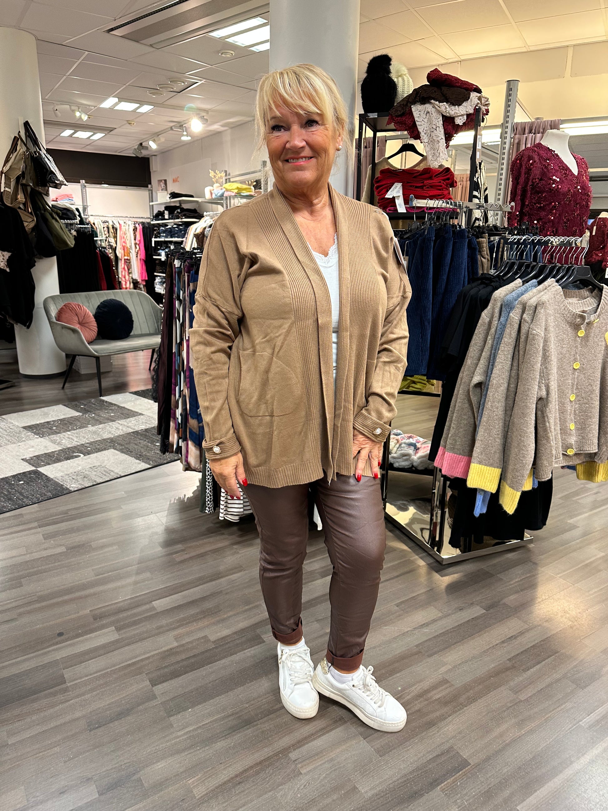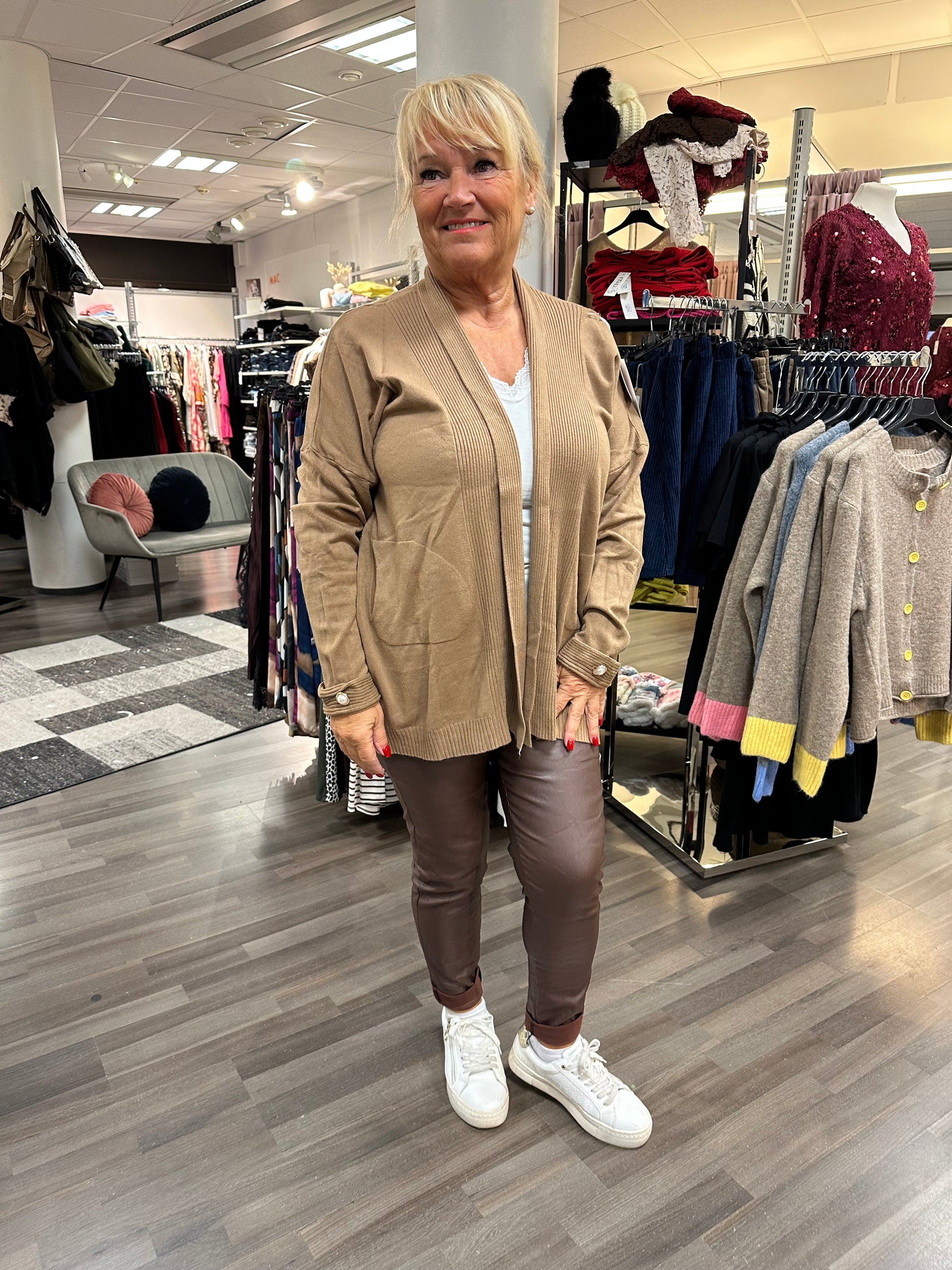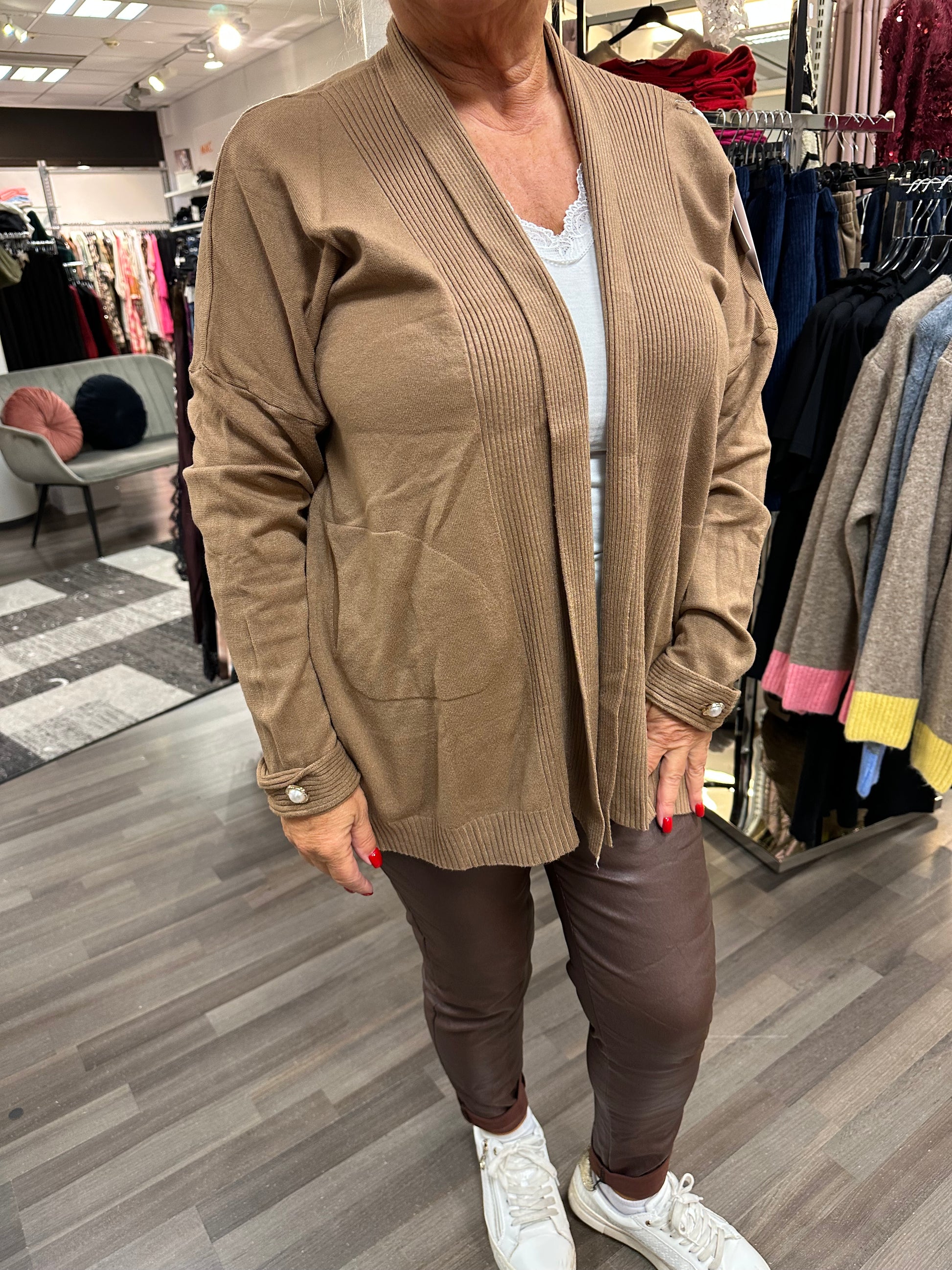 Mukavan tuntuinen neuletakki joustavaa ja kevyttä neulosta. Reunoilla kiva resori ja hihansuissa helmikoristeet.