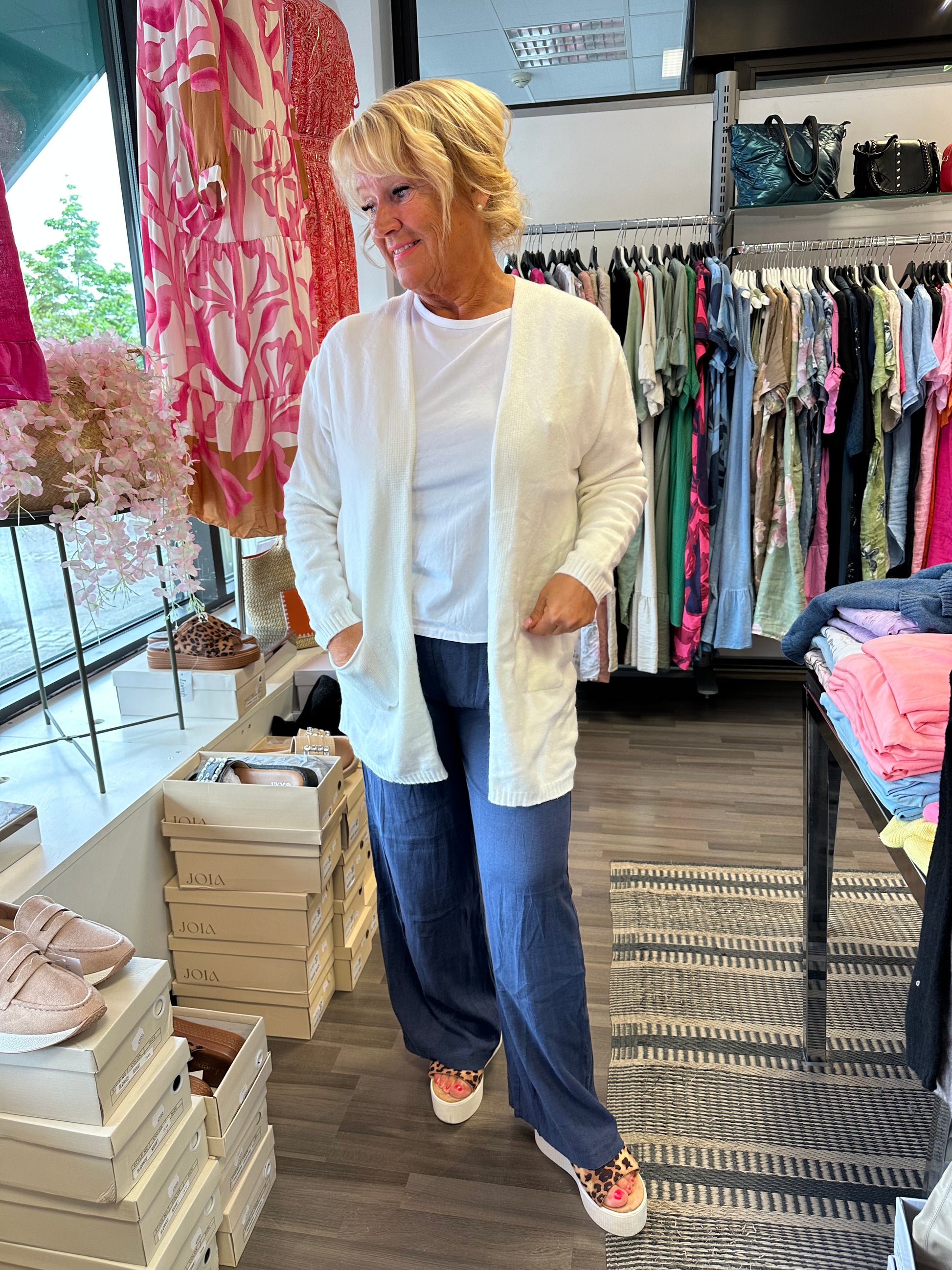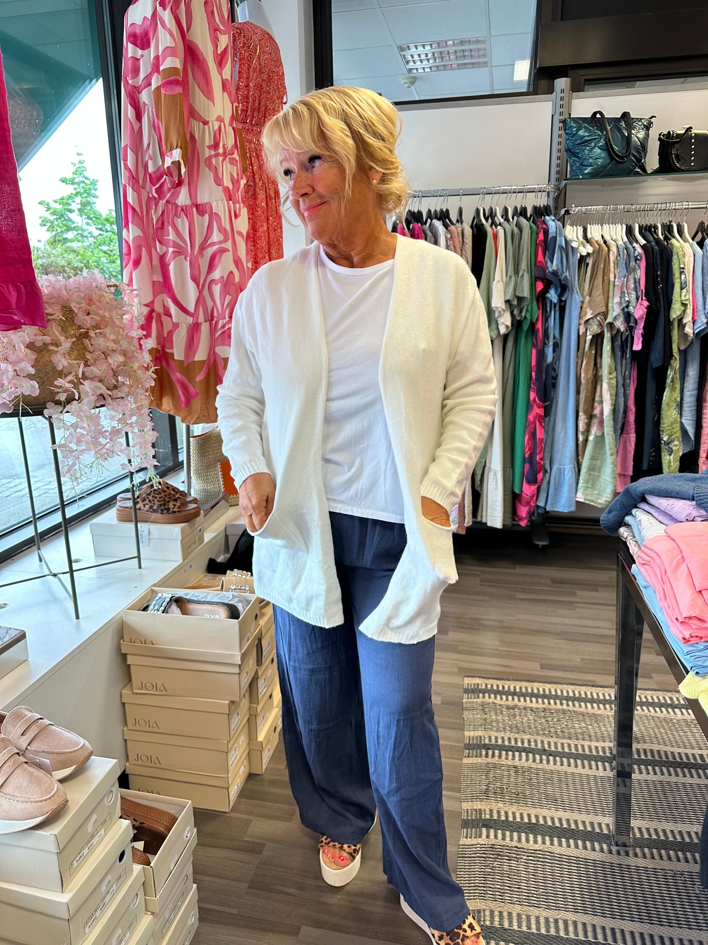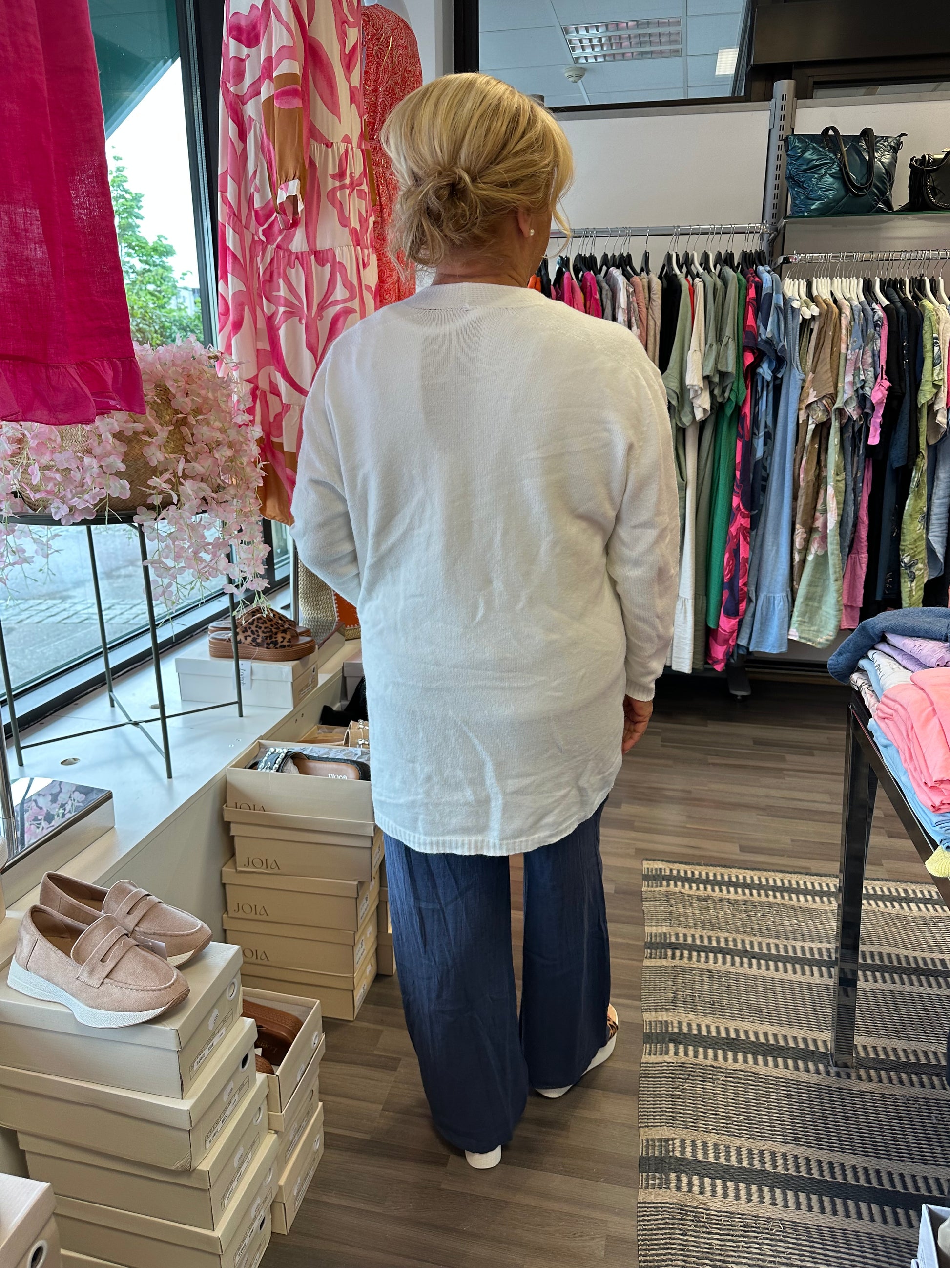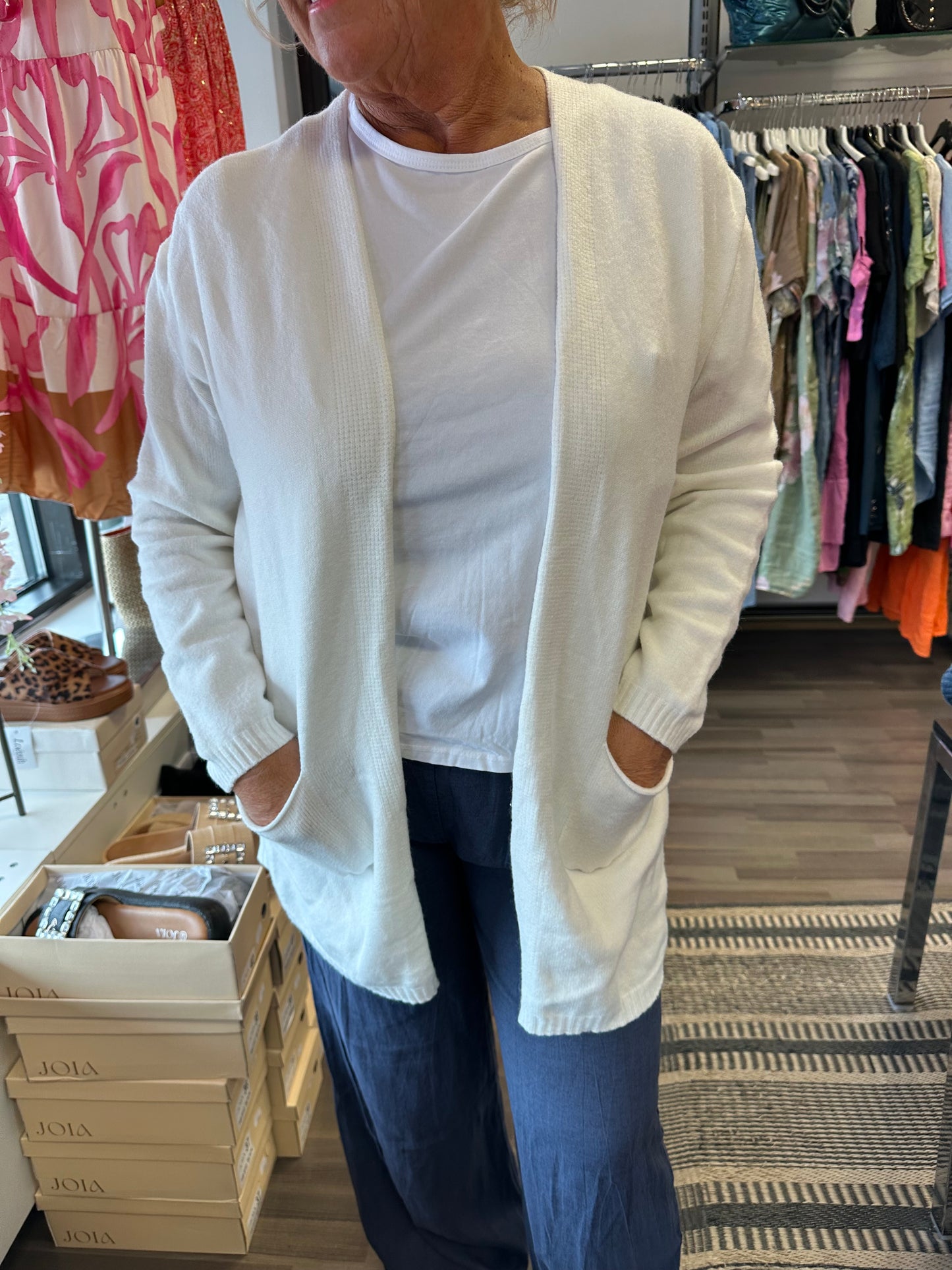 Pidempi neuletakki ilman kiinnitystä. Edessä taskut.