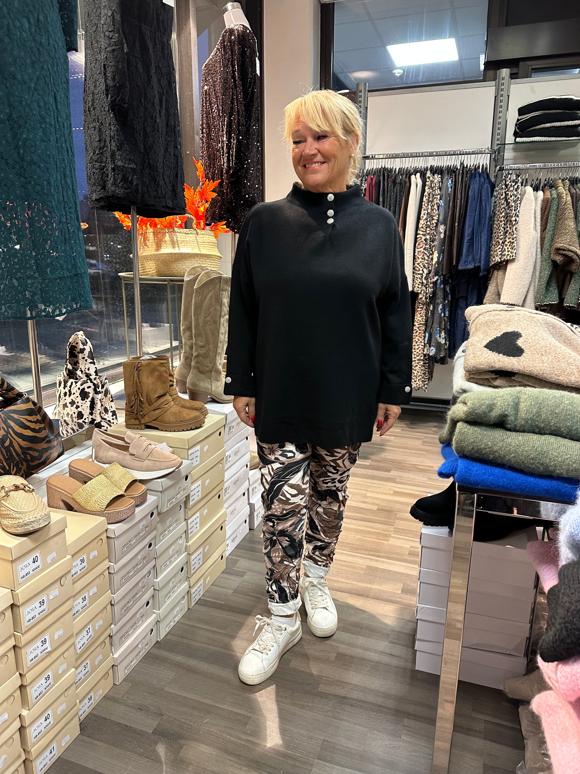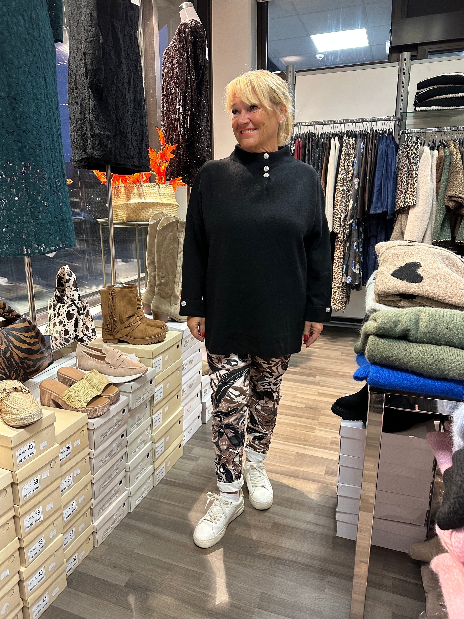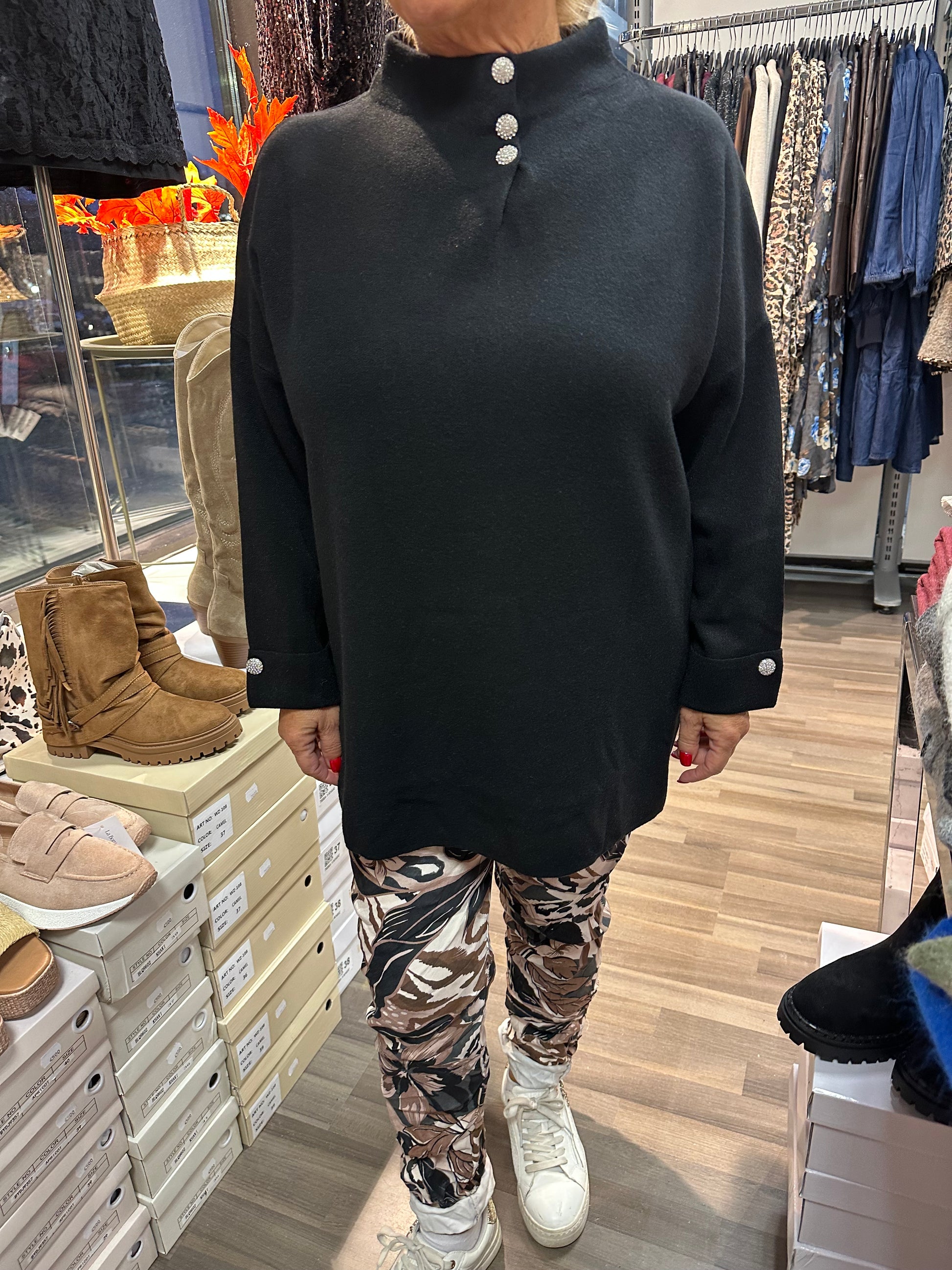 Neuletunika laadukasta tiheäneulosta ja kivoilla timanttinappikoristeilla! Vajaamittaiset hihat ja korkea kaulus, josta saa napit auki.