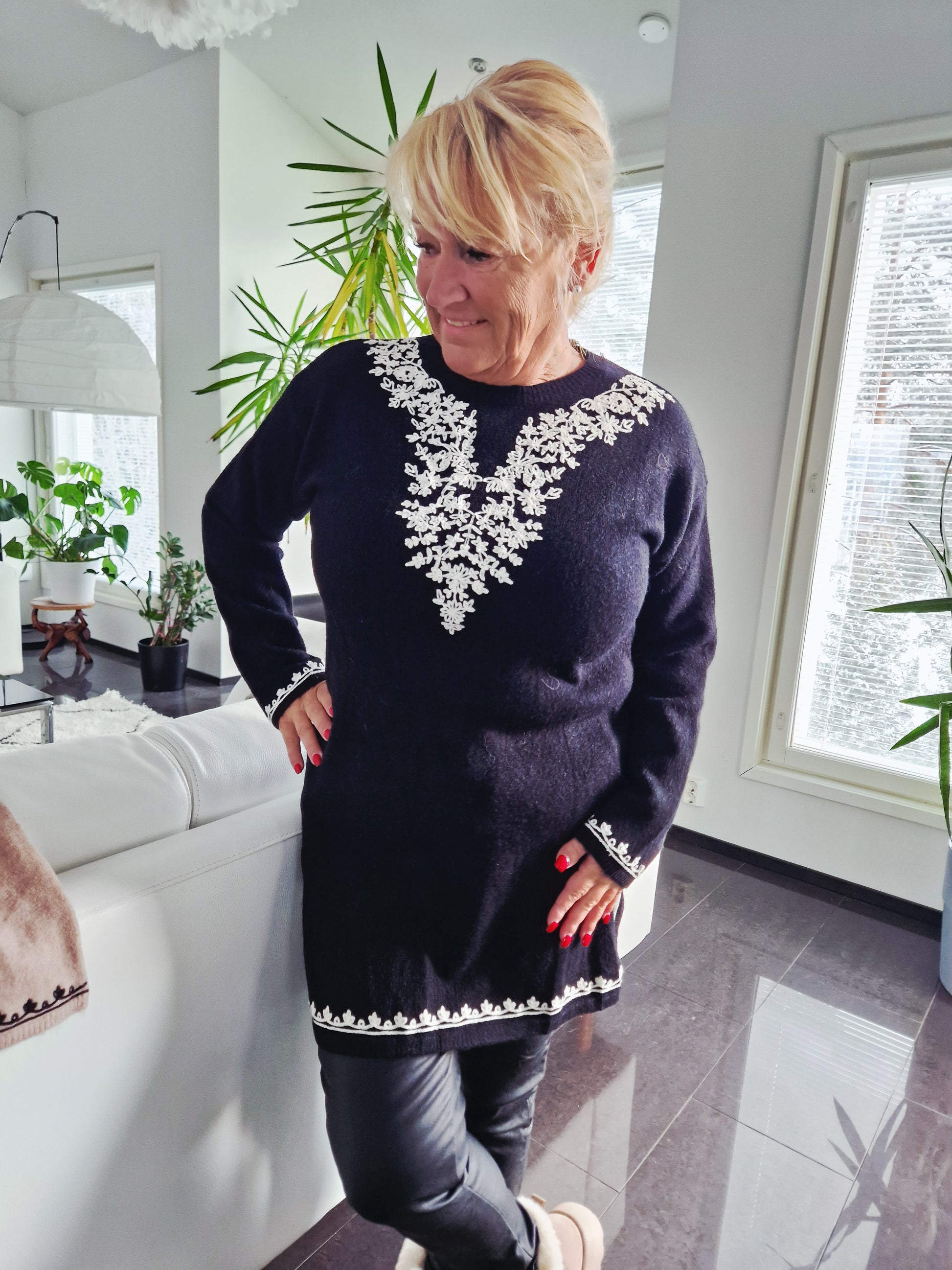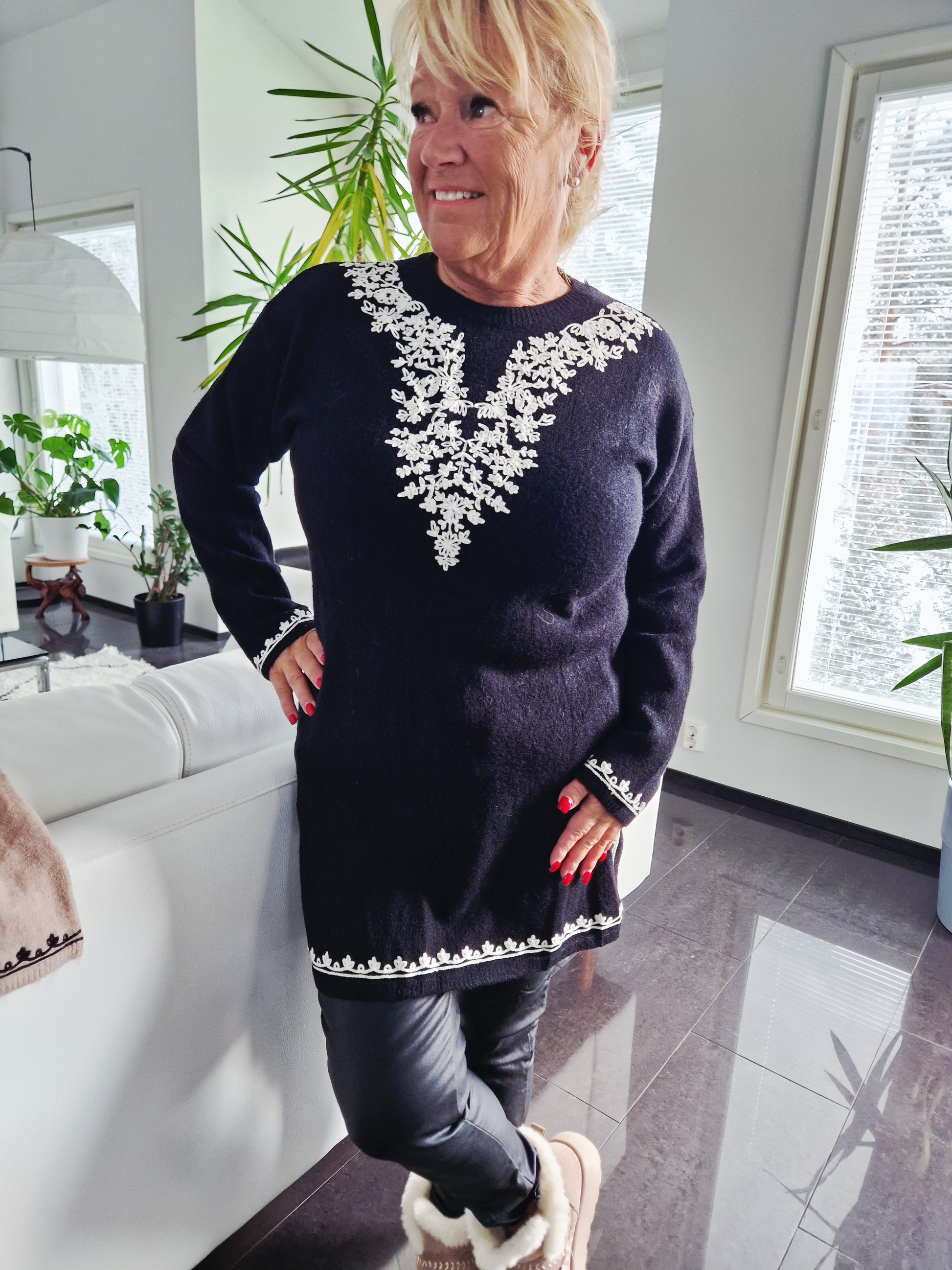 Paksuhko ja lämpimän oloinen neuletunika kivalla kirjailulla. O-pääntie, pitkät hihat. Helmassa oikkuhalkiot.