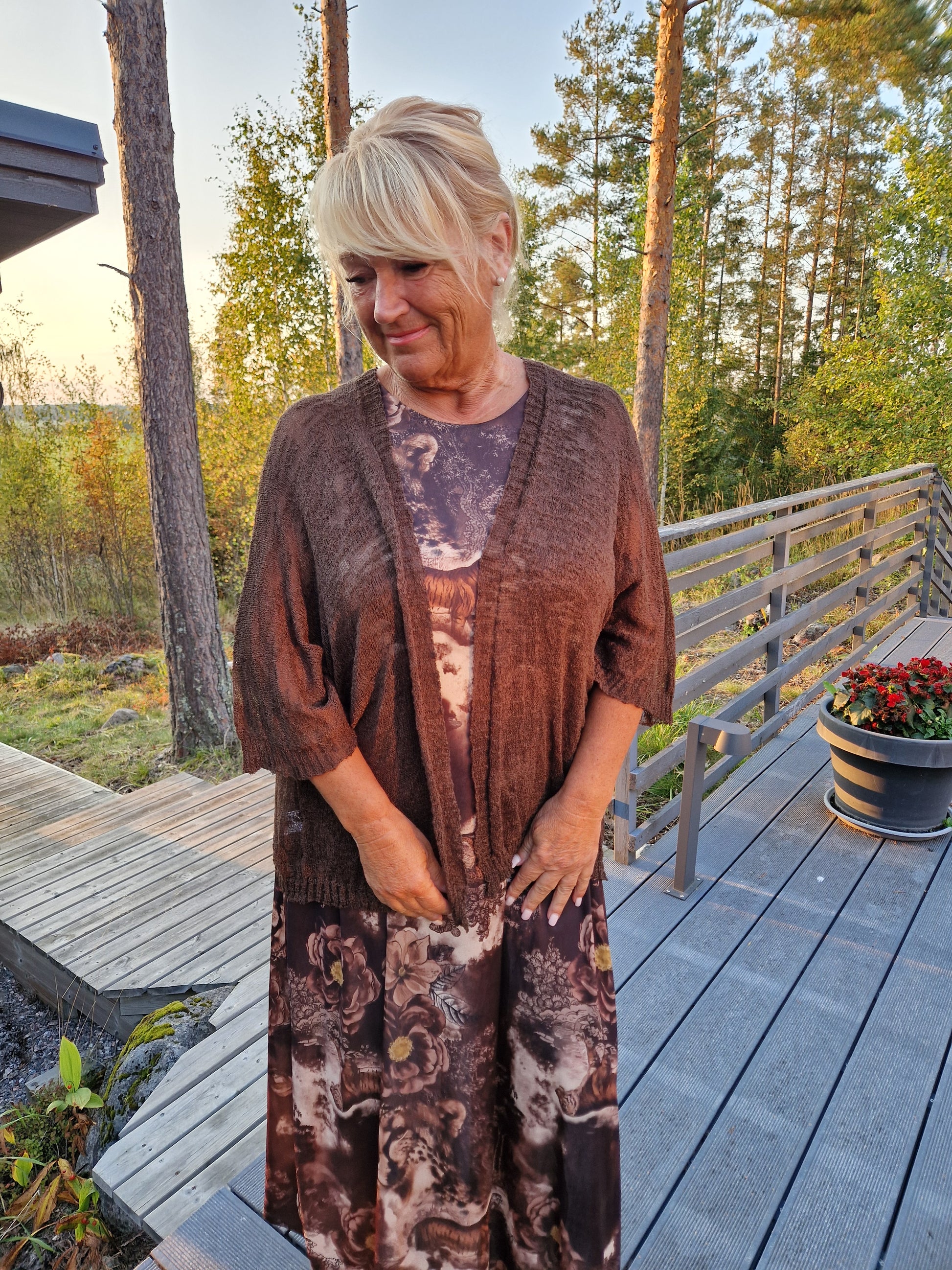 Ohutta neulosta, vajaamittainen hiha. Kevyt vaikkapa mekkojen päälle, ei kiinnitystä. Harsomainen neulos.