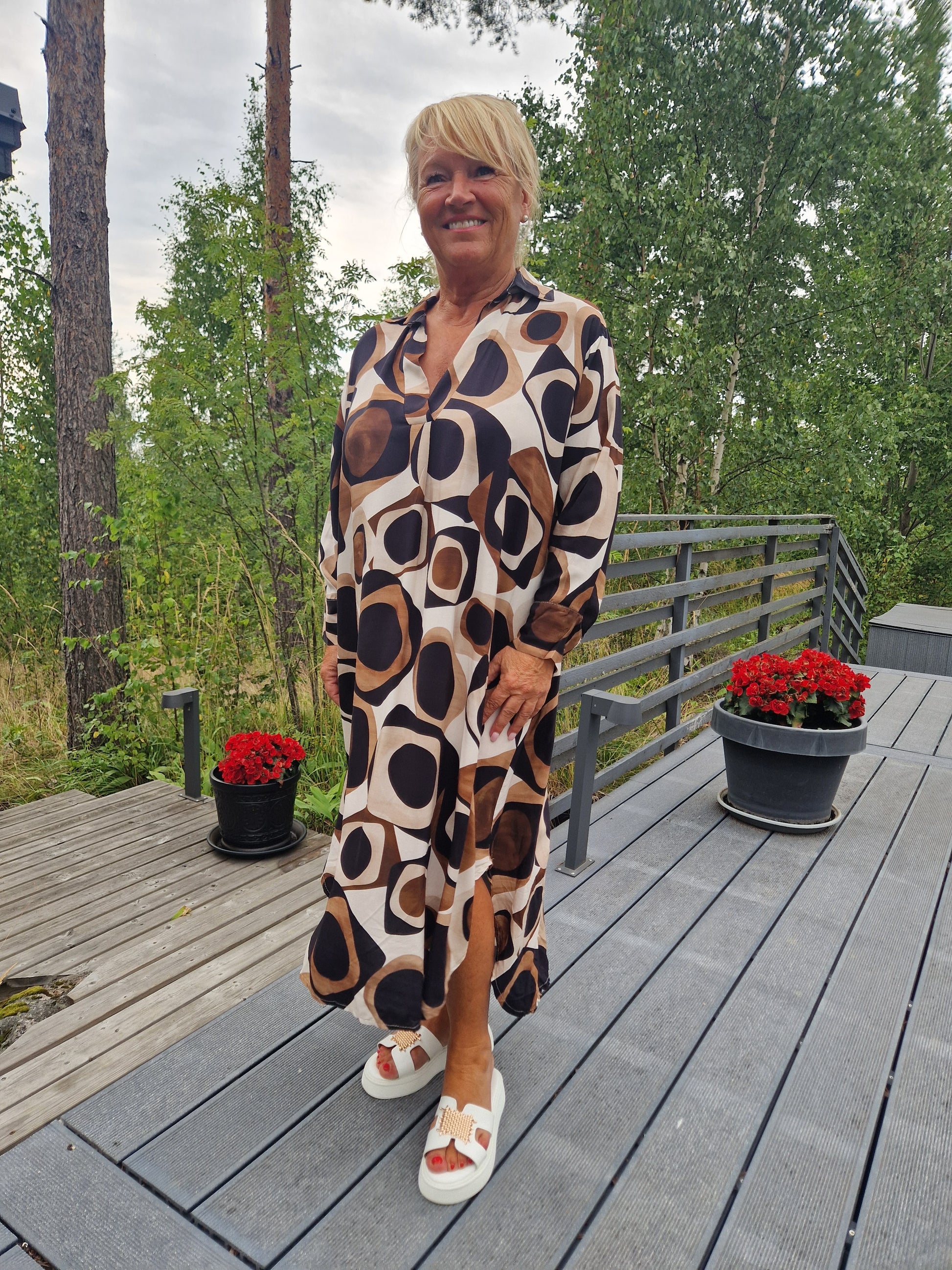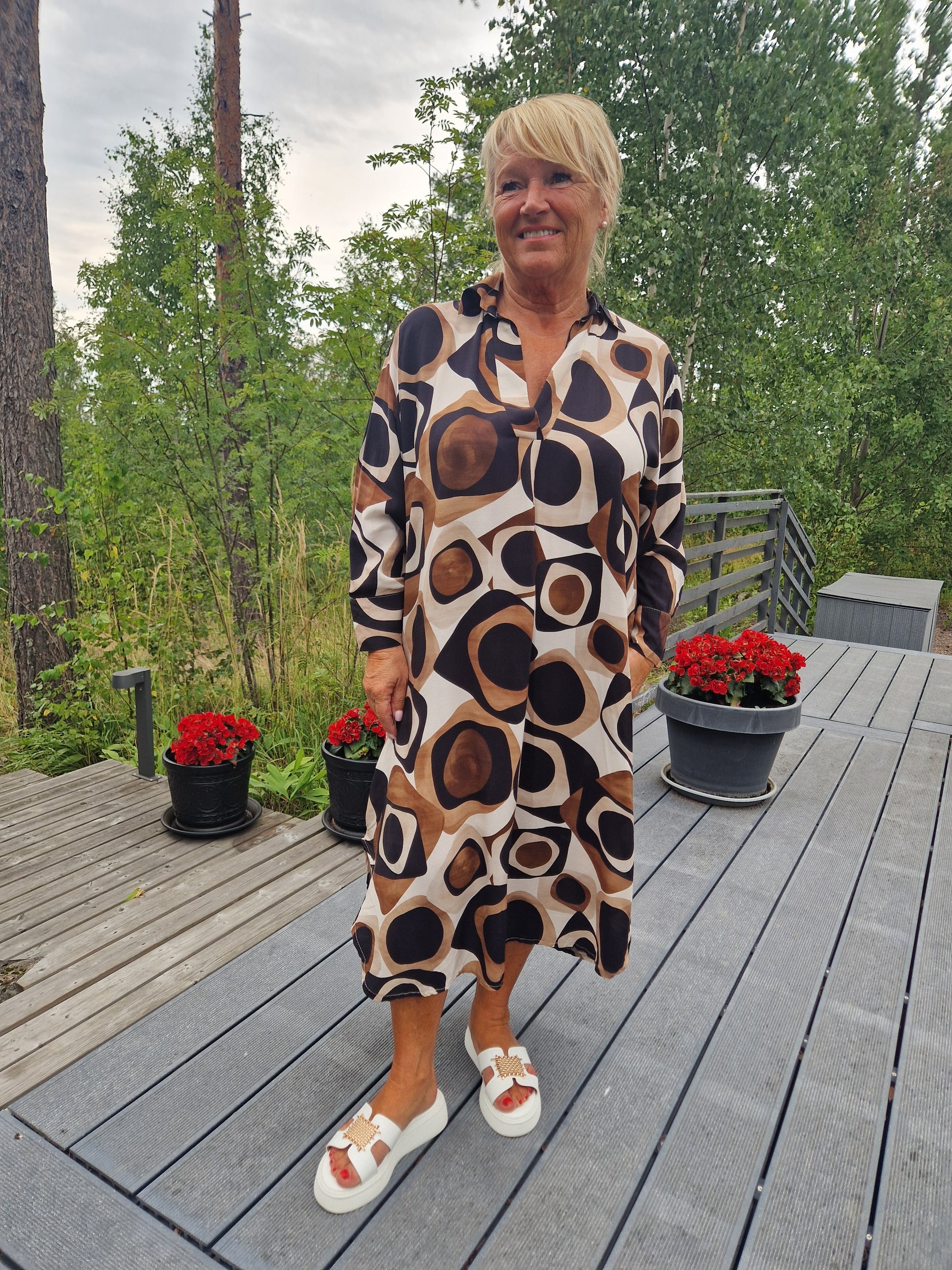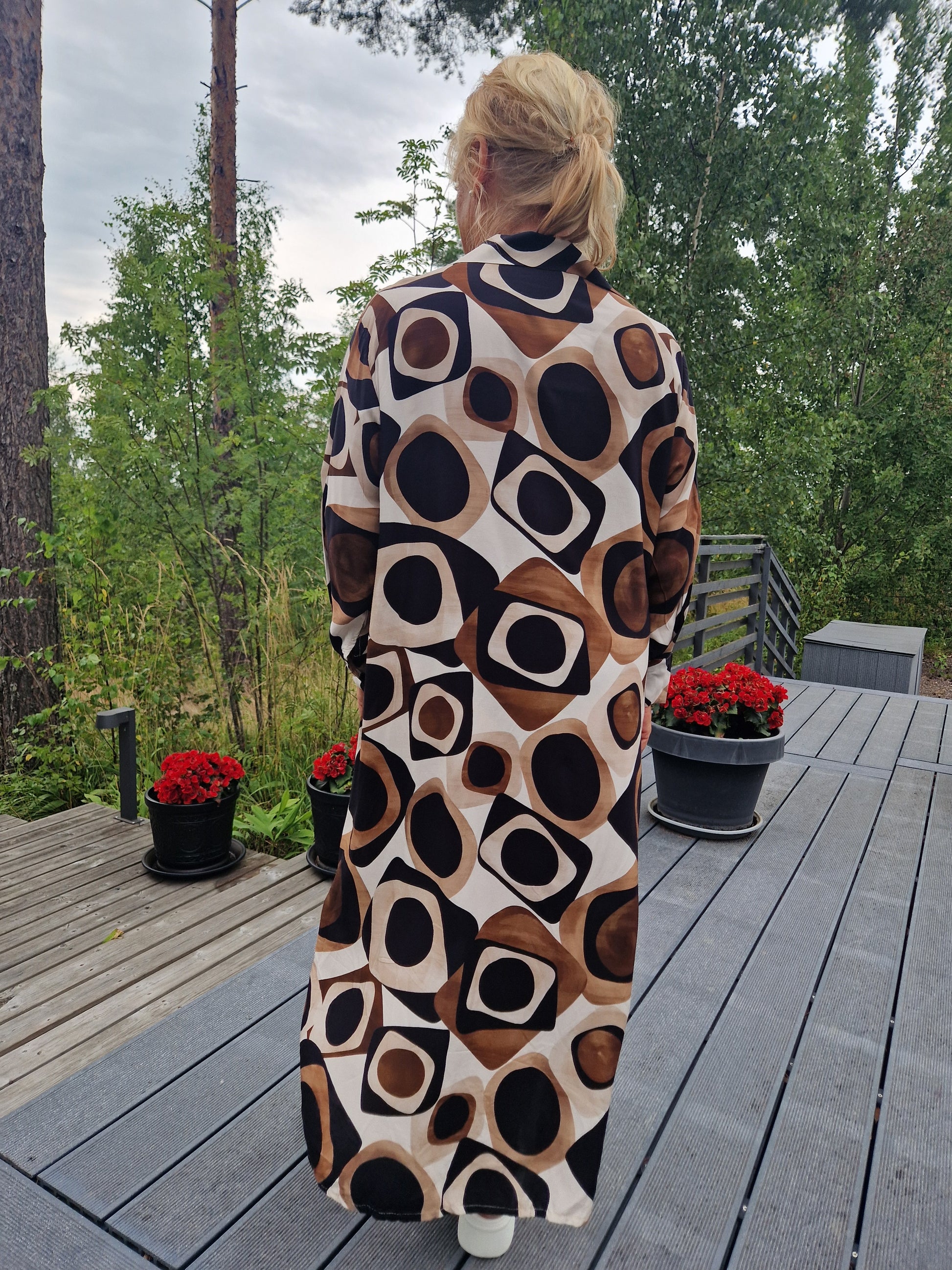 Suoralinjainen reilumman mitoituksen mekko. V-pääntie ja kaulukset. Helmassa sivuilla halkiot, hihat 3/4 osa pituus ja nappikiinnitys.