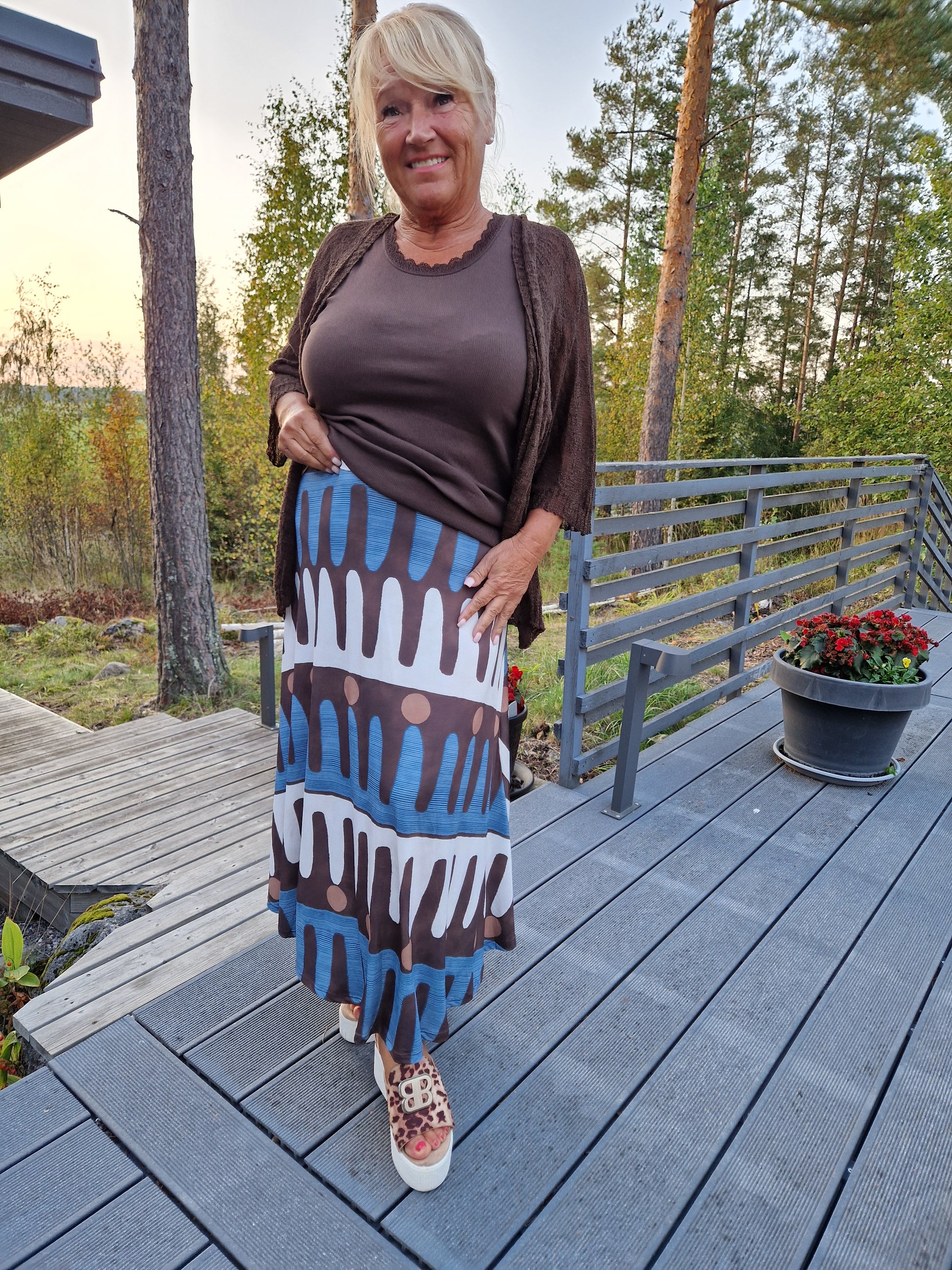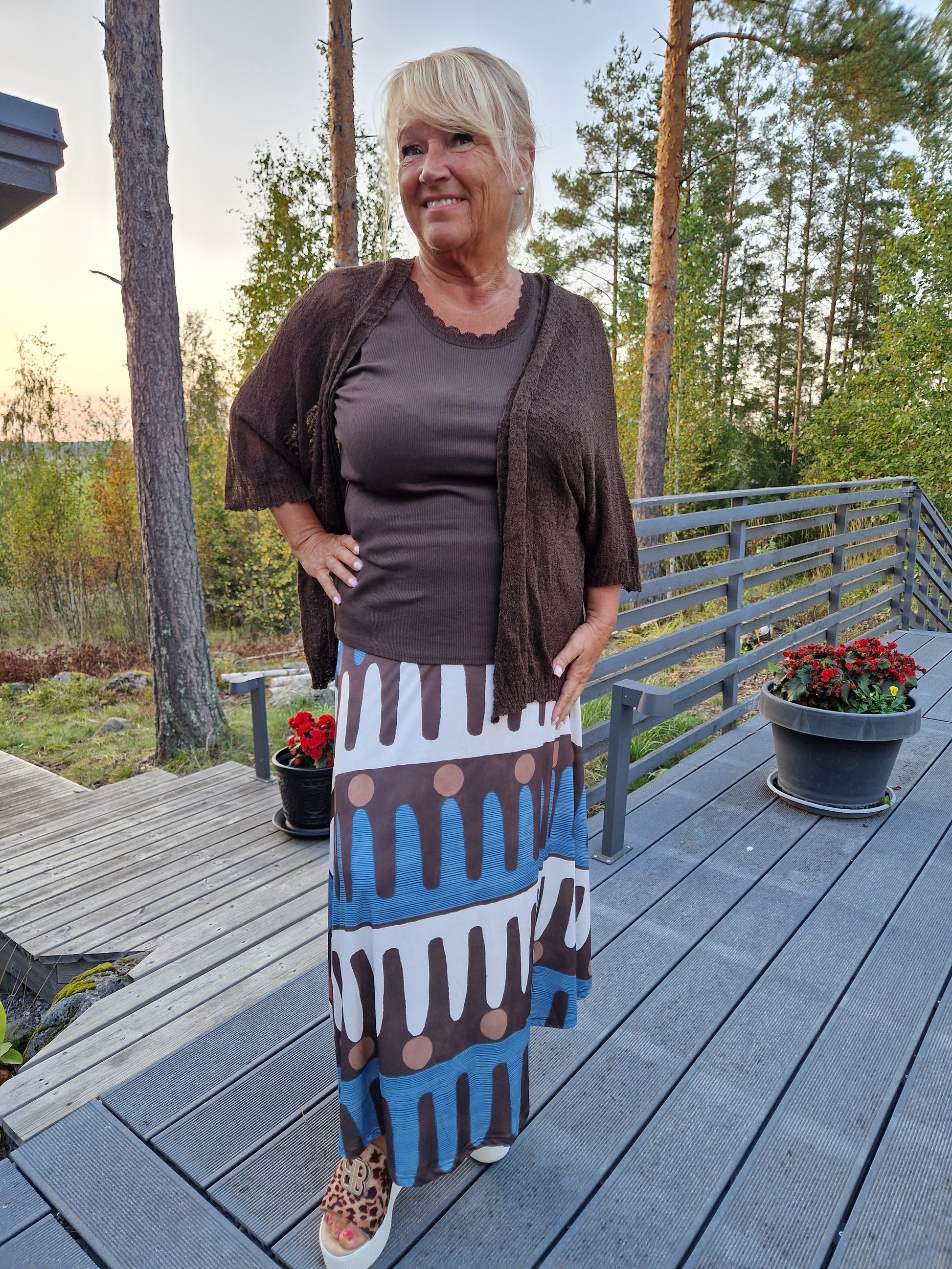 Laskeutuva, kuminauhavyötäröllinen hame. A-linjainen.