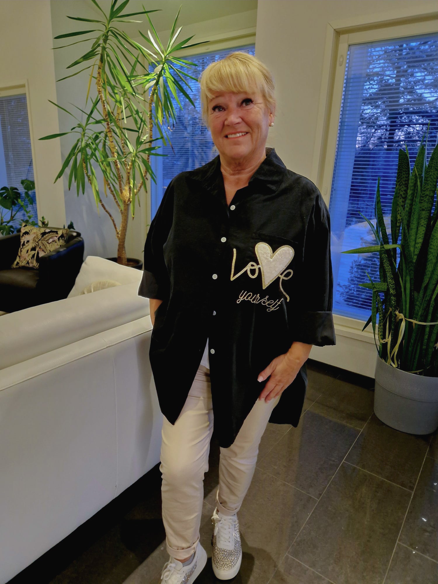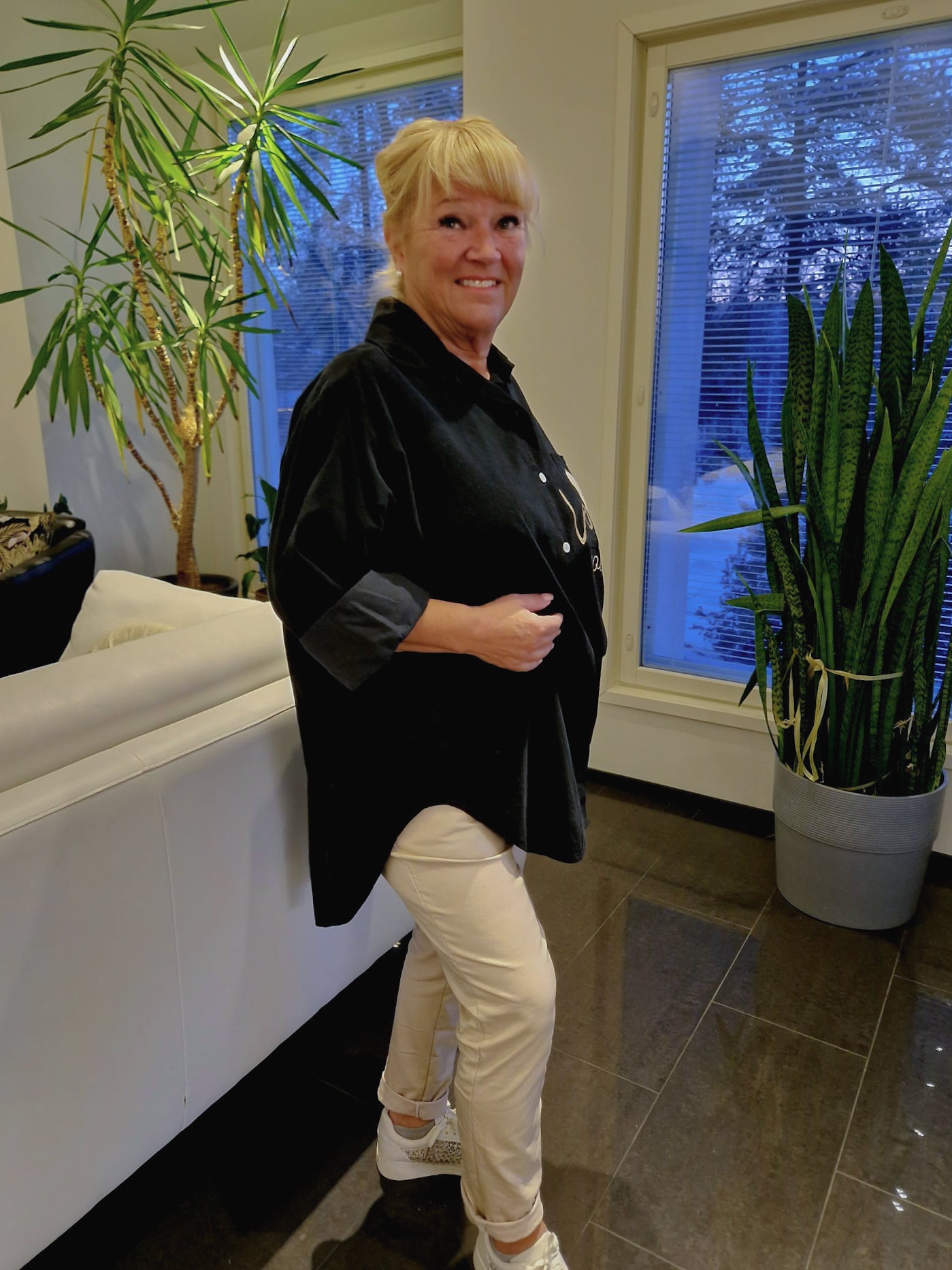 Reilunkokoinen samettipaitis kevyttä puuvillaa. Hyvin muotoon ommeltu helma. Edessä rinnalla yksi tasku ja koristeita.