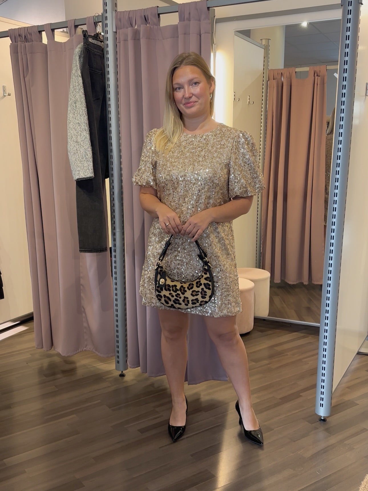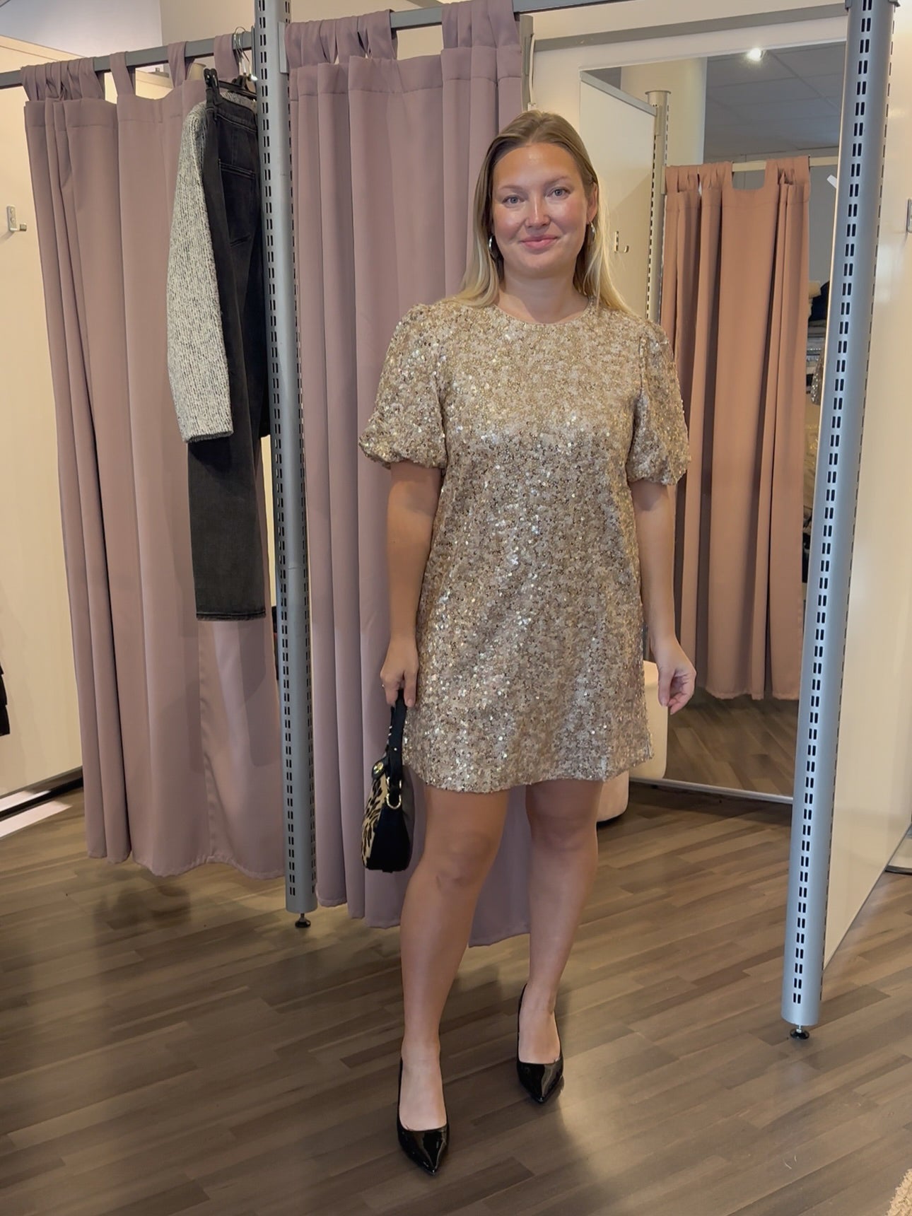 Makee paljettimekko/tunika puhvihihoilla! Alla vuori. Sirompaa mallia ja tässä mekossa ei ole joustoa. Saralla koko L.