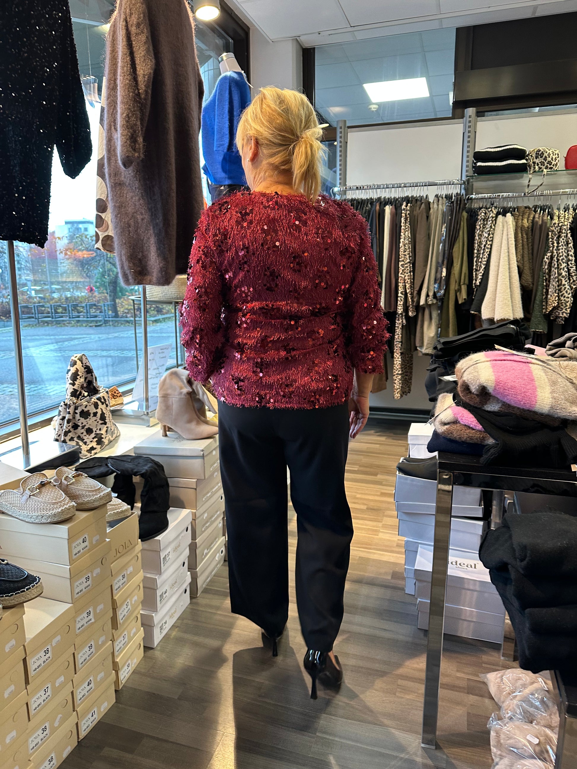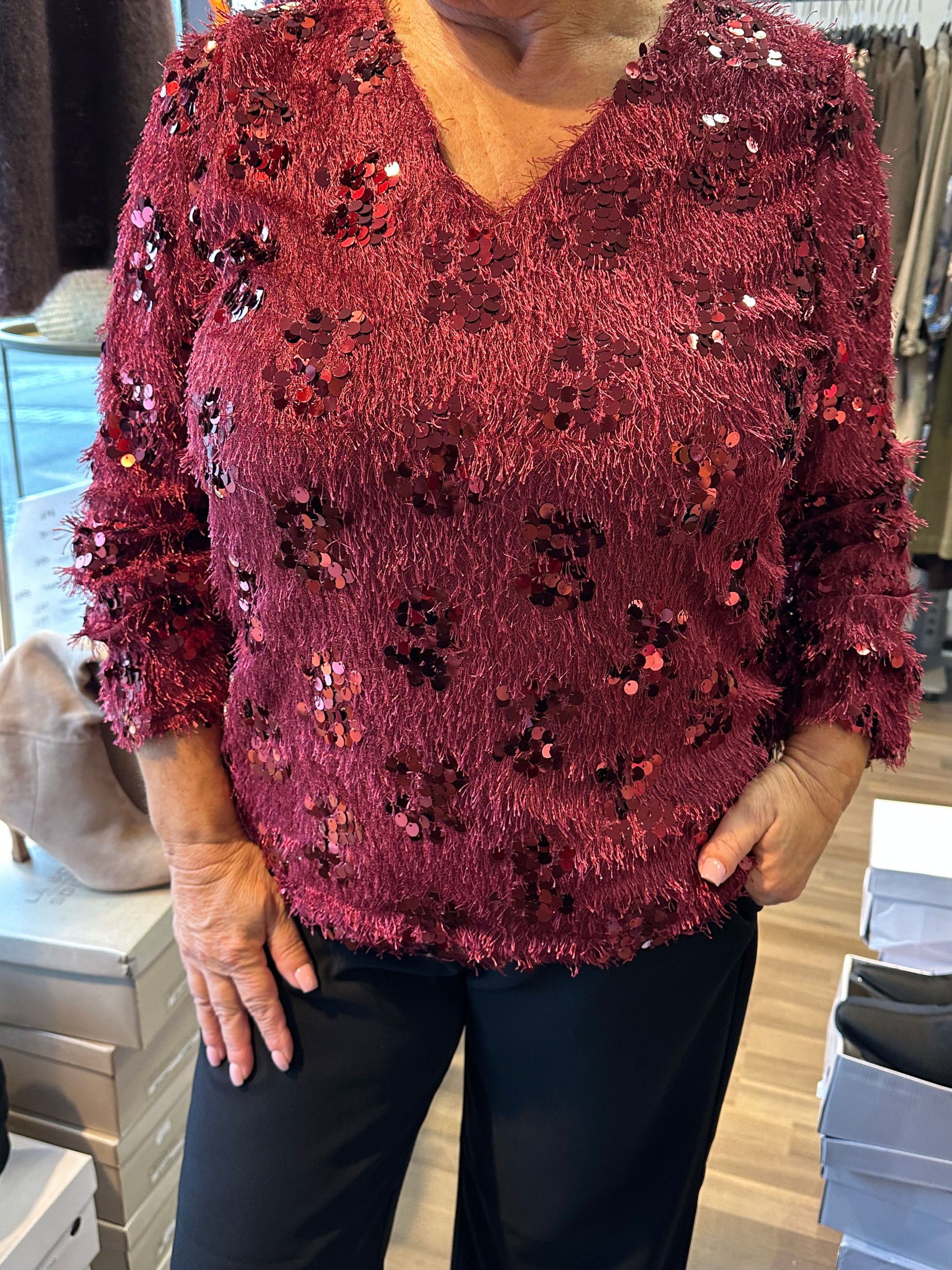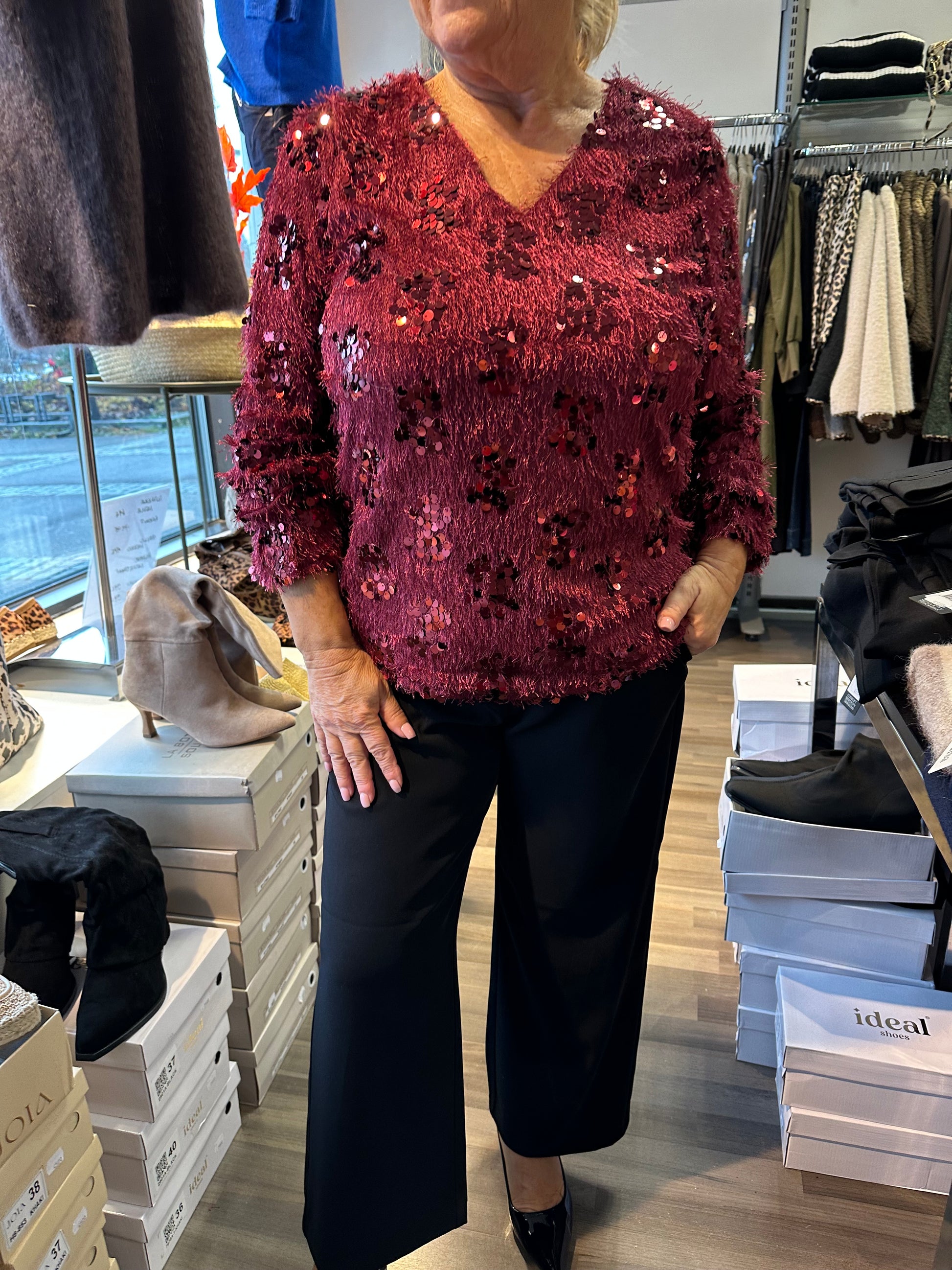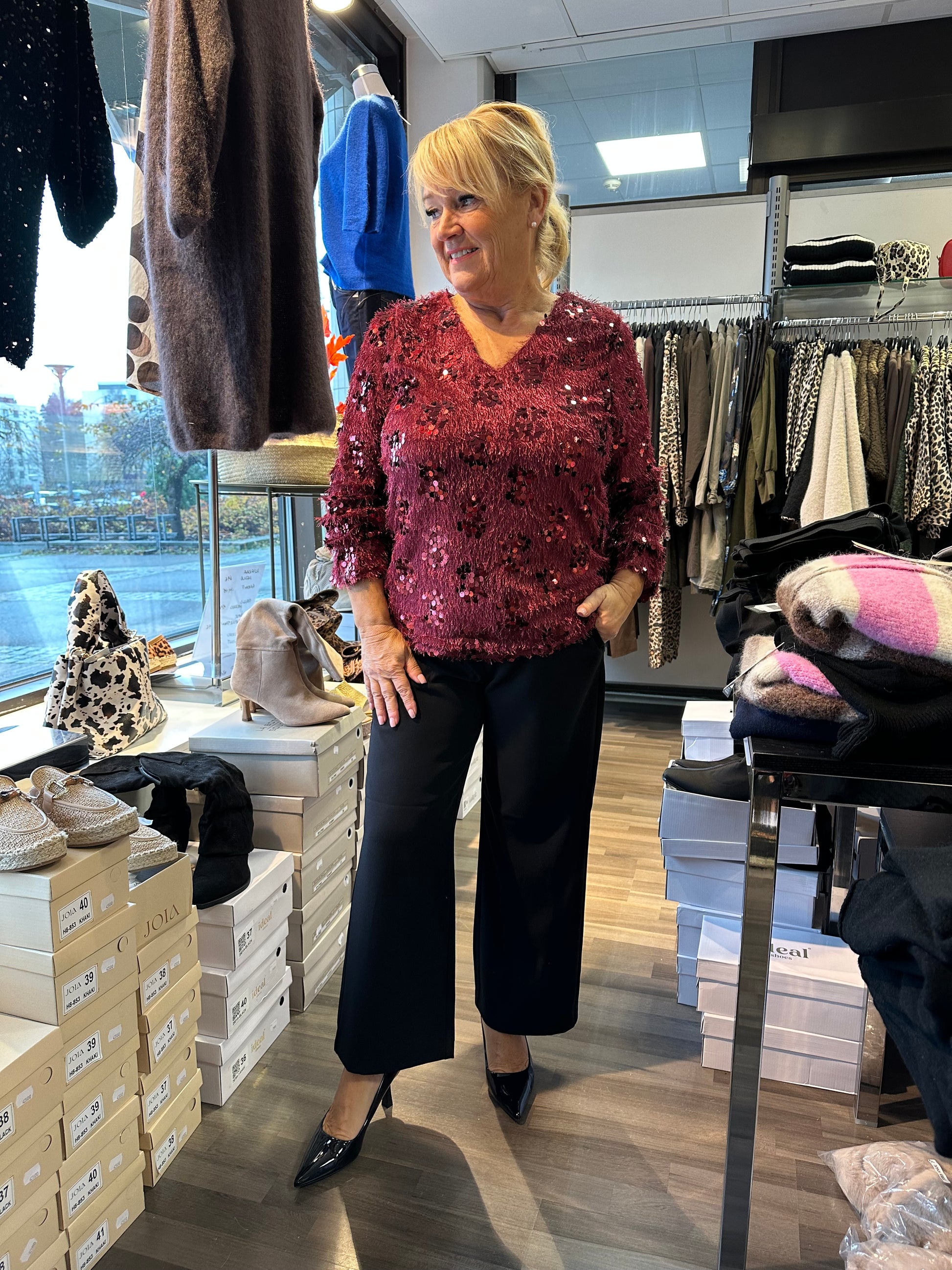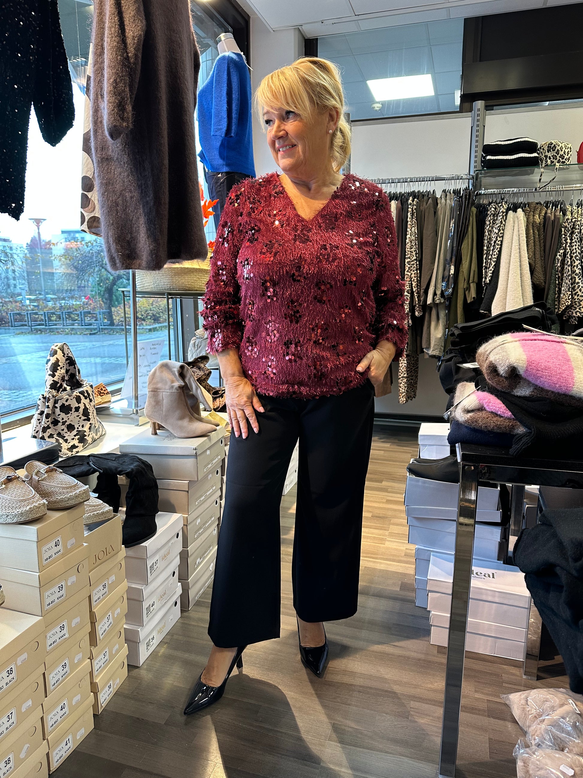 Makee paljettipusero ”höyhen” -kankaalla! Miellyttävän kevyttä kangasta. V-pääntie. Hieman sirompaa mallia.