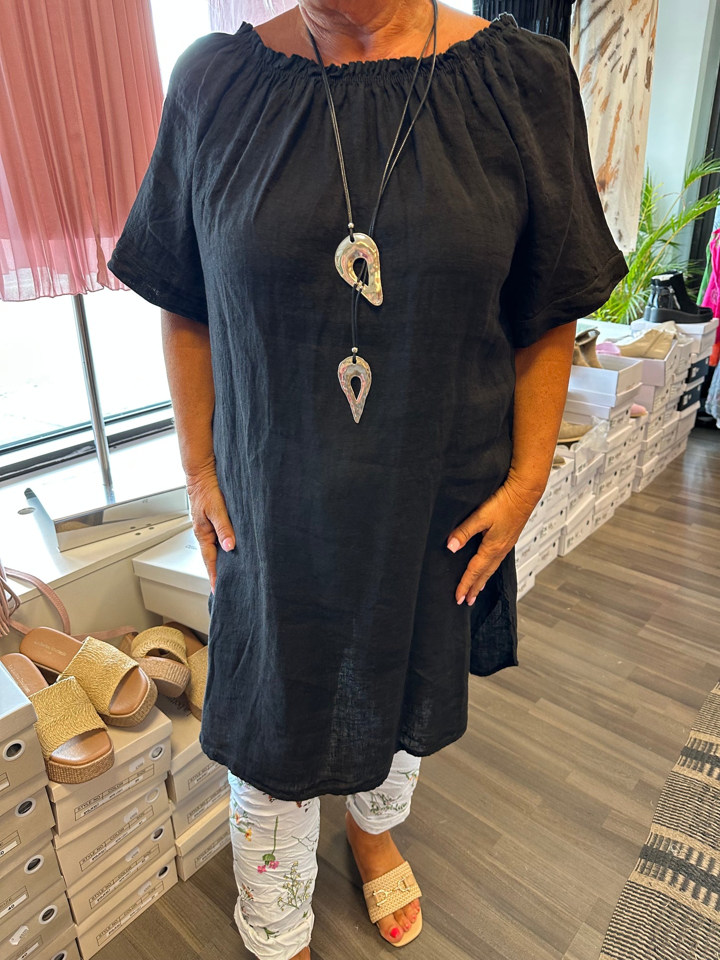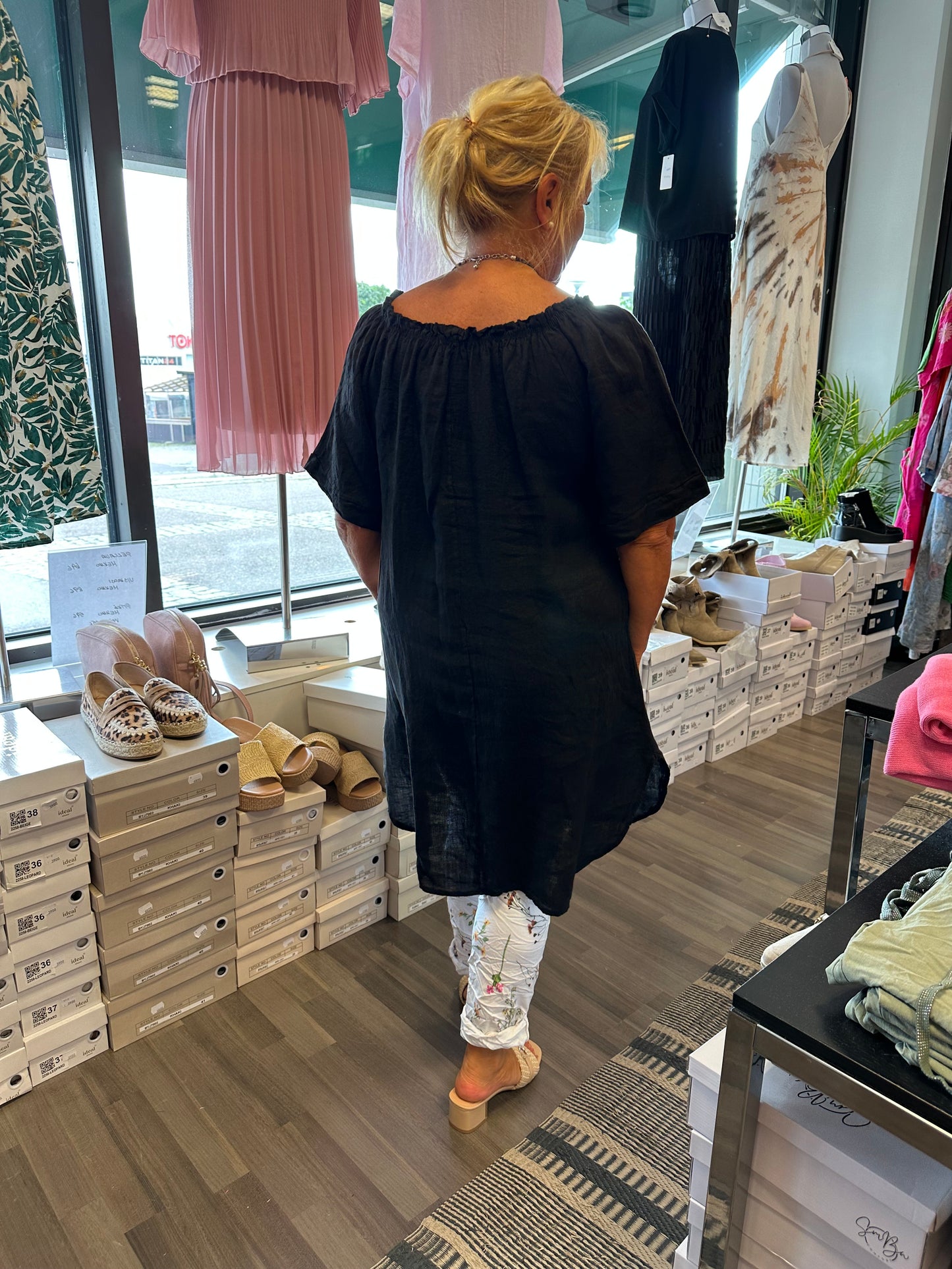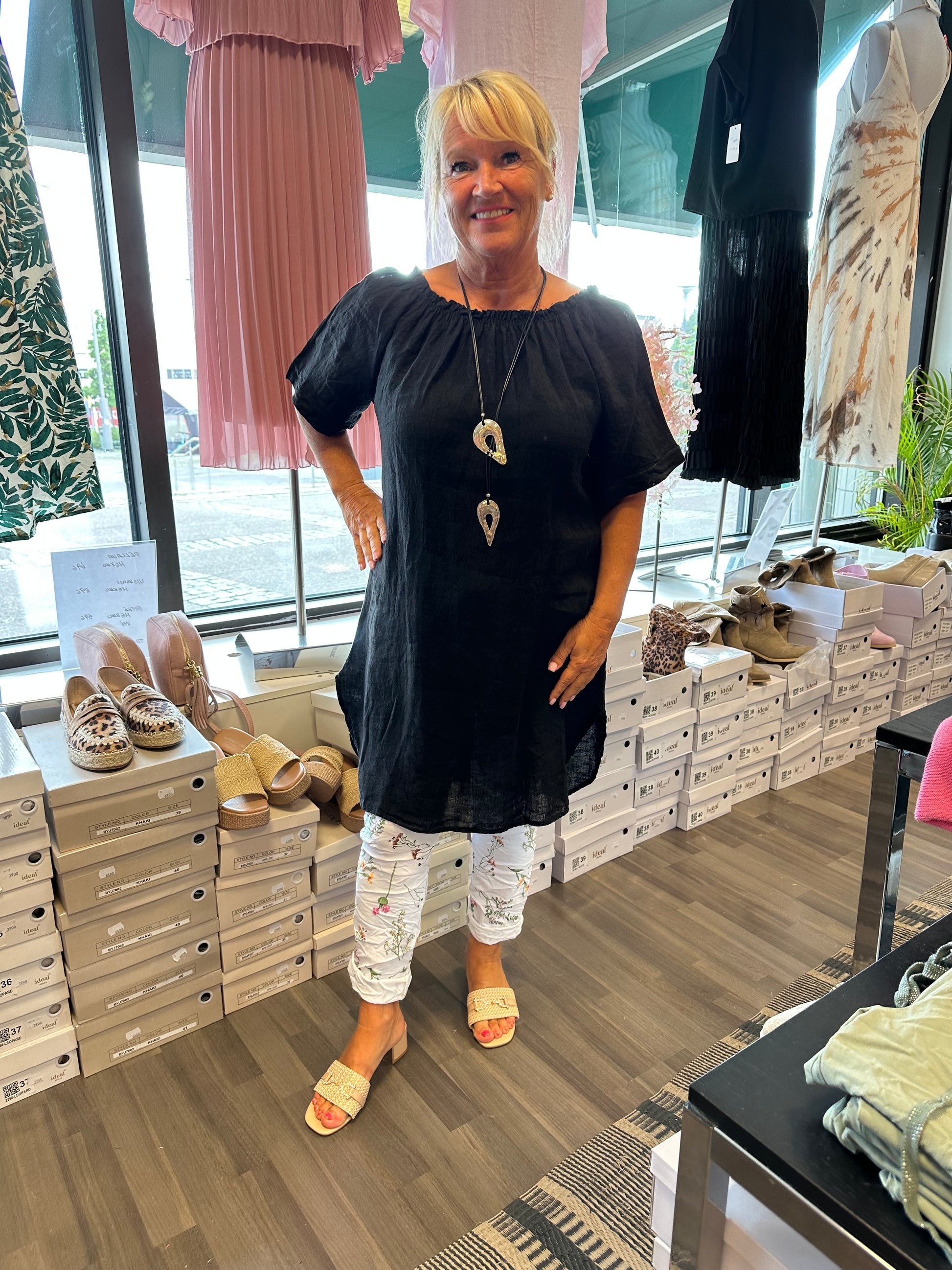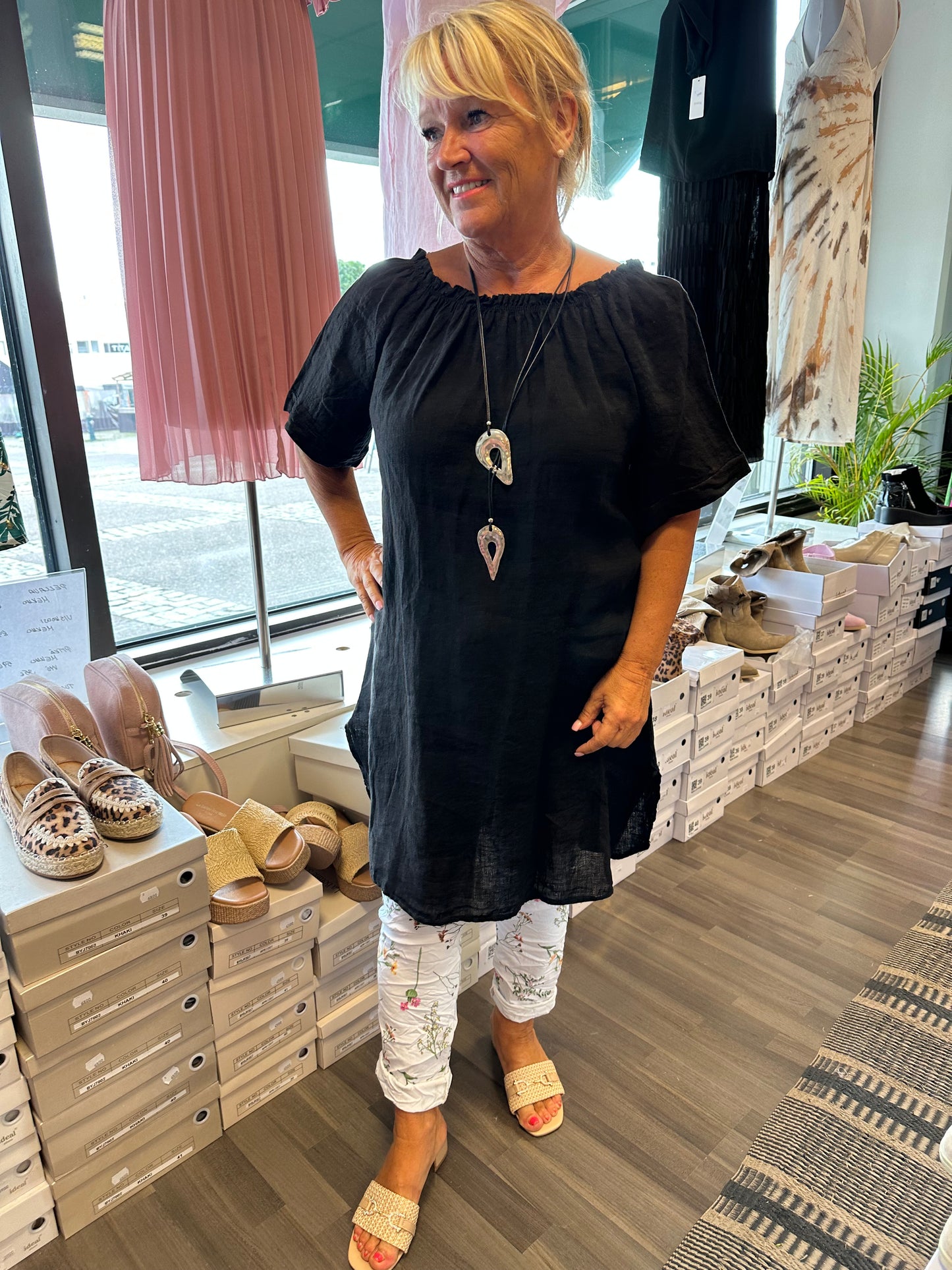 Kiva tunika 100% pellavaa. Pääntiellä kuminauha rypytys, ehkä hieman a-linjainen malli, pyöristykset helmassa molemmin puolin. Pikkuhiha.