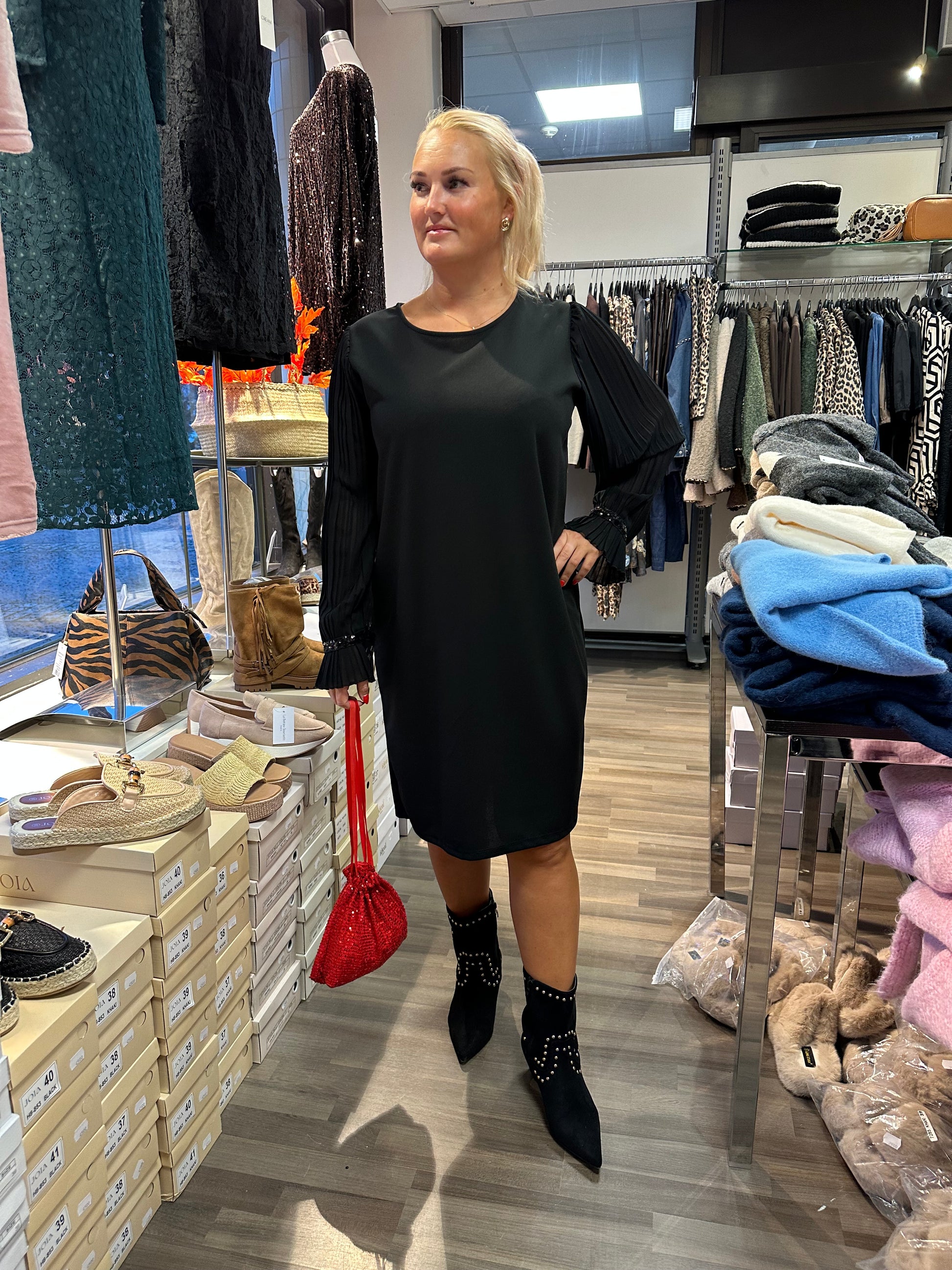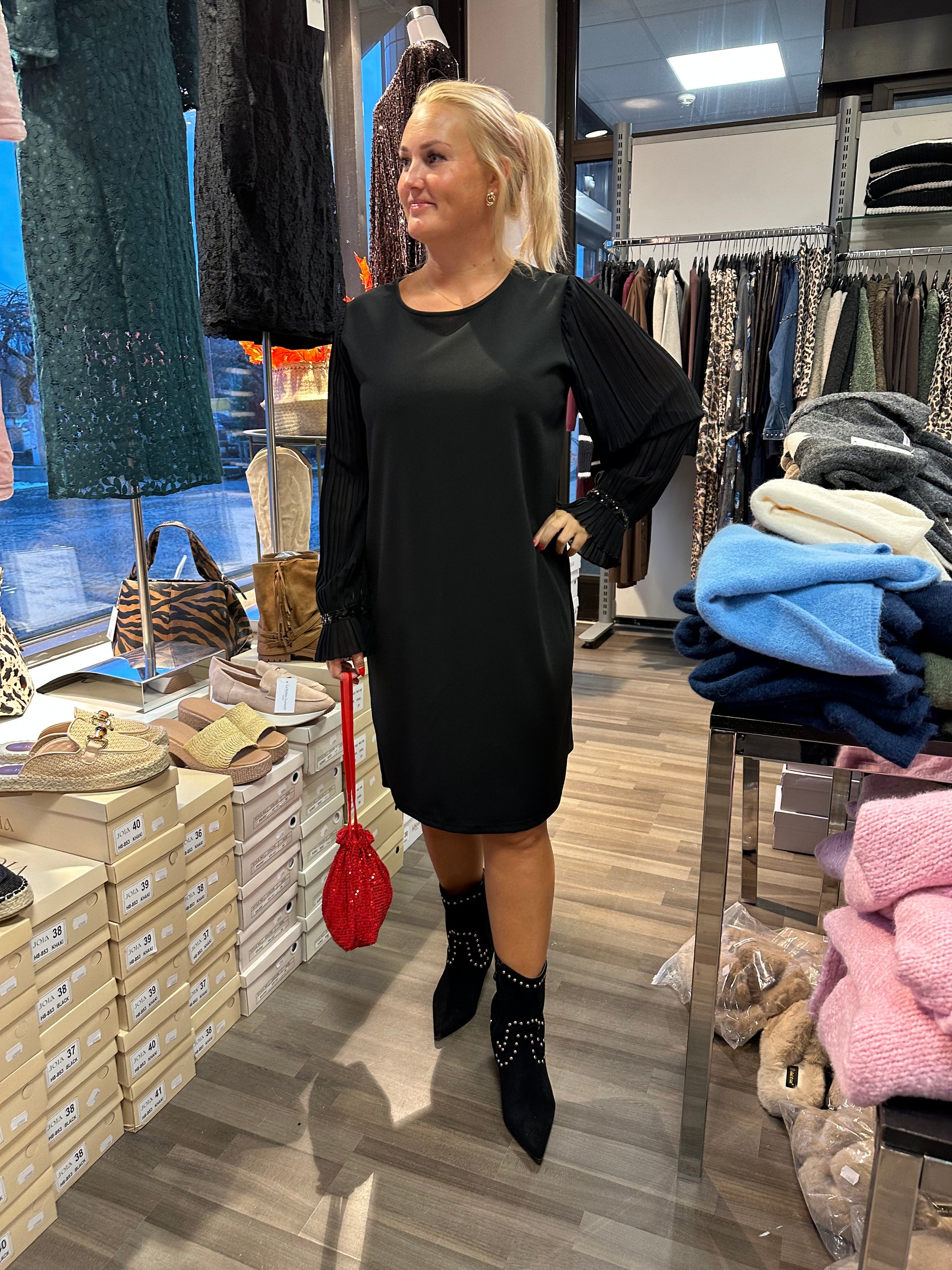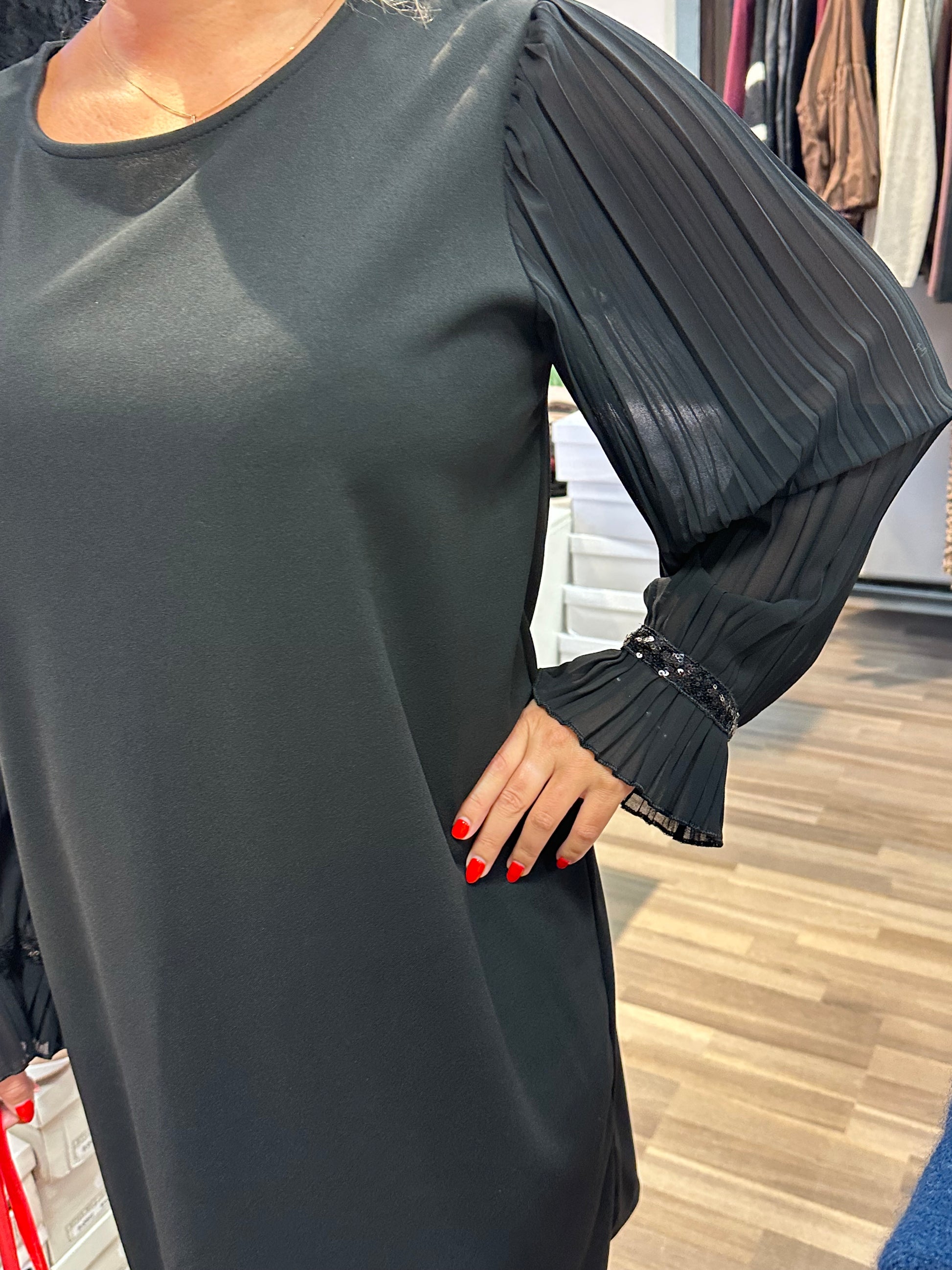 Suoranmallinen ”pikkumusta” pliseeratuilla hihoilla. Hihansuissa pienet paljettiyksityiskohdat.