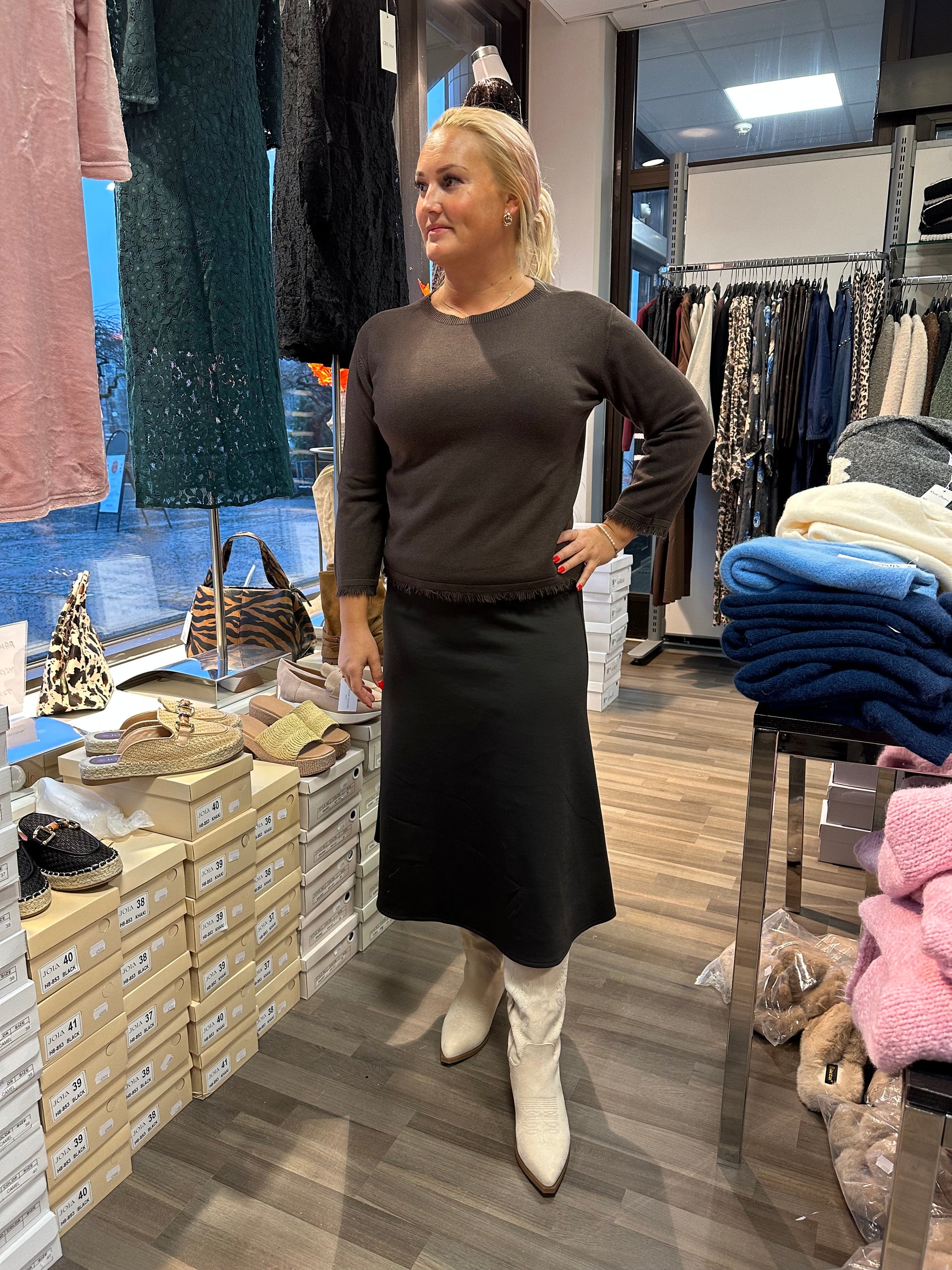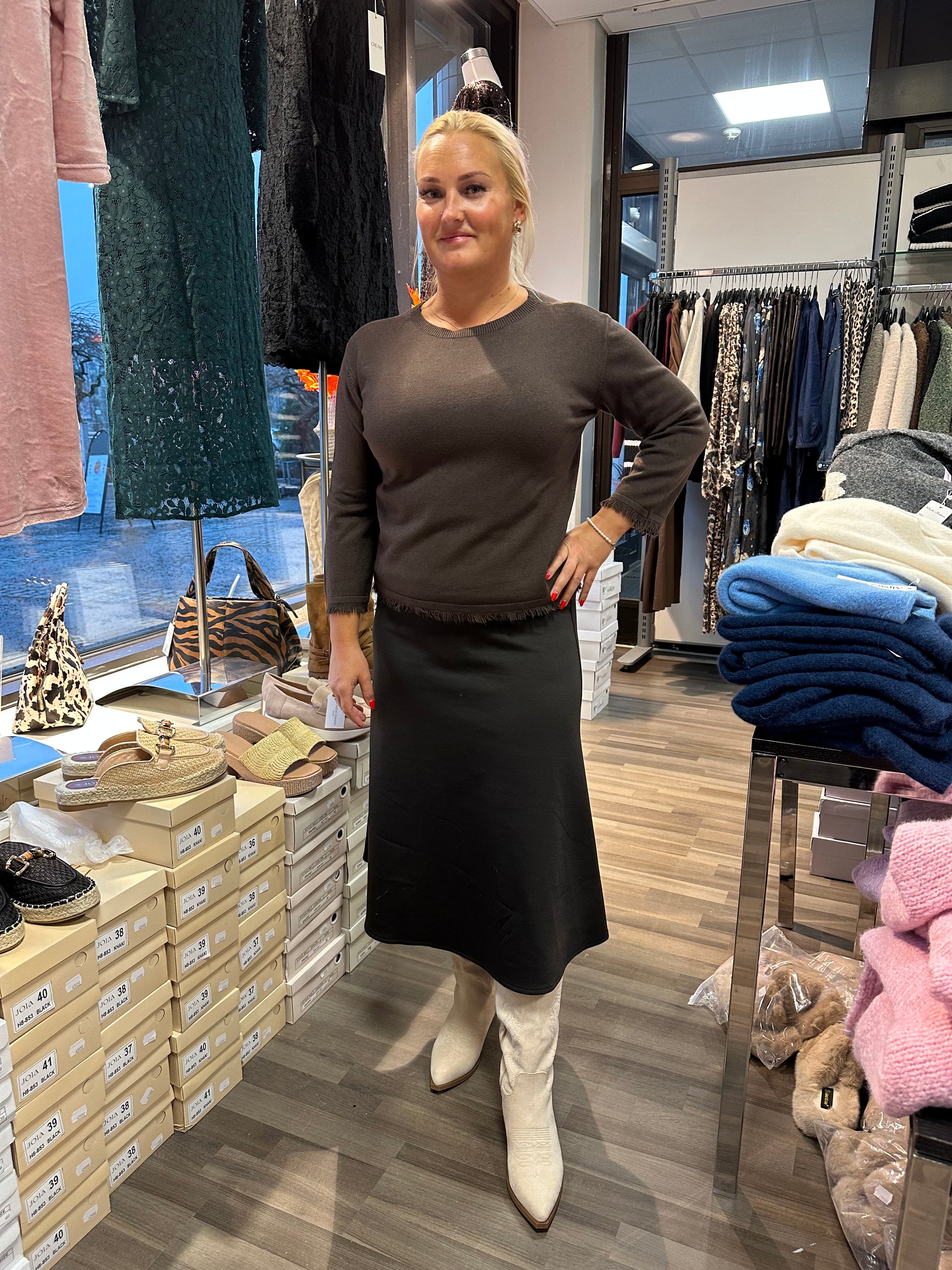Sirompi neule laadukasta silepintaista neulosta. Hihansuissa ja helmassa kivat pienet hapsut. Lyhyt suoramalli.