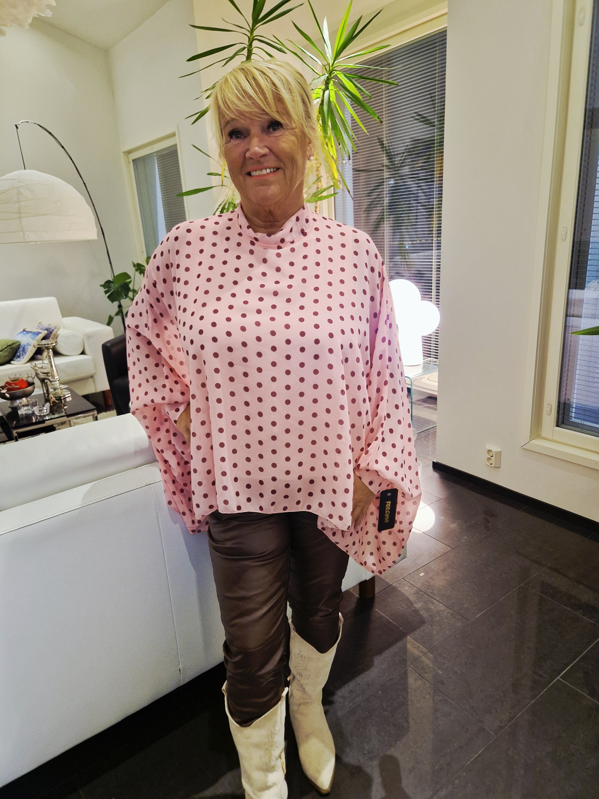 Tosi söötti, leveä poncho tyylinen pusero. Joustava viskoosivuori, ei tarvitse toppia alle. Liehuvan leveä sivuilta. Pieni pystykaulus, takana nappikiinnitys. Pituus edestä n. 59cm