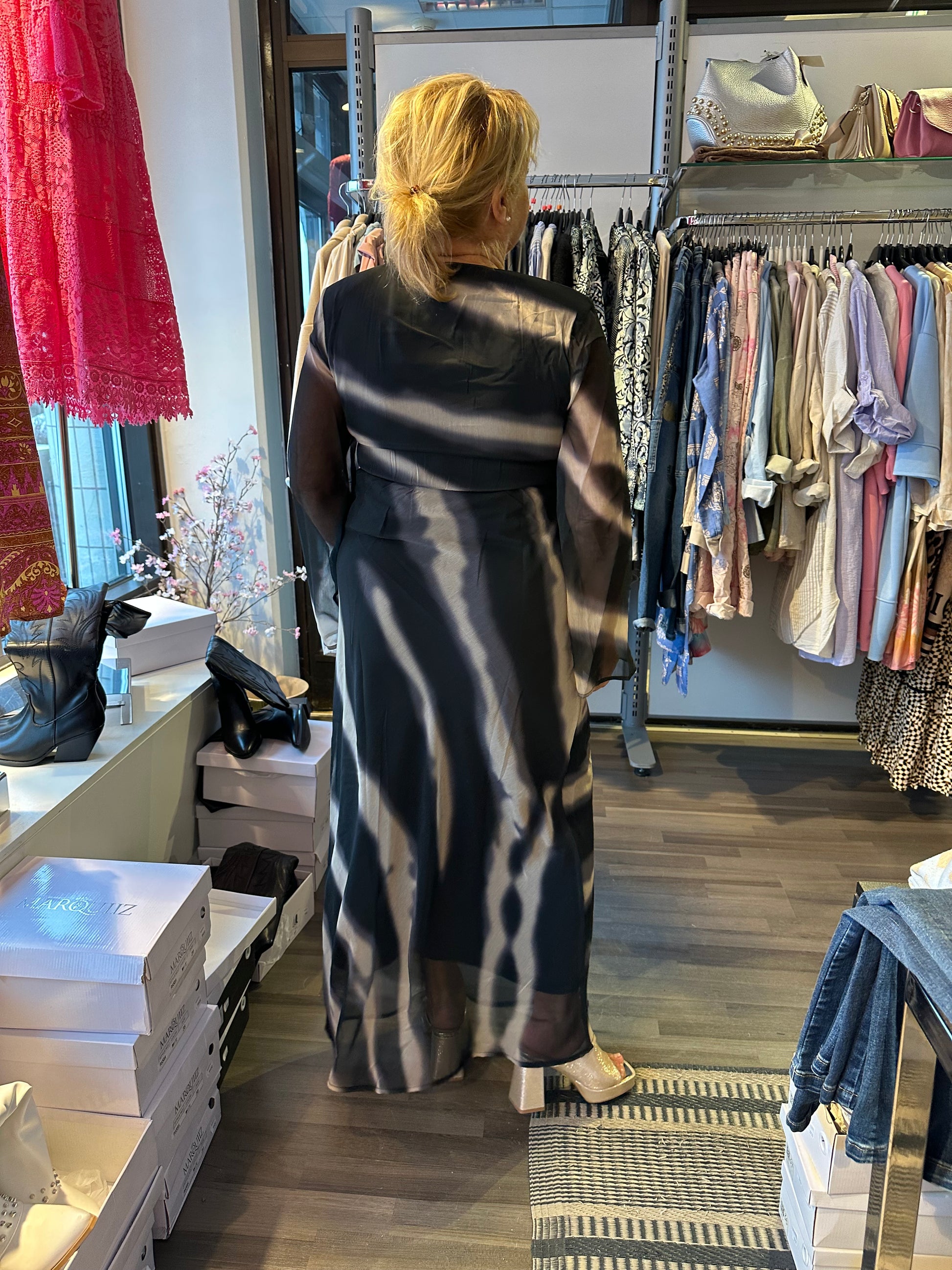 Upea mekko juhlaan. V-pääntie, jossa pieni rypytys edessä. Päällikangas sifonkia ja alusvuori mukavaa viskoosia. Pitkät, leveät hihat ja olkapäillä olkatoppaukset.