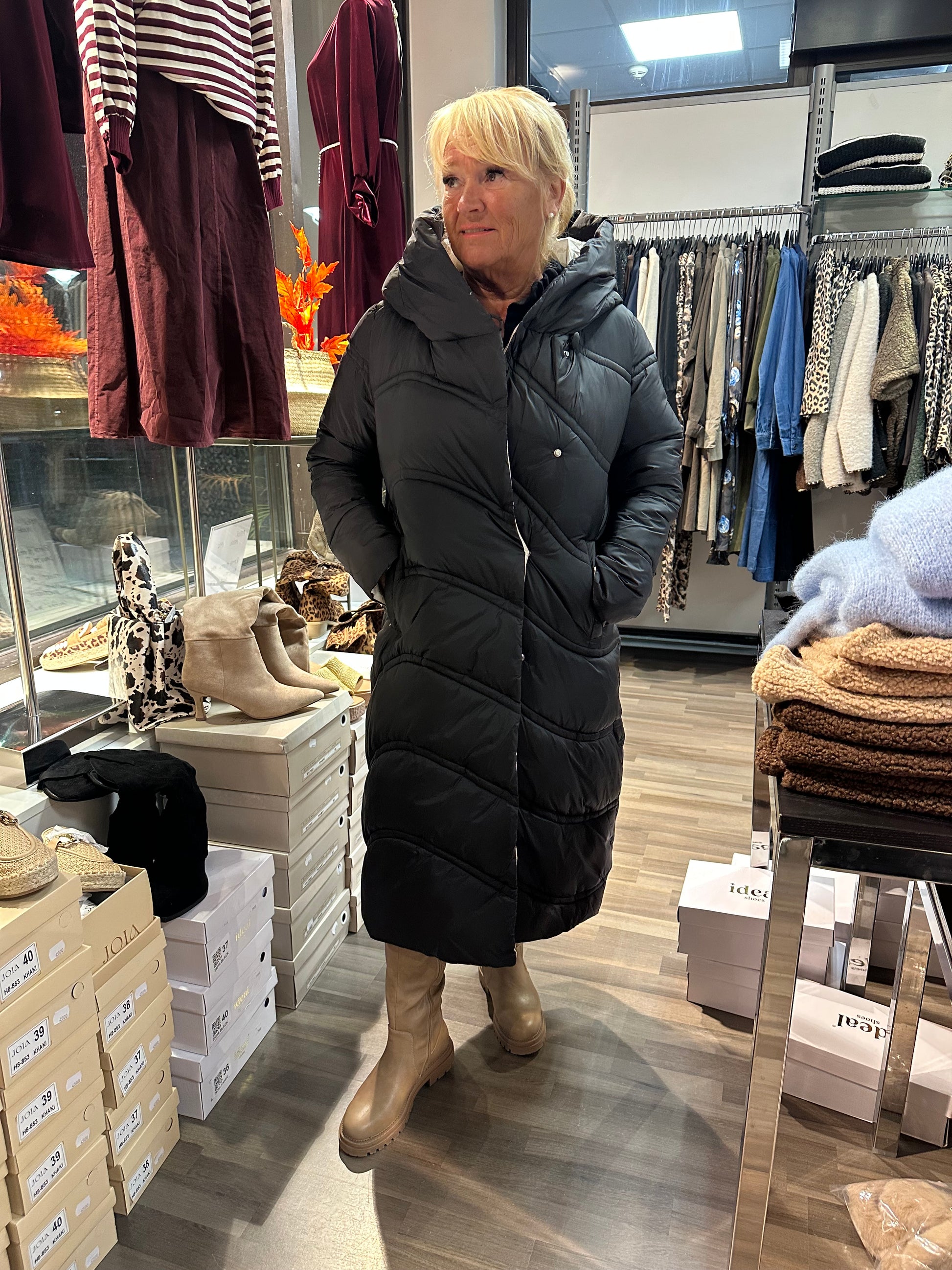 Pitkä toppatakki kivoilla tikkauksilla. Kiinteä huppu. Edessä taskut vetoketjuilla. Nepparikiinnitys. Kiva vaalea vuori.