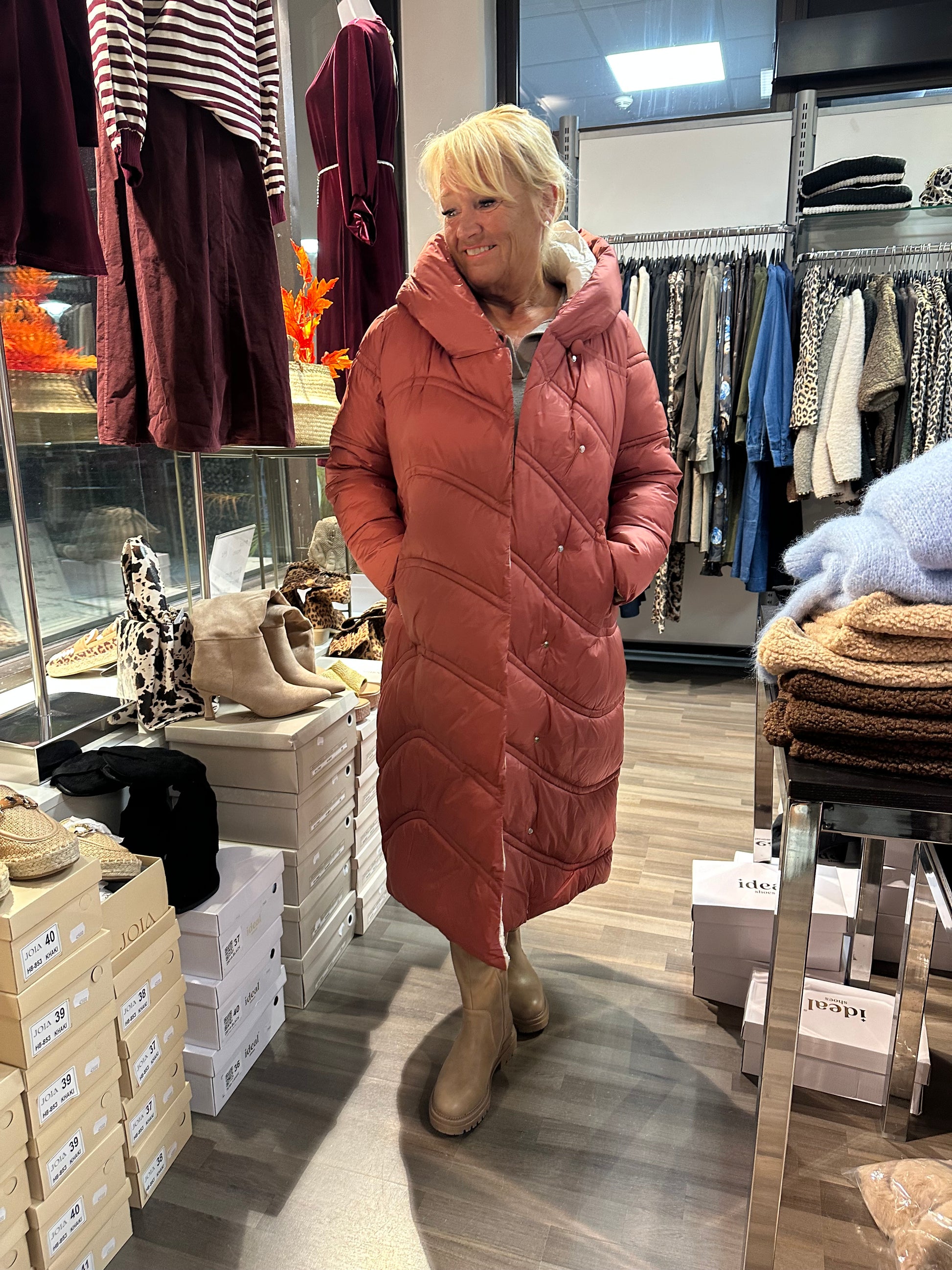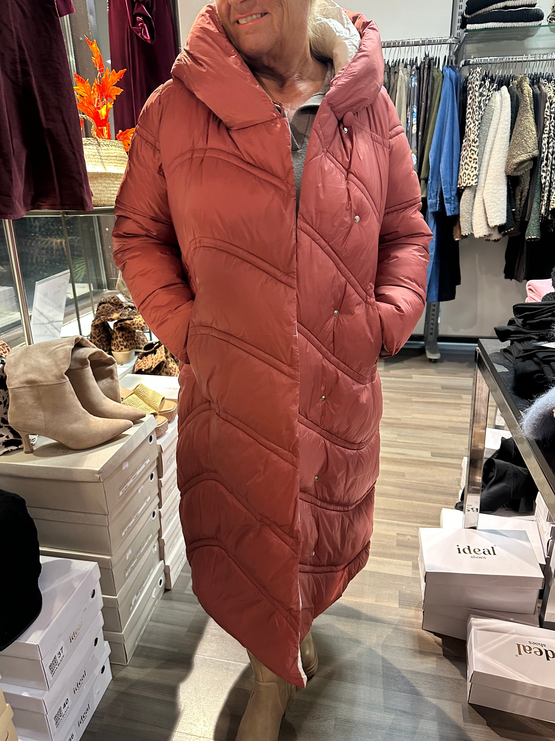 Pitkä toppatakki kivoilla tikkauksilla. Kiinteä huppu. Edessä taskut vetoketjuilla. Nepparikiinnitys. Kiva vaalea vuori.