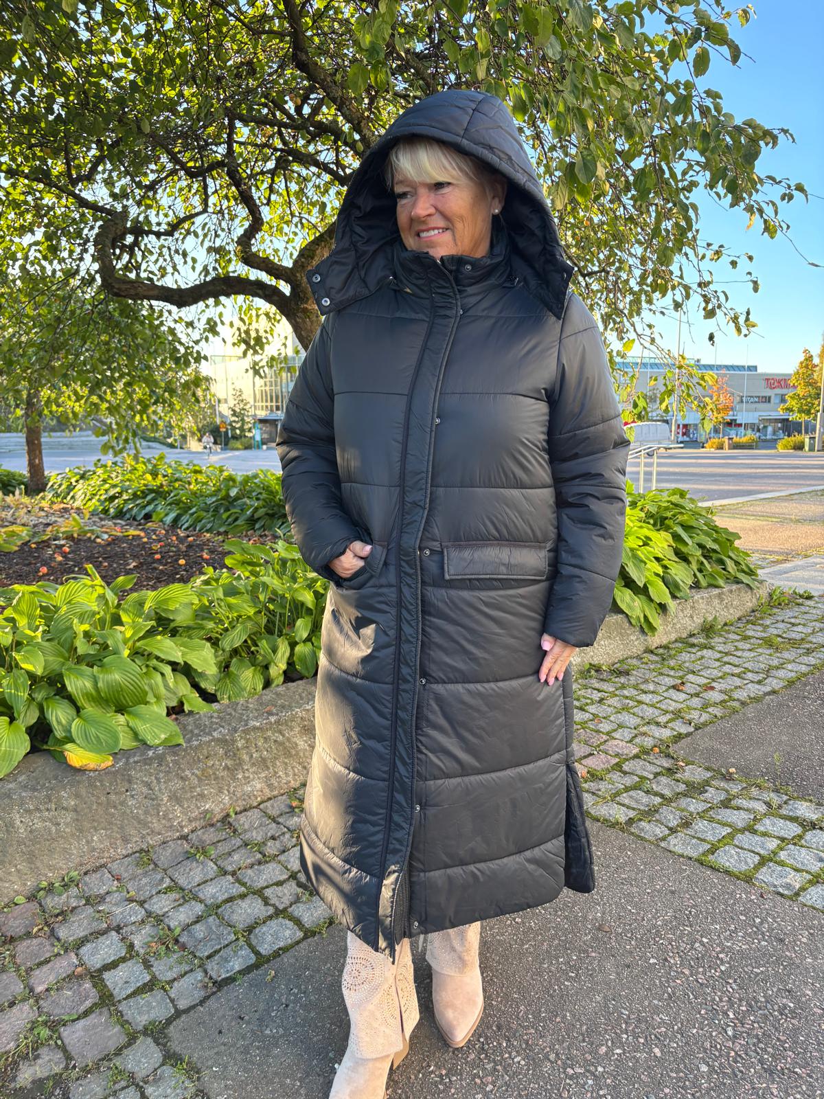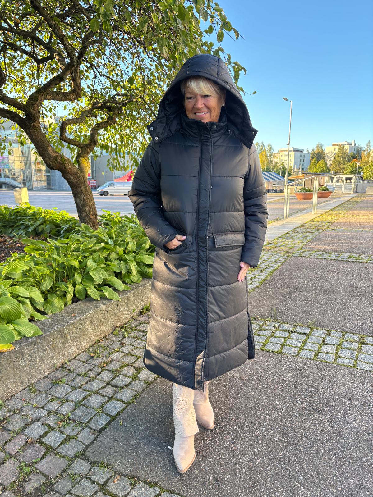 Creamin pitkä toppis! Mukavan muhkea silti kevyt. Halkiot sivuilla antaa tilaa liikkua, isot taskut edessä. Vetoketju ja nepparit, korkea kaulus, irrotettava huppu.