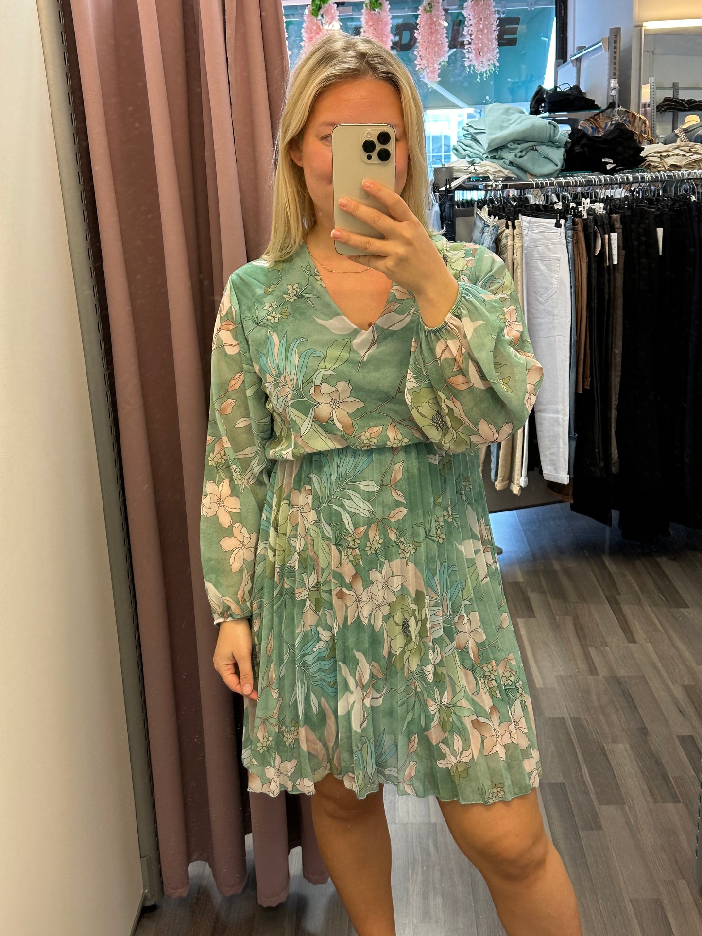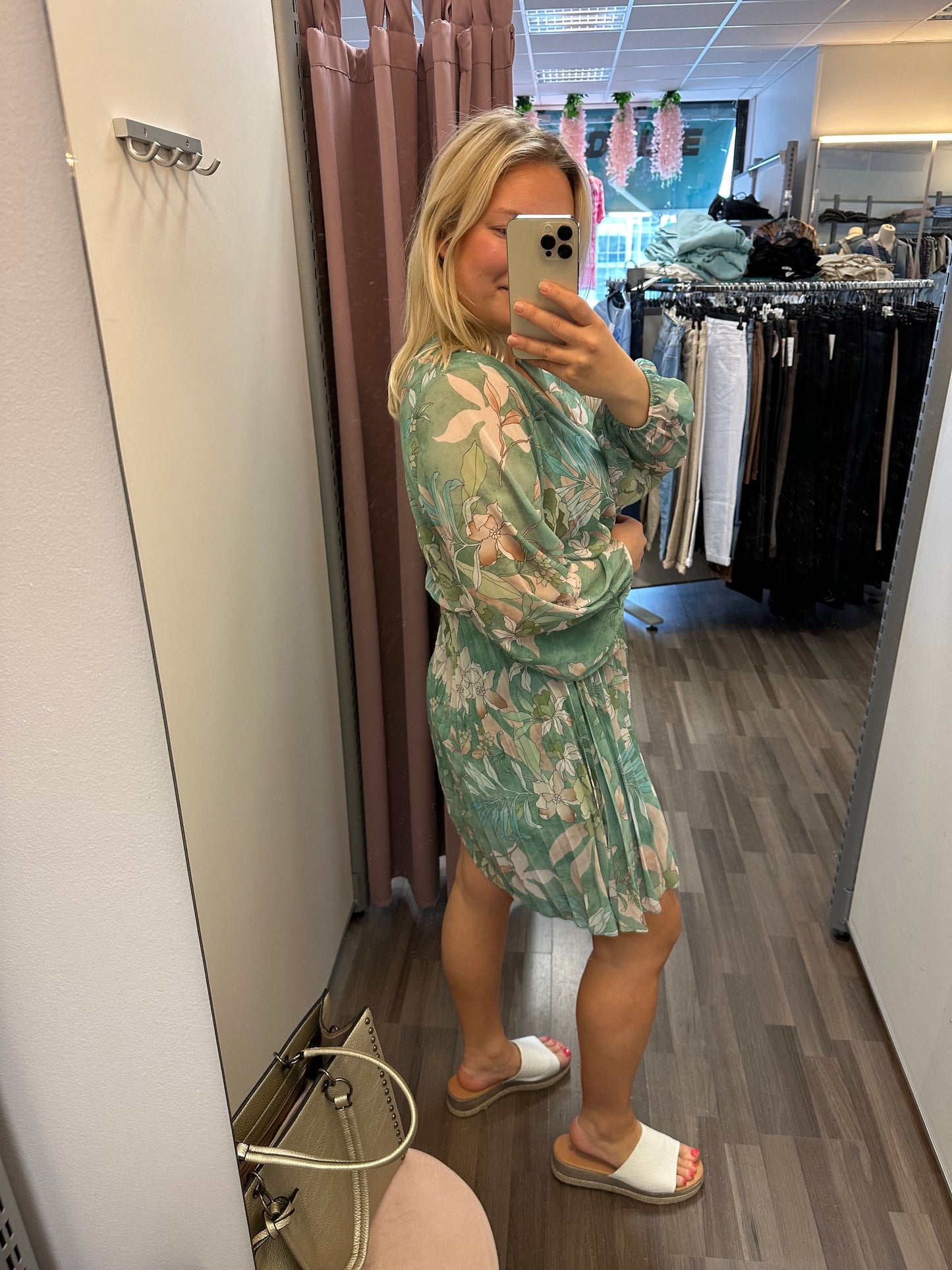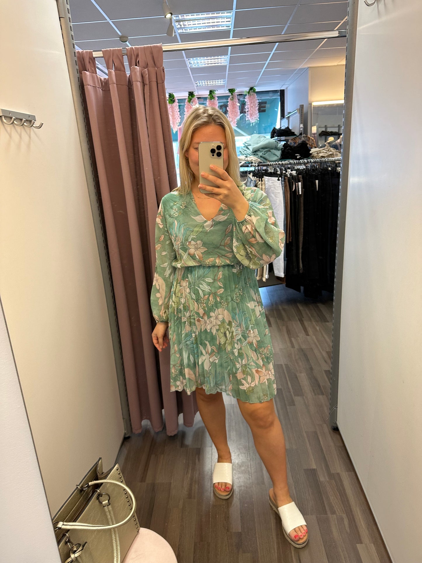 Pitkähihainen sifonkimekko mukavalla viskoosivuorella. Vyötäröllä ja hihansuissa joustava kuminauha. Plisee helma. V-pääntie.