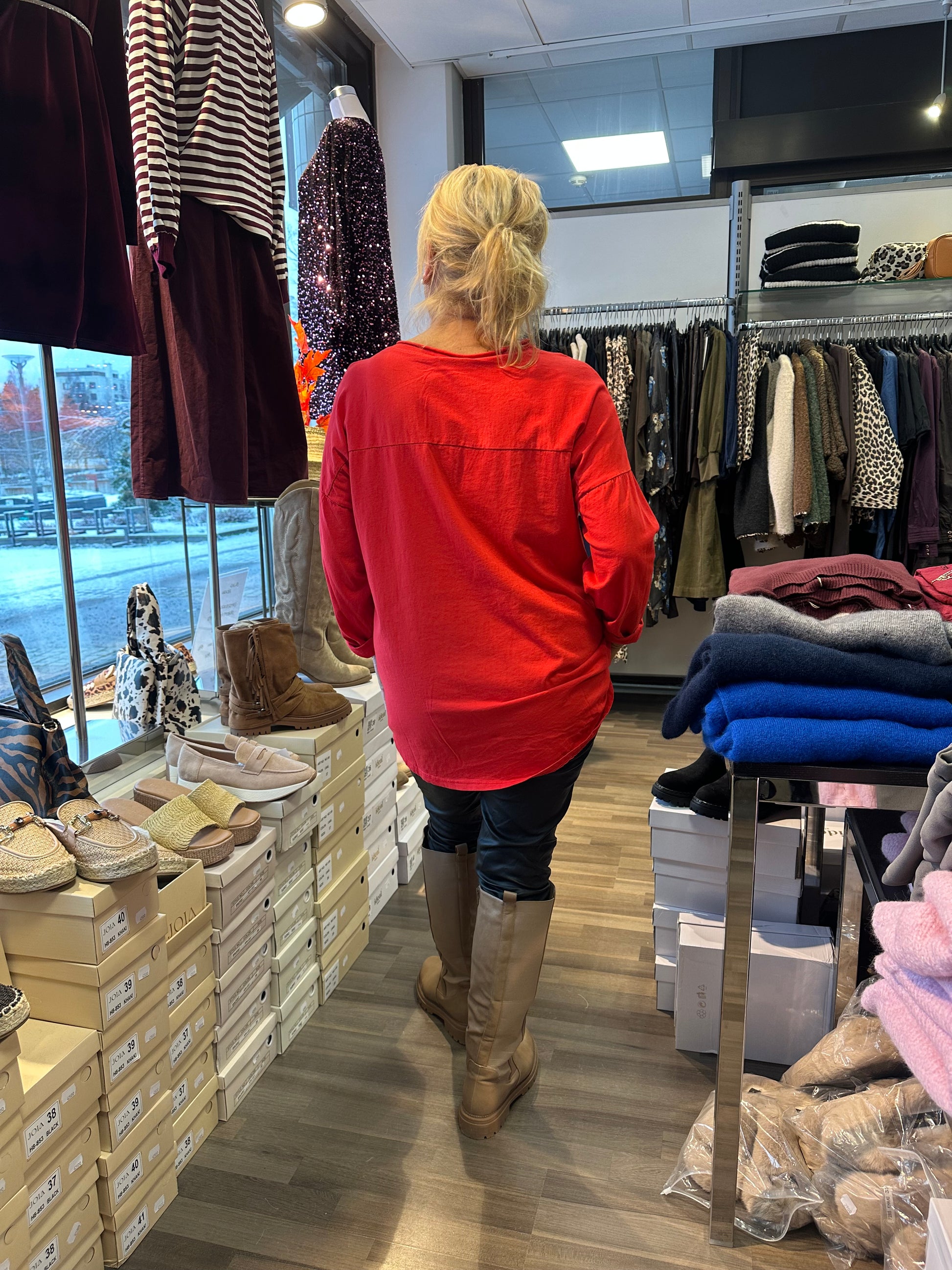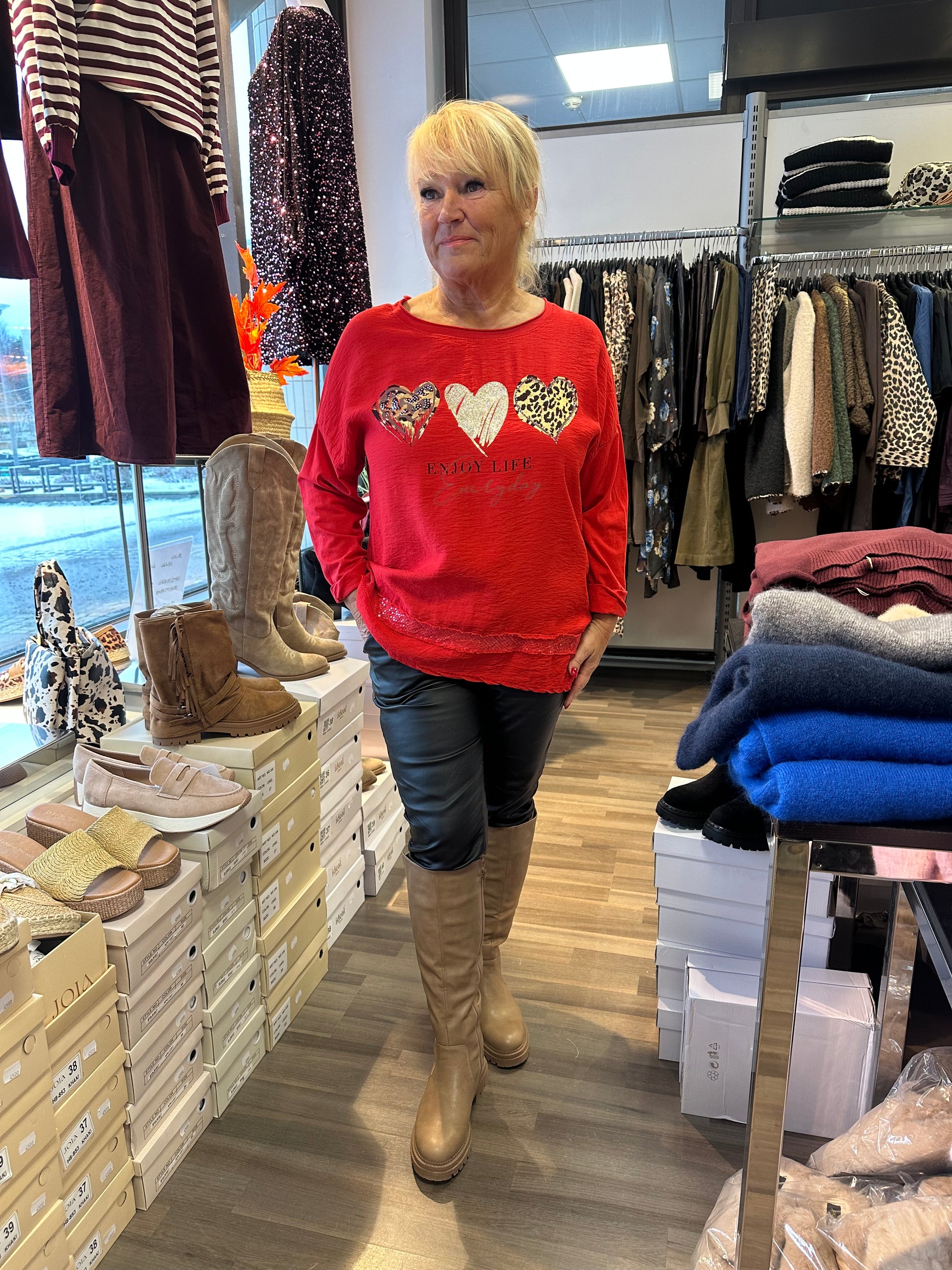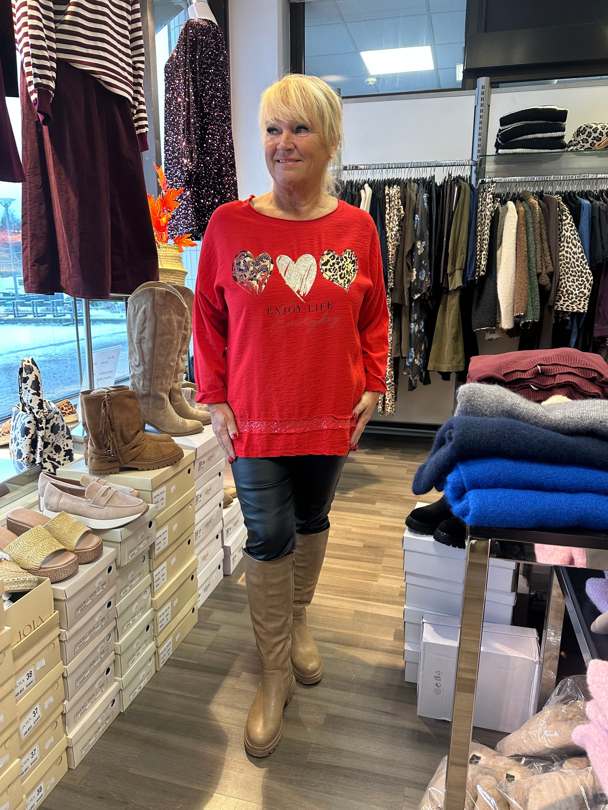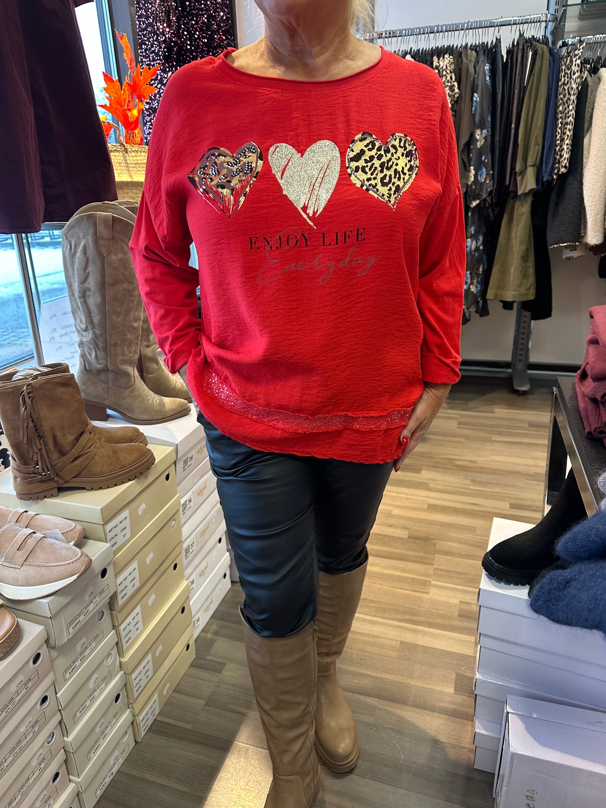 Joulupusero! Kivan kevyt viskoosi-puuvillapusero, jossa etuosa viskoosia ja joustavaa puuvillaa selkäosa. Edessä sydänkoristeita blingillä ja helmassa paljettikantti.
