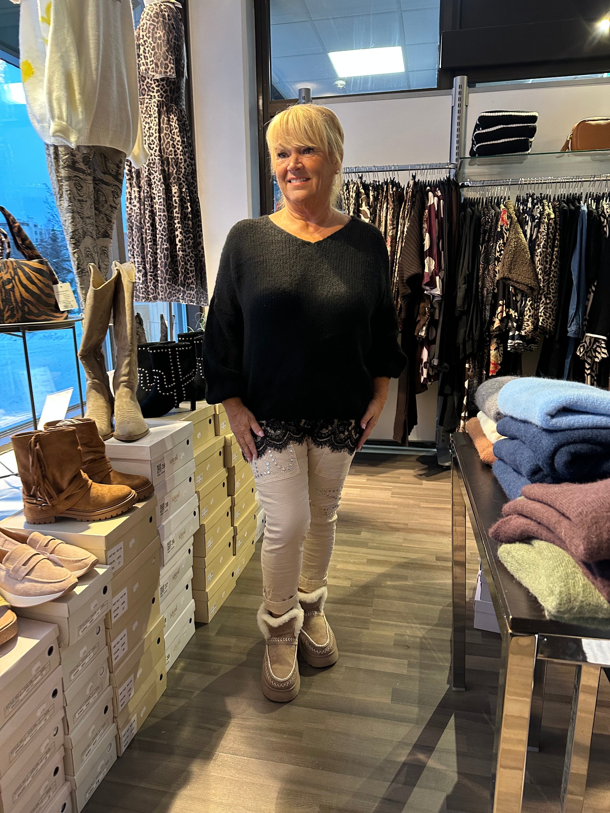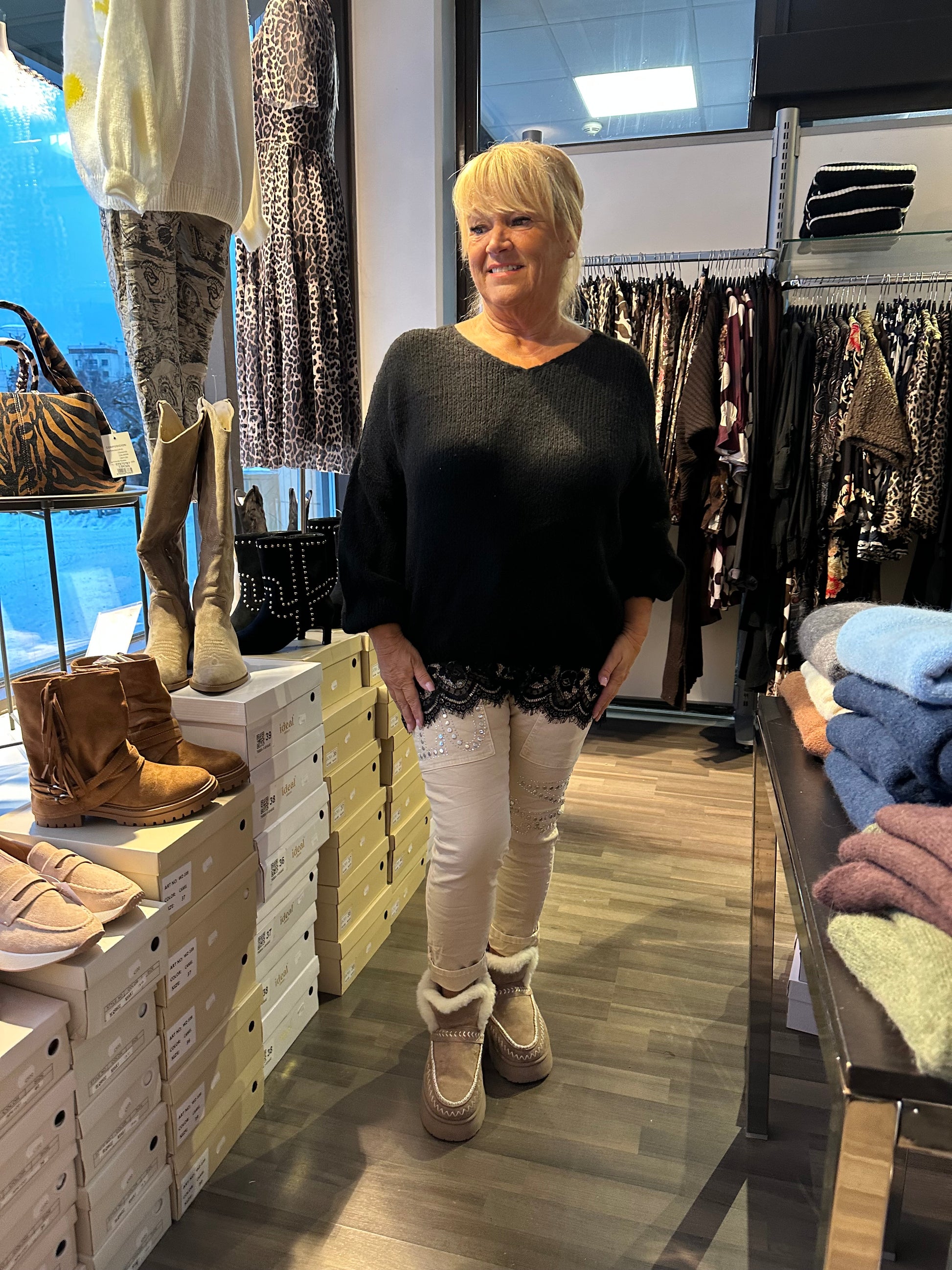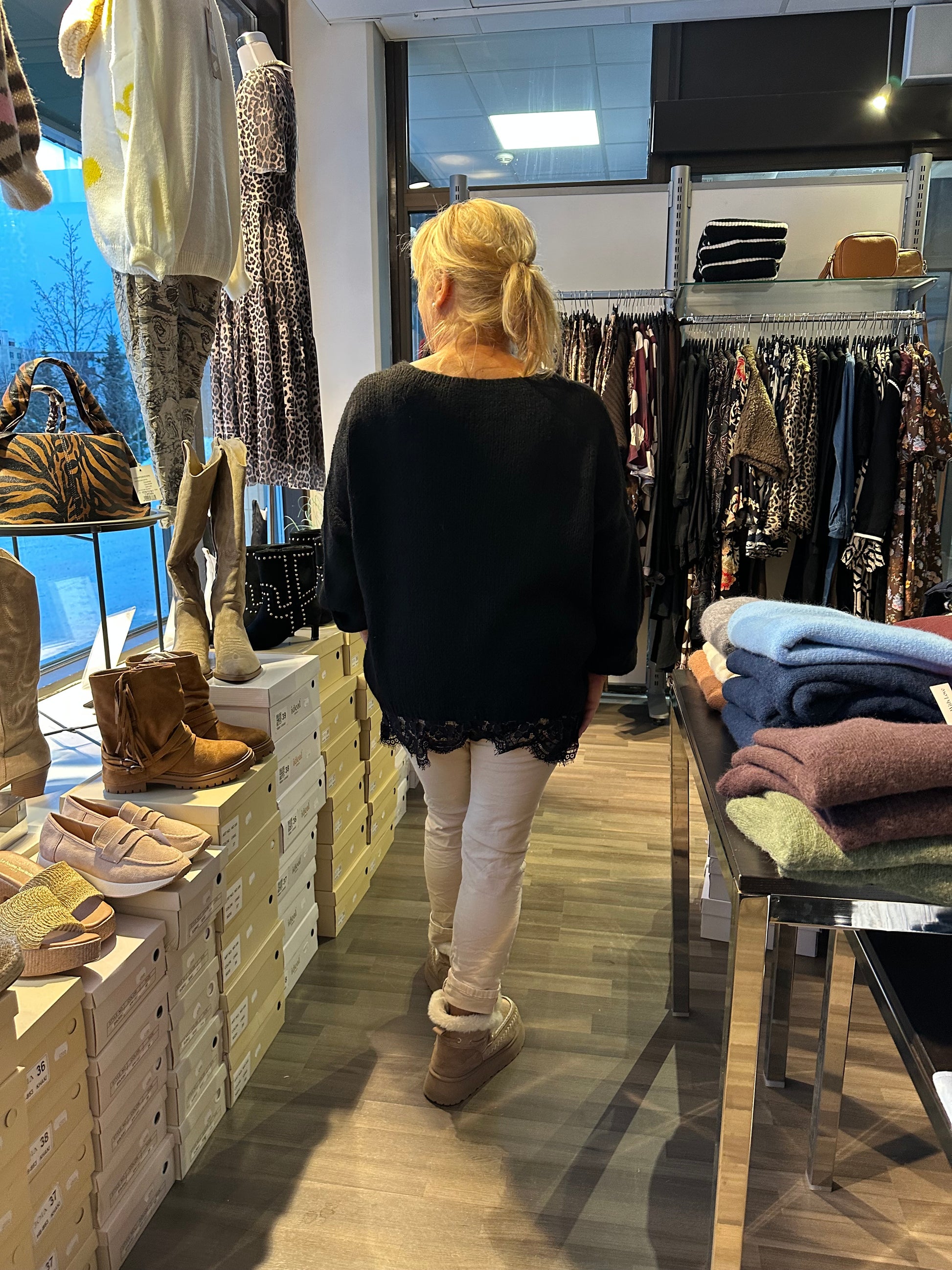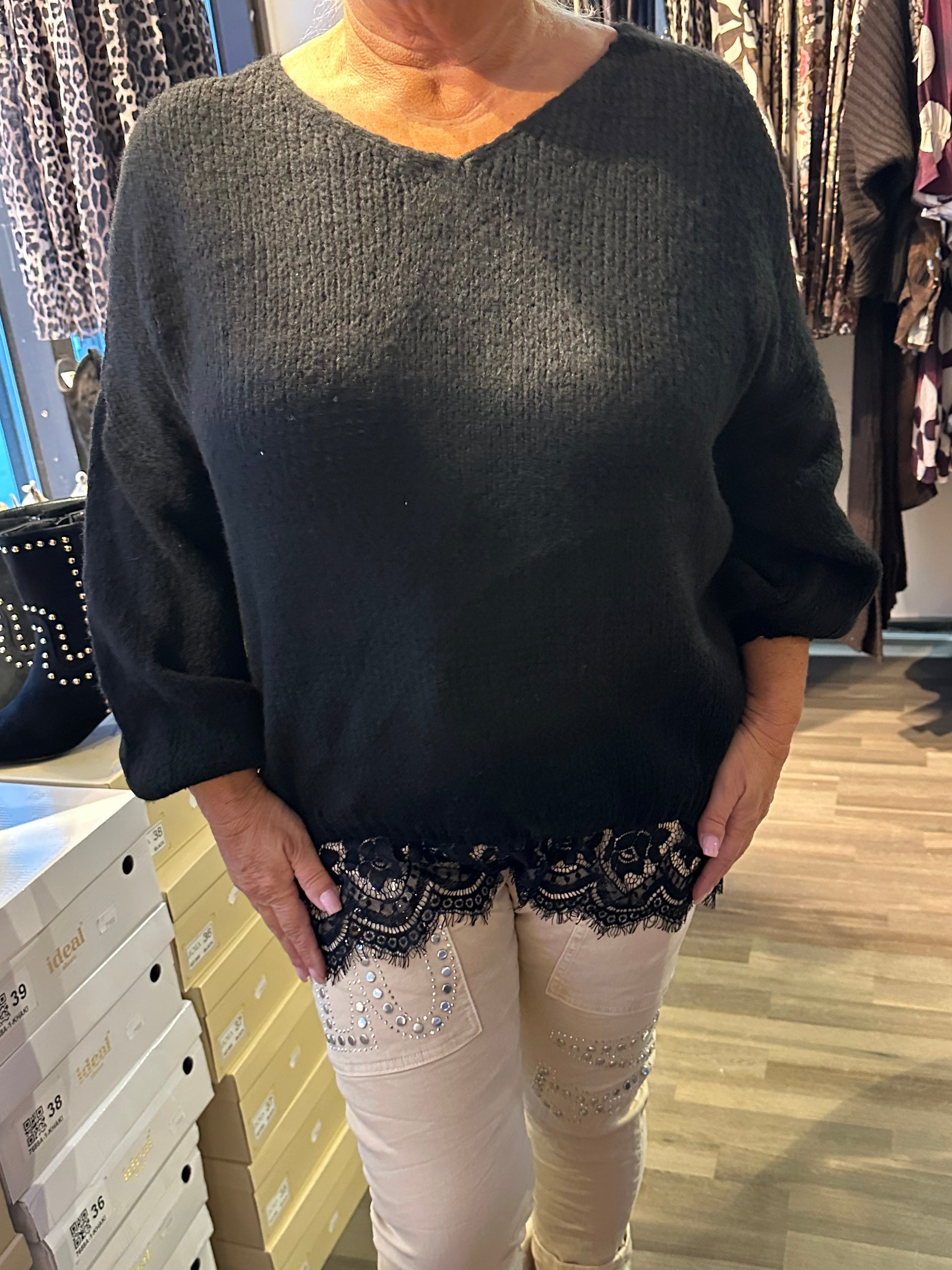 Kaunis pitsihelmainen neule oversize-mallissa.