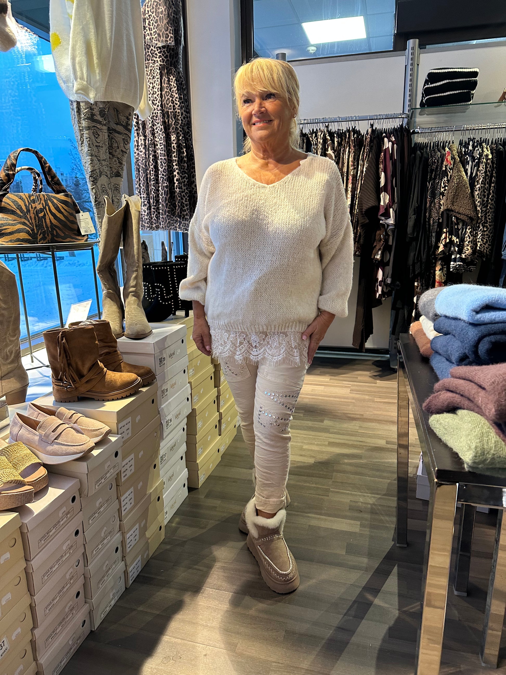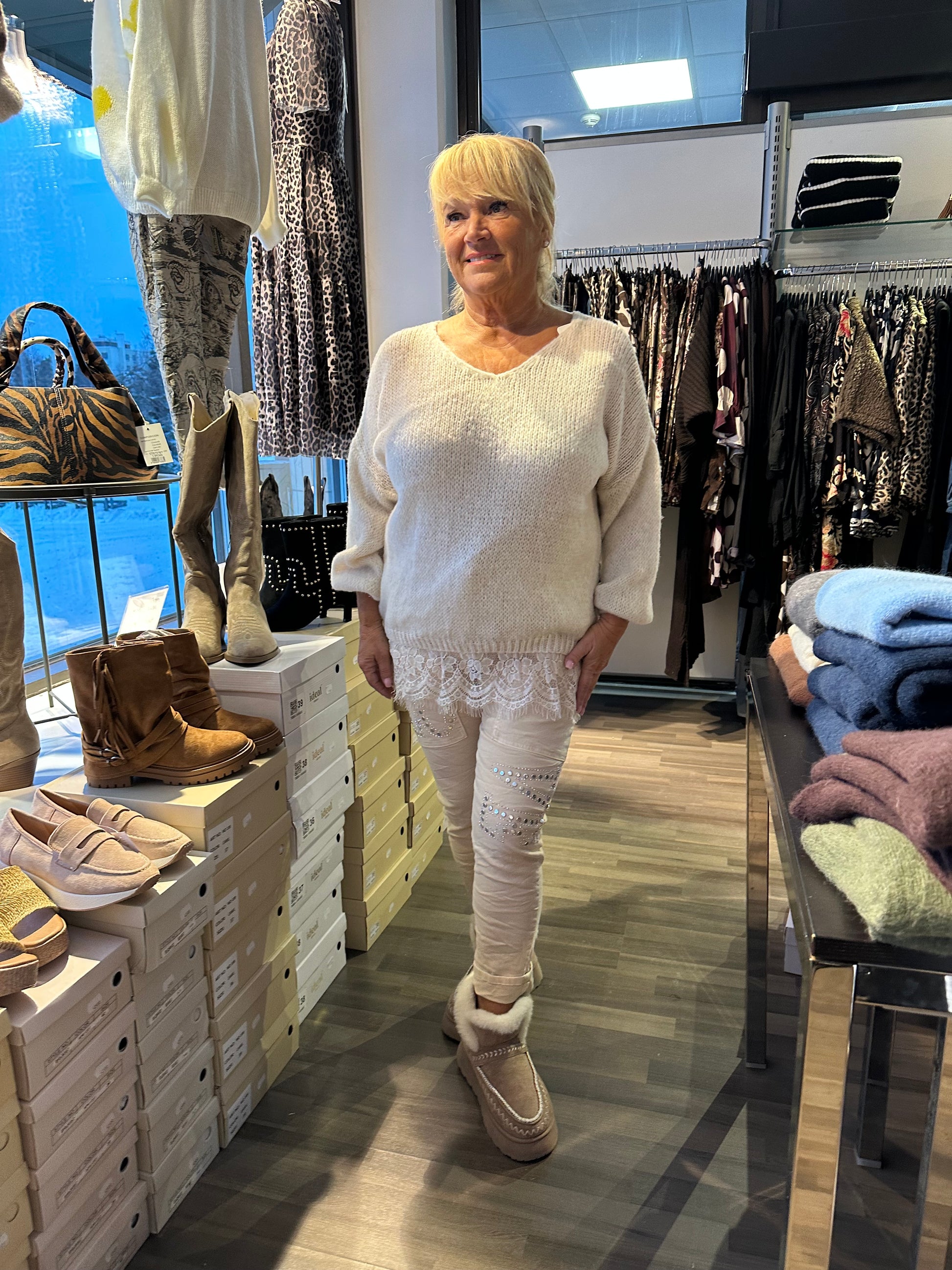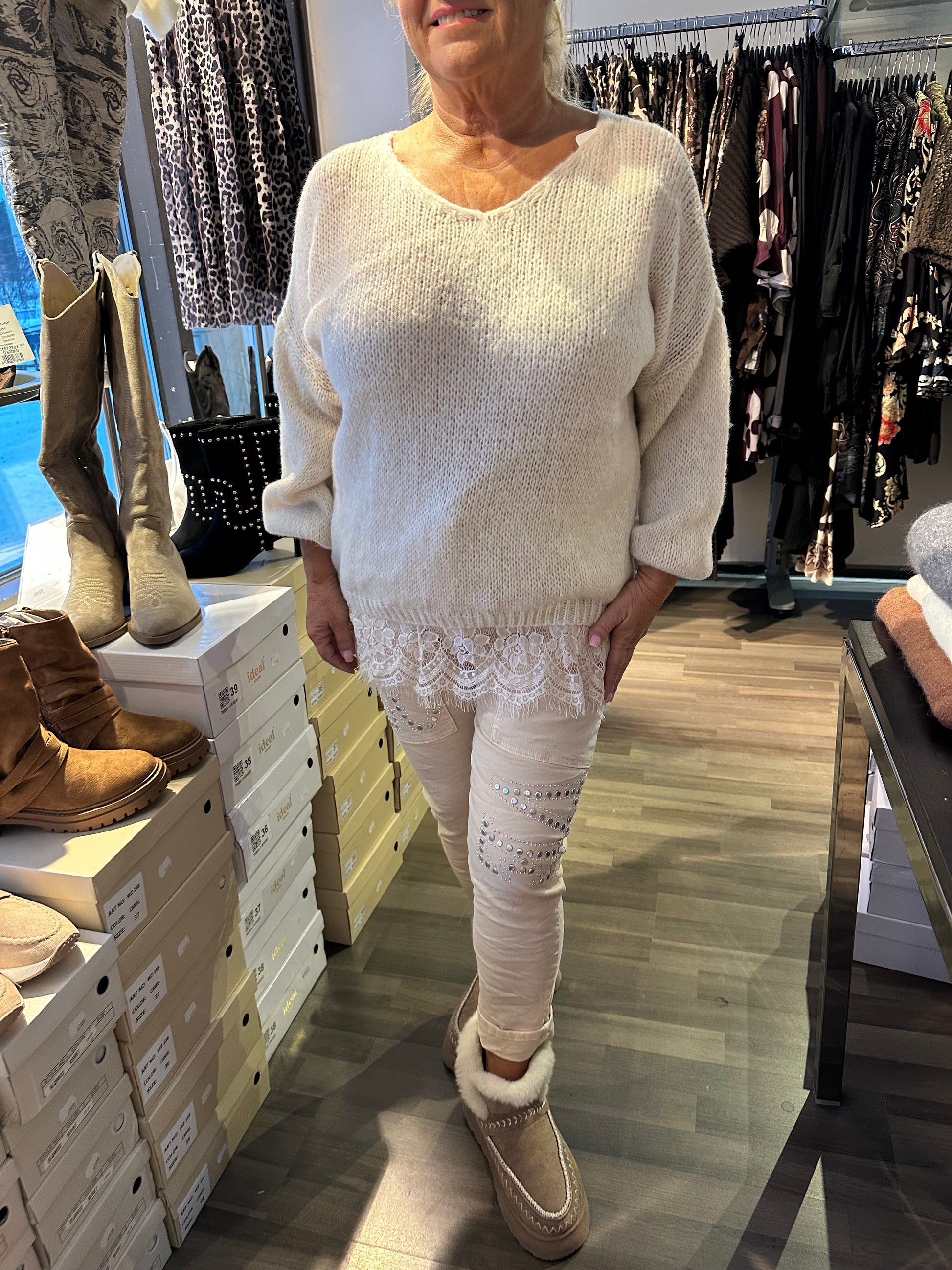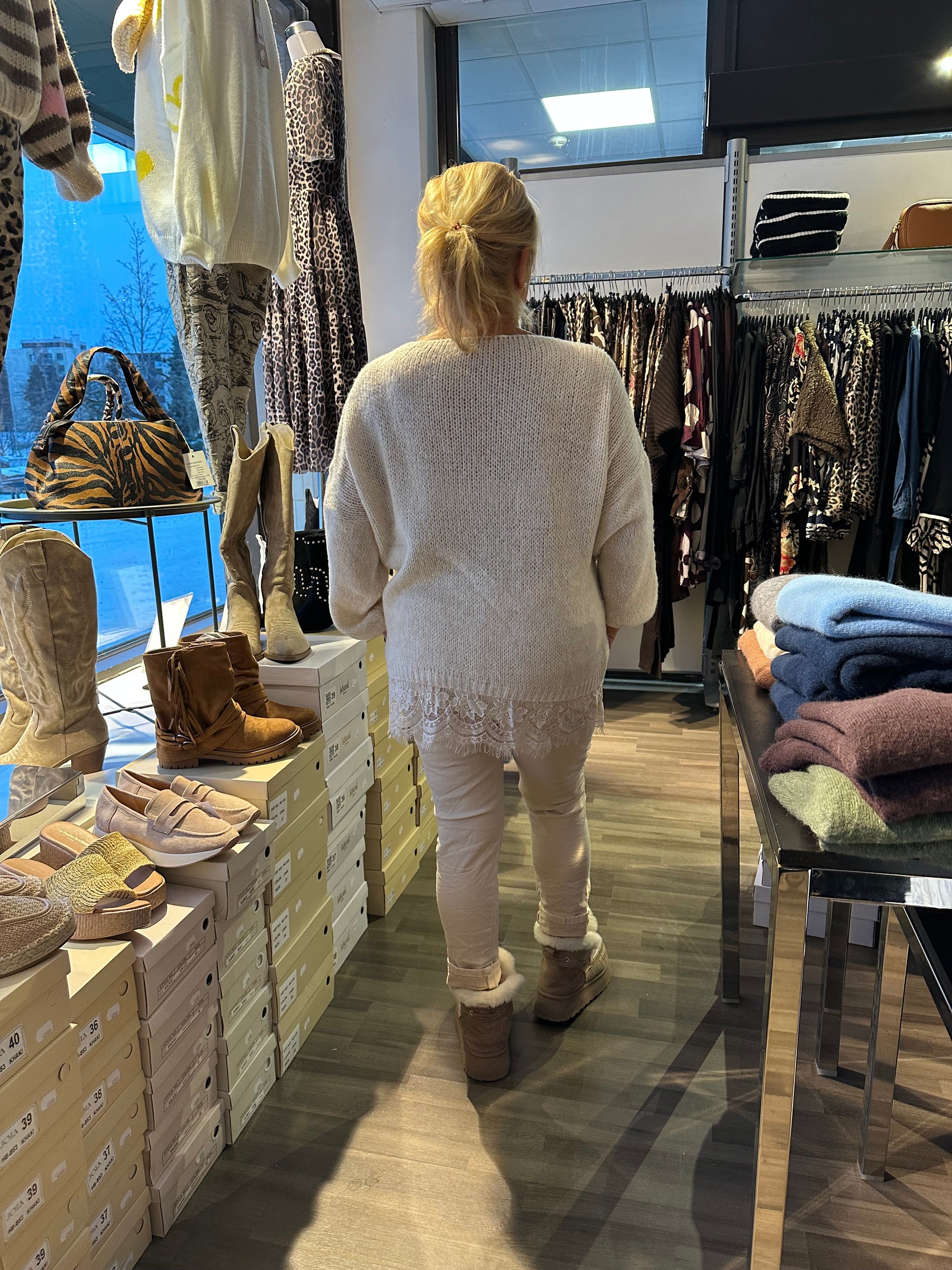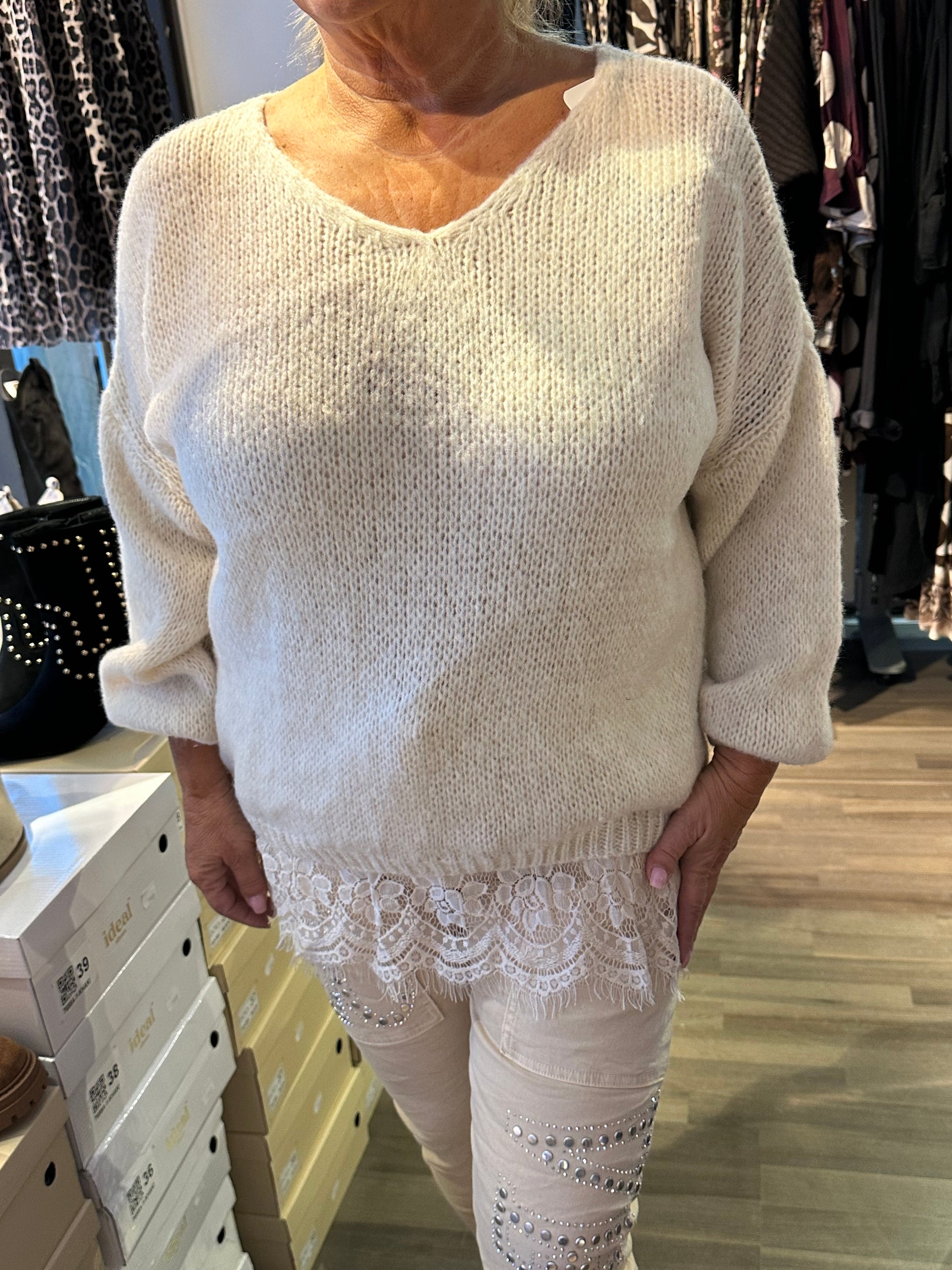 Kaunis pitsihelmainen neule oversize-mallissa.