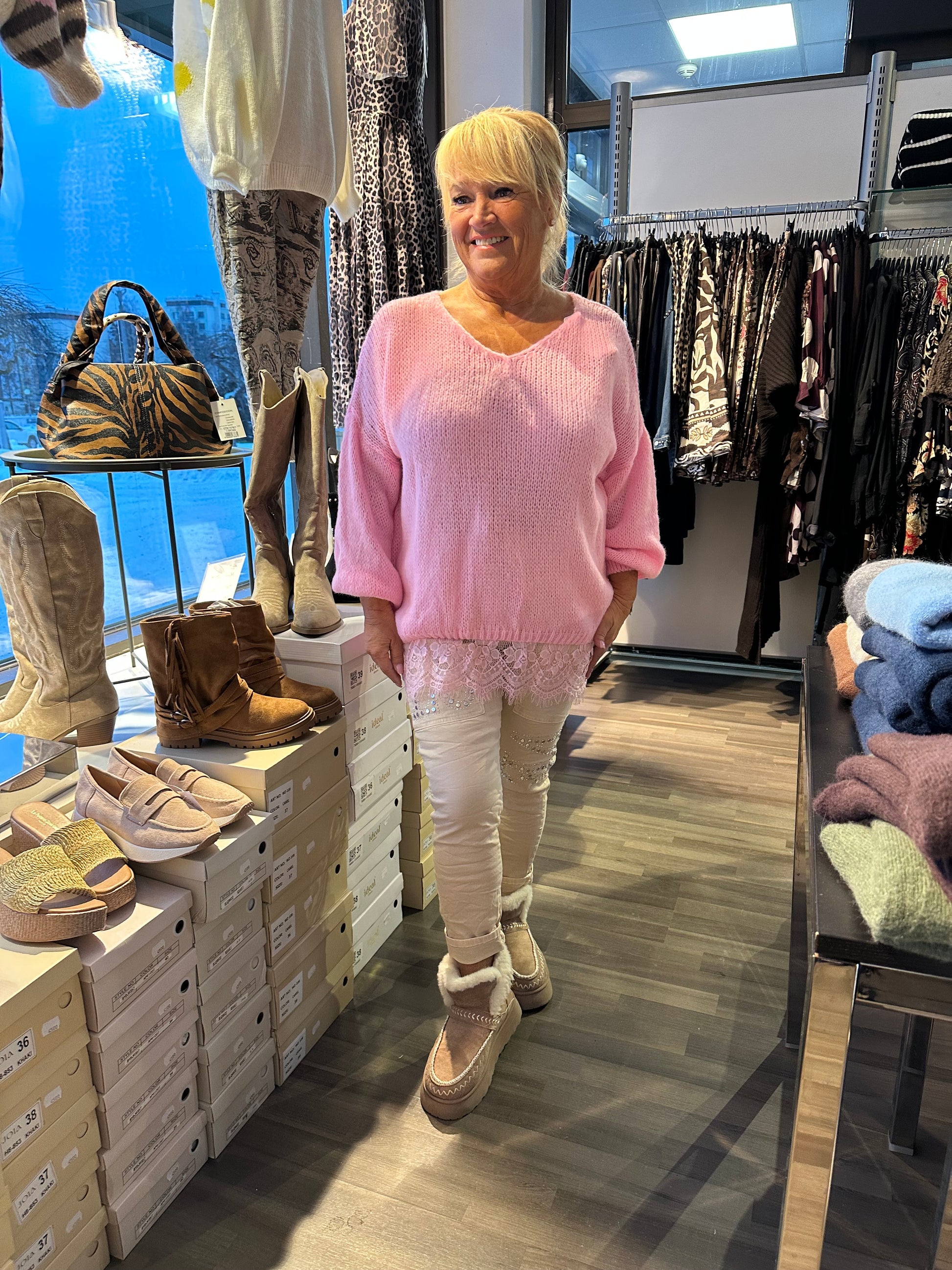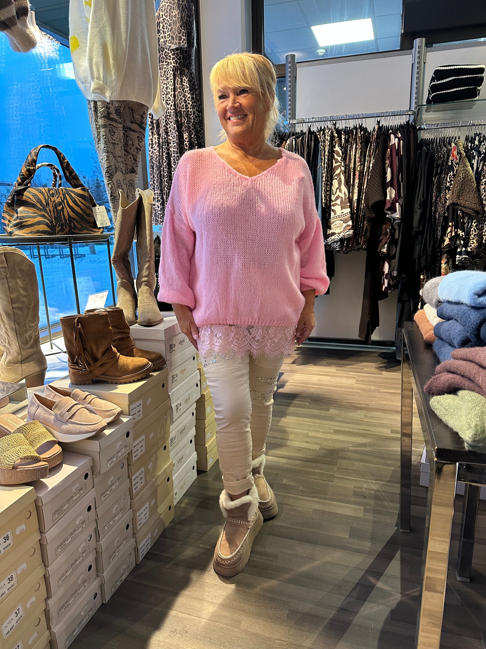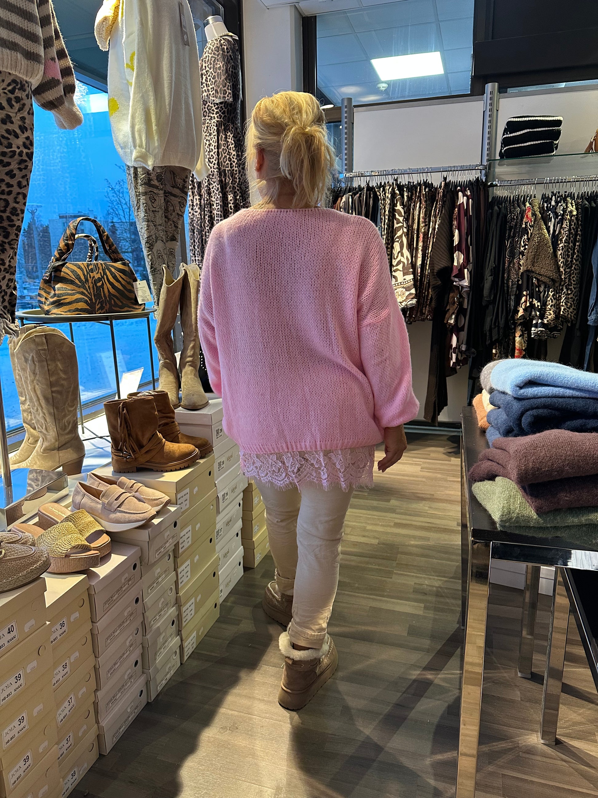 Kaunis pitsihelmainen neule oversize-mallissa.