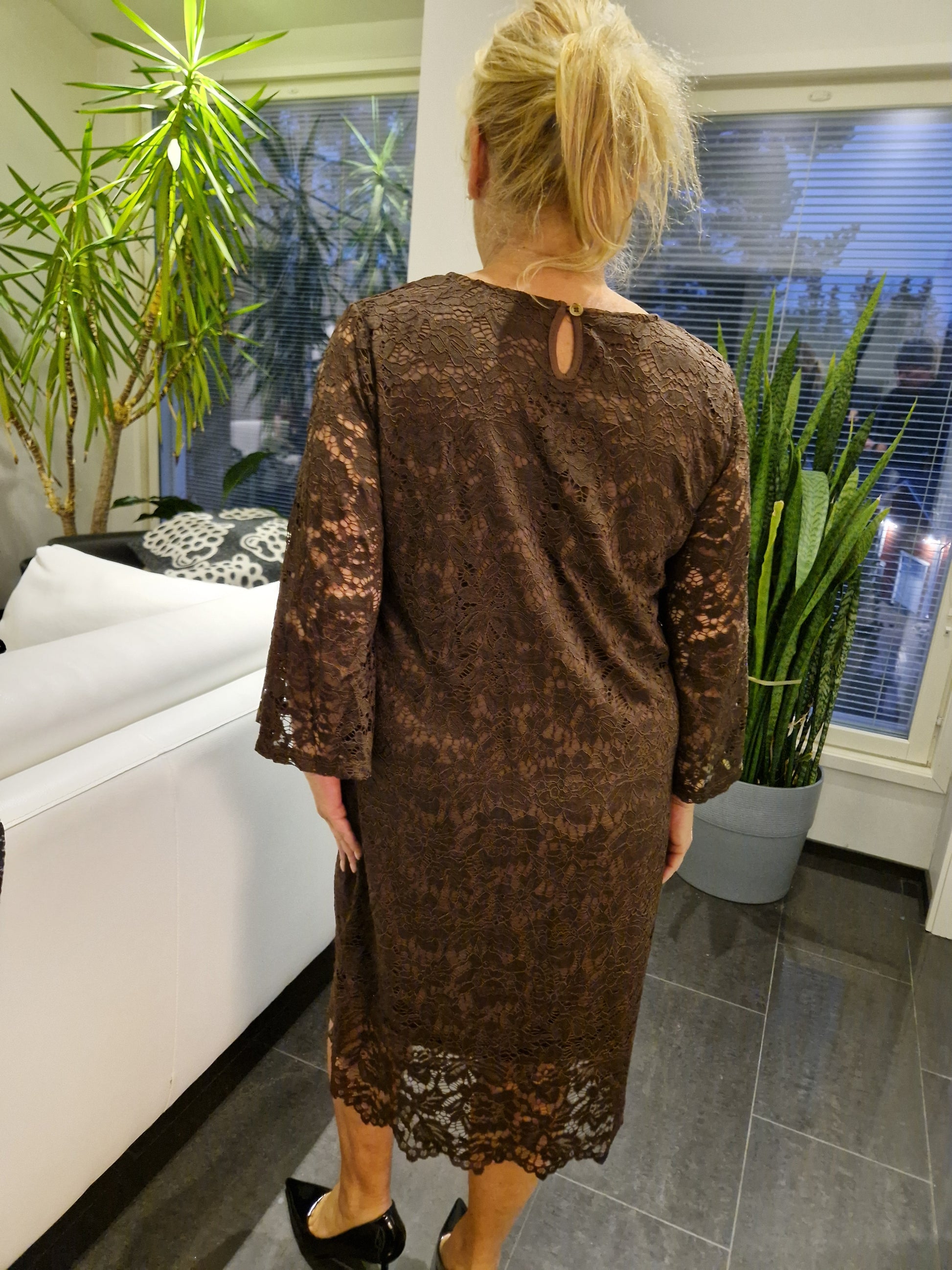 Pitsimekko, jossa vuori. Vuori ulottuu noin polveen ja helmaa keventää kun pitsi on alaosassa pelkästään eli jalat näkyy vähän läpi. Hihoissa ei myöskään vuorta. O-aukkoinen pääntie.