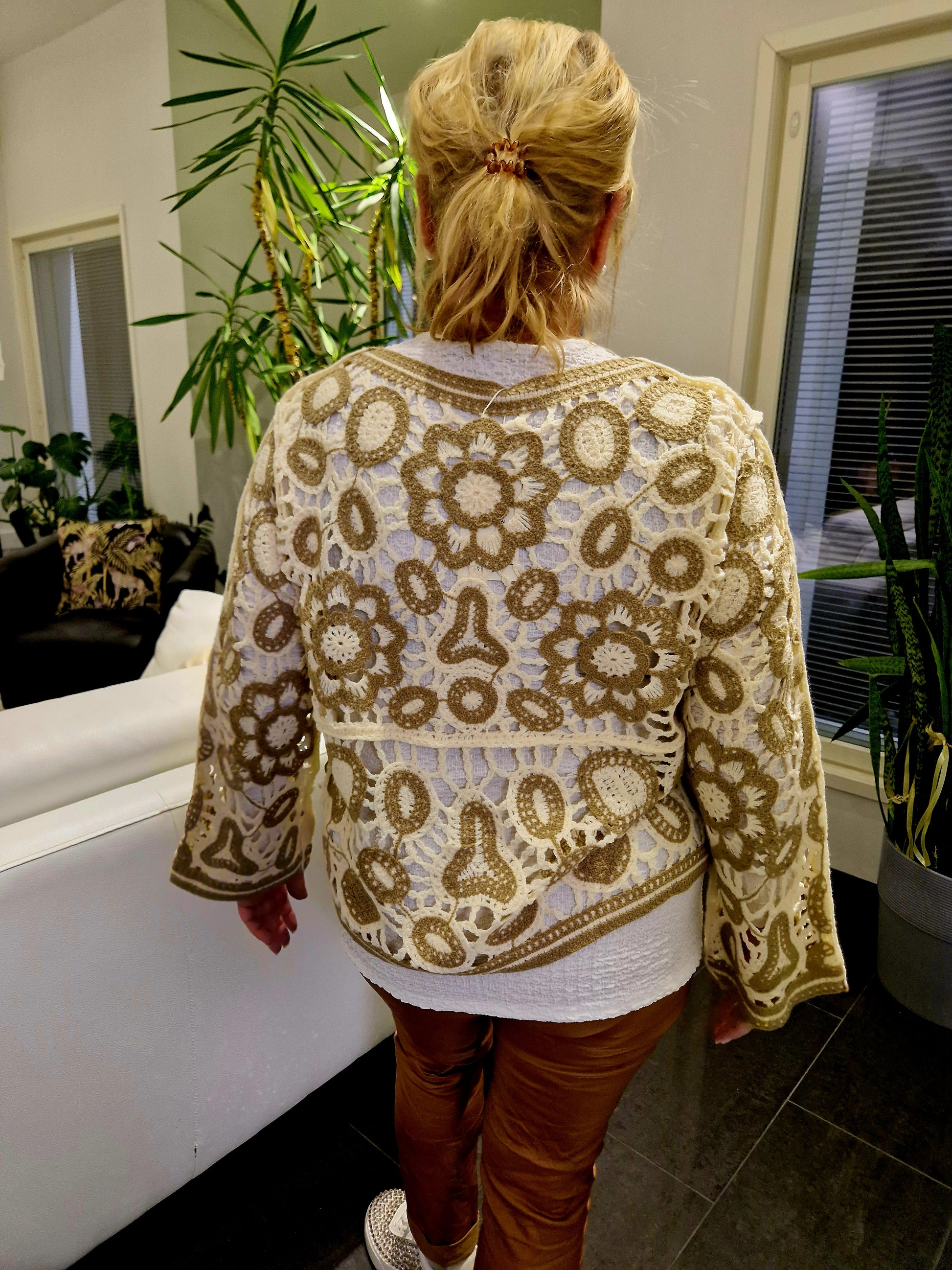 Virkattu, pitsikuvioitu reiällinen neule. Laaja v-aukkoinen pääntie, nappikiinnitys.